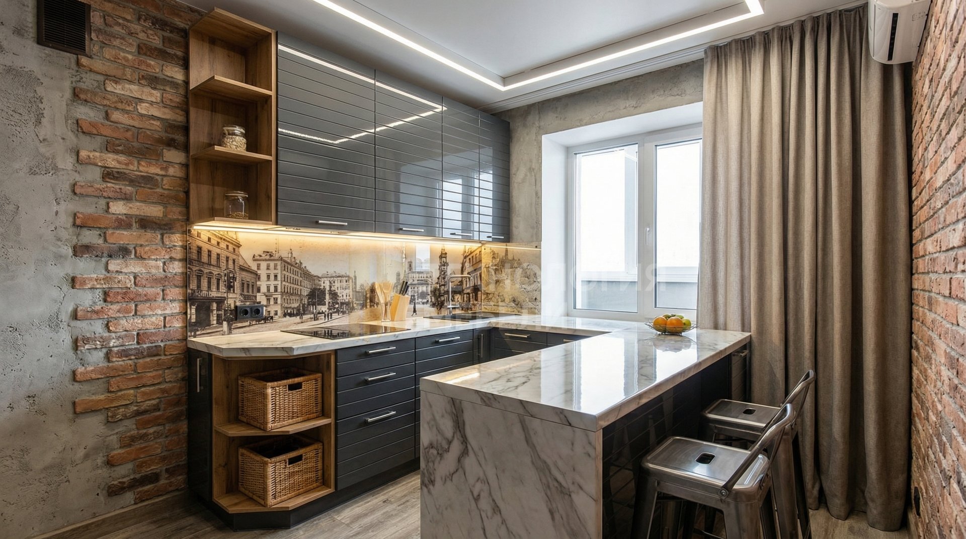 Чтобы визуально увеличить кухню длиной 1.8 м, наши дизайнеры используют проверенные приемы: