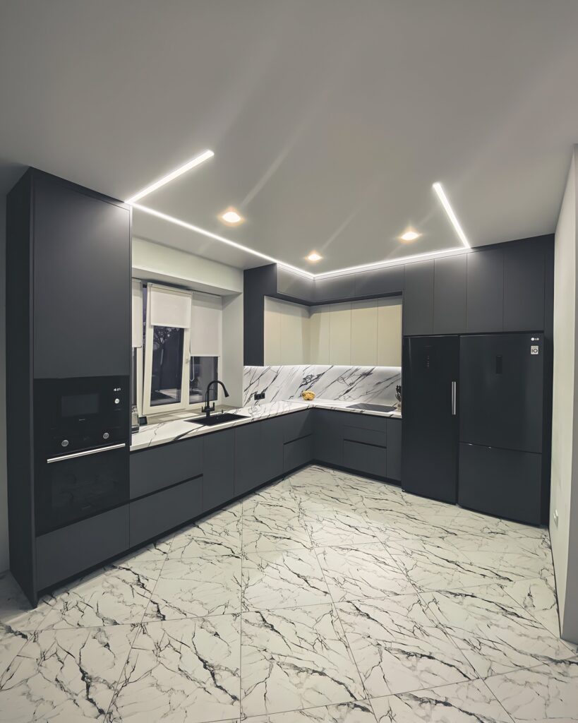 Для этого стиля чаще всего выбирают матовые фасады, эмаль, пластик, шпон, древесные декоры, графитовые или светлые поверхности, а также интегрированные ручки и минималистичную фурнитуру. Но подбор материалов всегда идёт от реальной нагрузки. Если кухня используется активно, покрытие должно быть стойким к загрязнениям, механическим касаниям и ежедневному уходу. Мы подбираем решения, в которых лаконичный внешний вид сочетается с практичностью и сроком службы.