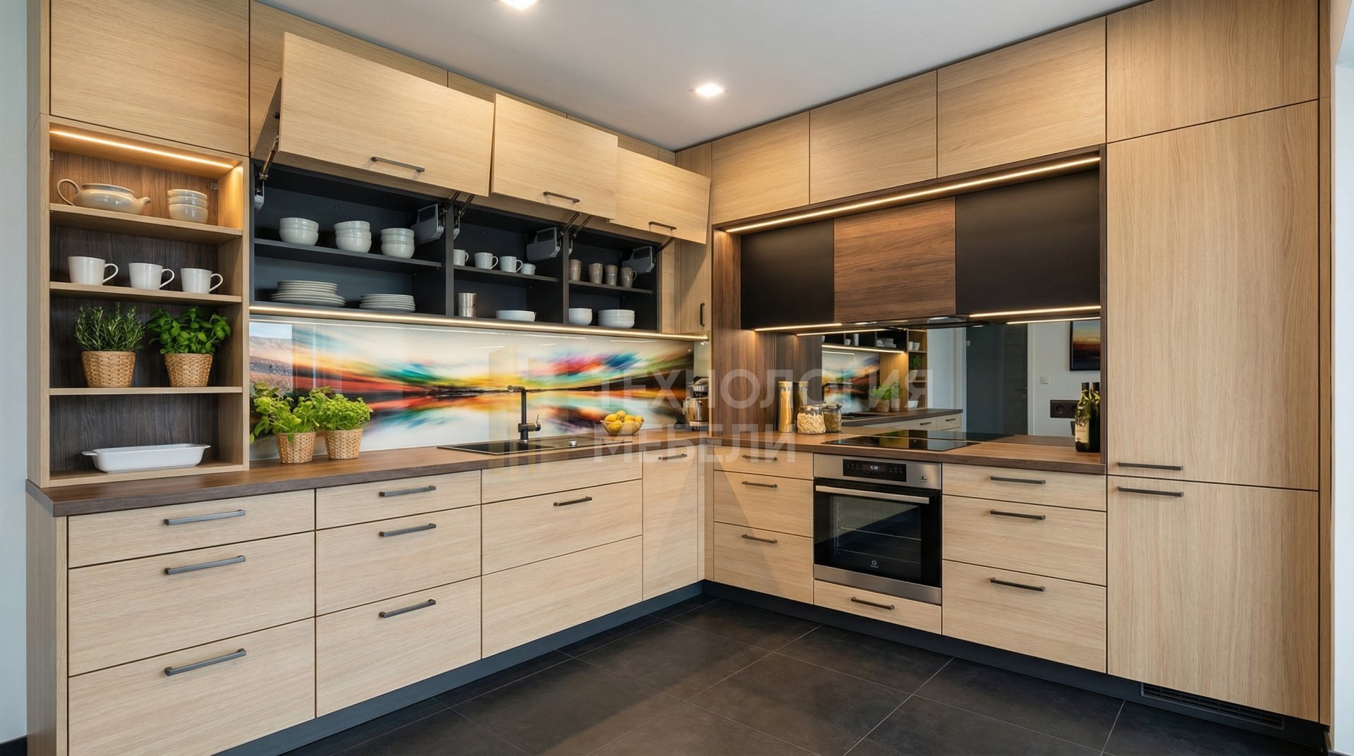 Даже на большой кухне важно не переутомиться. Мы проектируем пространство так, чтобы «рабочий треугольник» оставался компактным, несмотря на общие габариты гарнитура. Мы используем лучшую европейскую фурнитуру с электроприводами (открытие нажатием) и системы плавного закрывания, рассчитанные на тяжелые фасады.