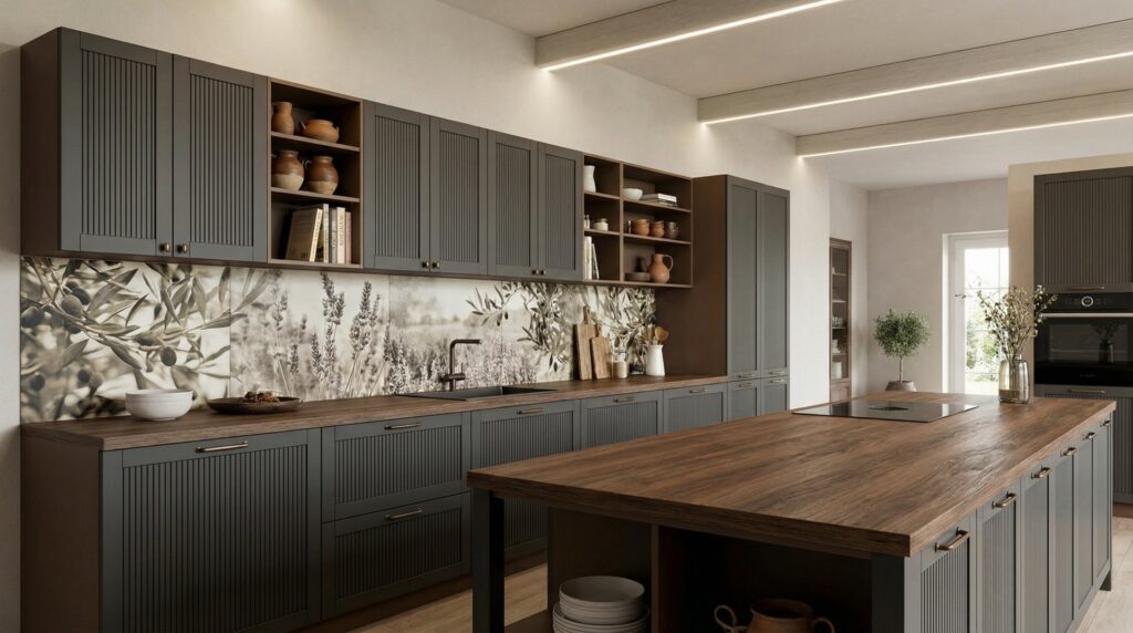 Индивидуальный проект нужен ещё и потому, что прованс плохо сочетается с визуальными компромиссами. Лишние доборы, случайные зазоры, неудобная техника или неудачные по размеру пеналы сразу портят впечатление. При проектировании можно заранее решить, сколько будет открытых секций, нужны ли витрины, какой оттенок фасадов подойдёт помещению, насколько выразительным должен быть декор. В результате кухня получается целостной и не выглядит стилизацией «для картинки».