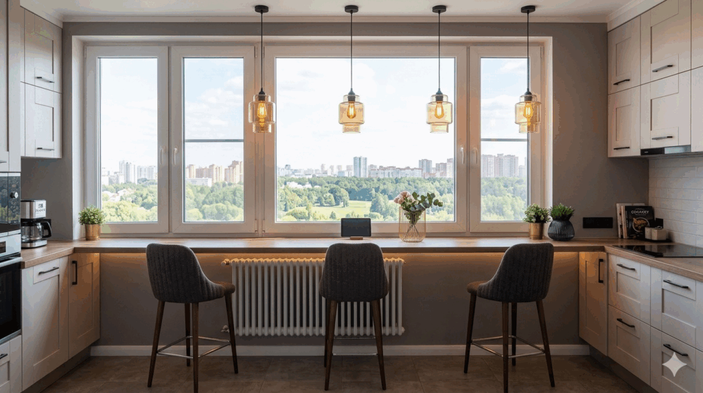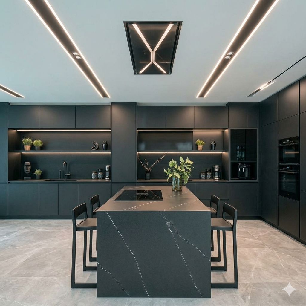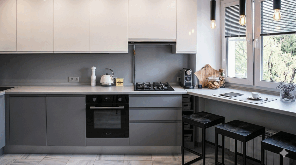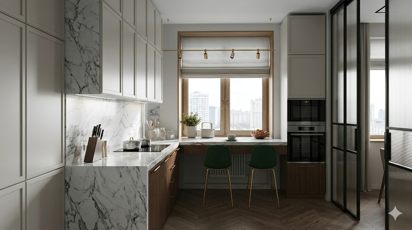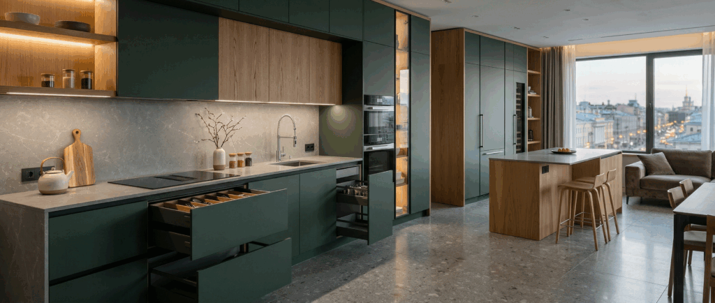 Решение: Мы внедрили систему «умных» лифтов для верхних шкафов и спроектировали закрытый гараж для бытовых приборов с выкатными полками. Основную рабочую зону освободили от лишних предметов, перенеся розетки в скрытые лючки.