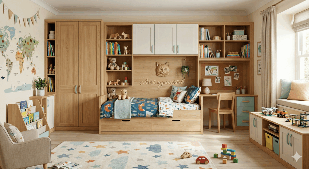 Решение: Разработали многофункциональный мебельный комплекс, где кровать интегрирована с системой хранения. Рабочий стол отделили от игровой зоны стеллажом-перегородкой, который пропускает свет, но создает четкую границу между «делом» и «весельем».