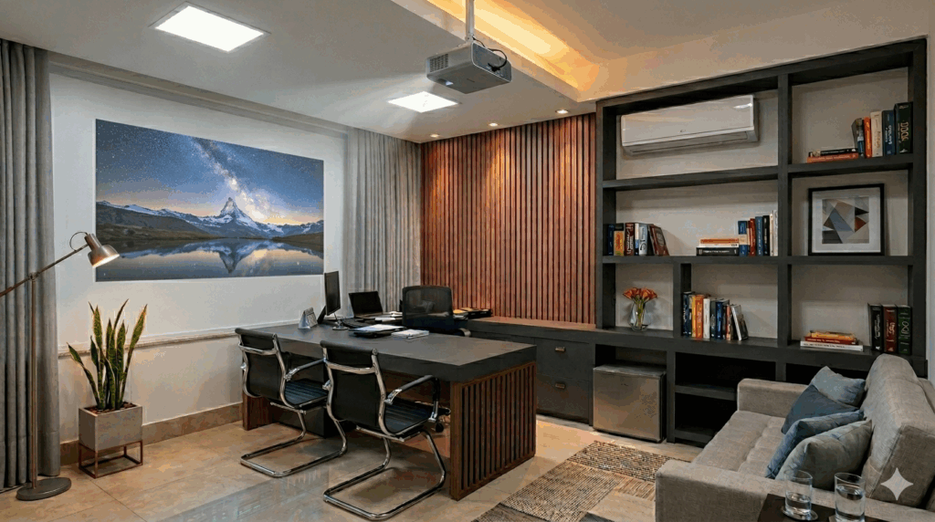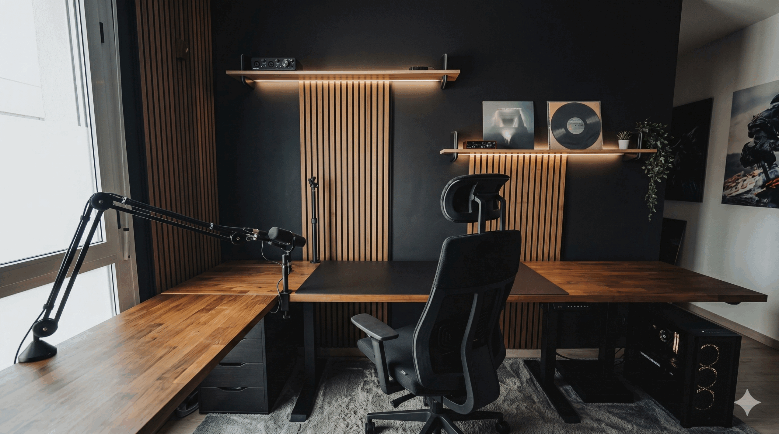 Решение: Установили эргономичный стол с регулировкой высоты, позволяющий работать как сидя, так и стоя. Всю проводку интегрировали в кабель-менеджмент внутри столешницы, а над рабочей зоной разместили направленный свет с регулируемой теплотой.