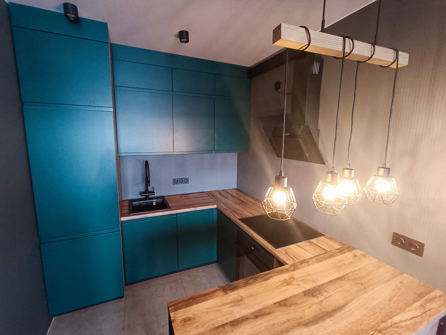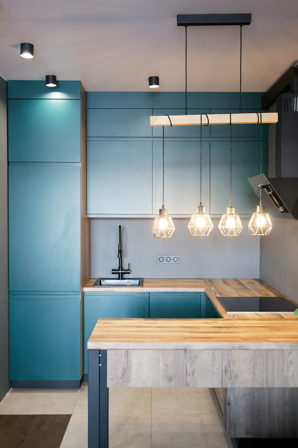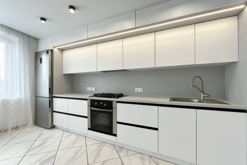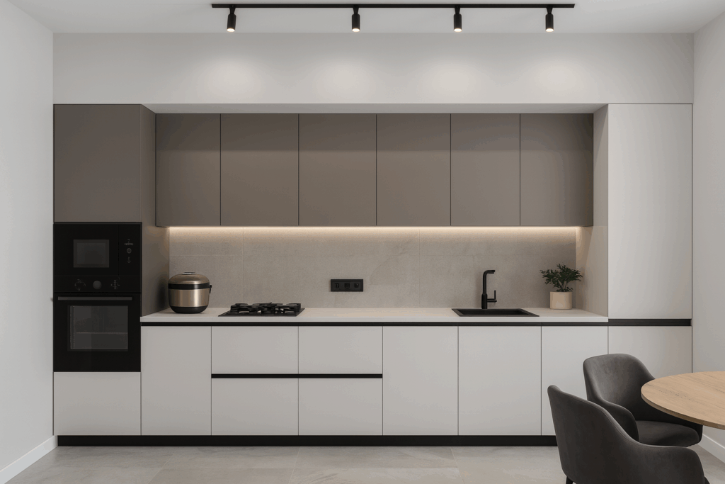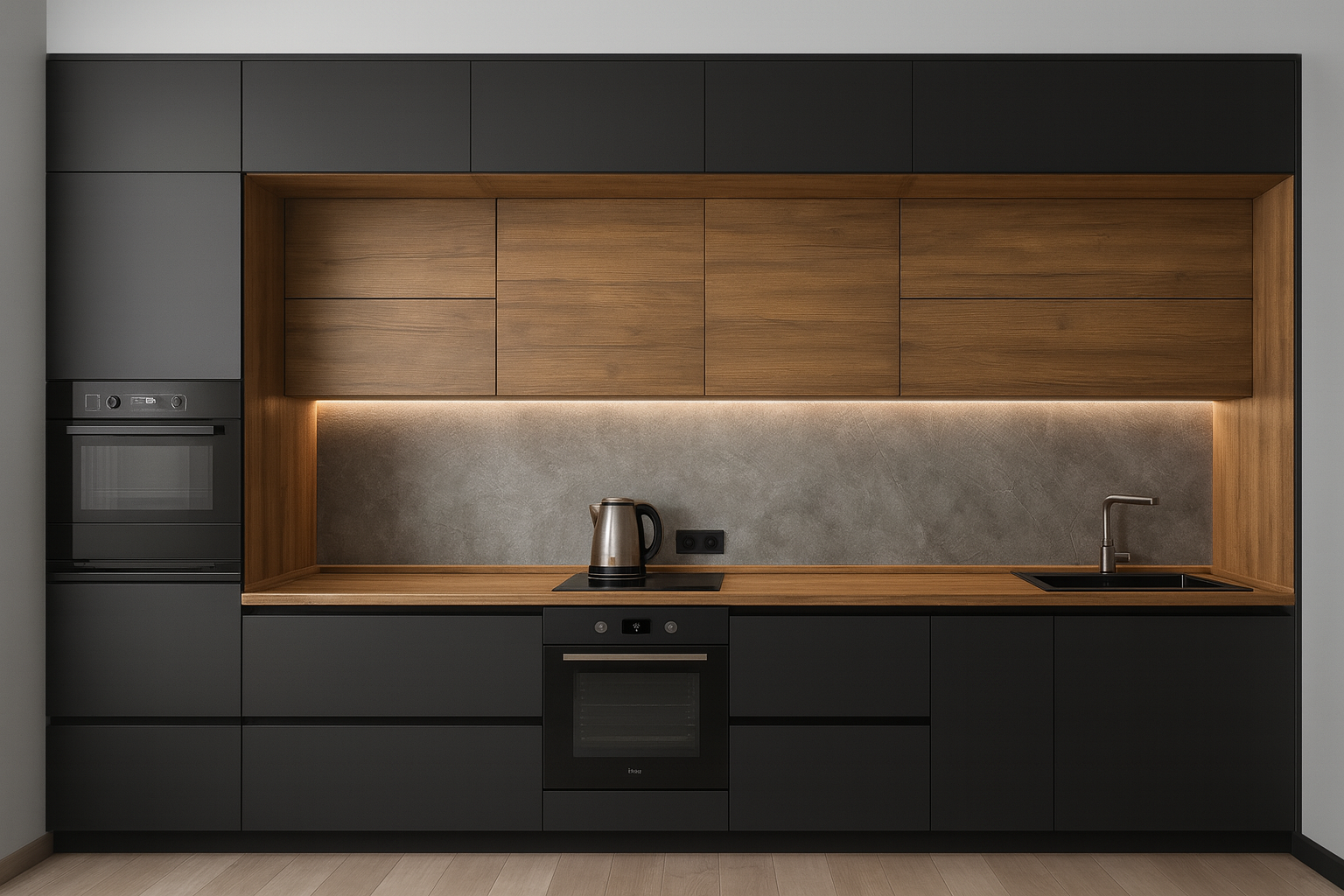 Решение: выбрана U-образная планировка, добавлены глубокие системы хранения, барная консоль, контрастные фасады и продуманное освещение, усиливающее стиль и удобство.