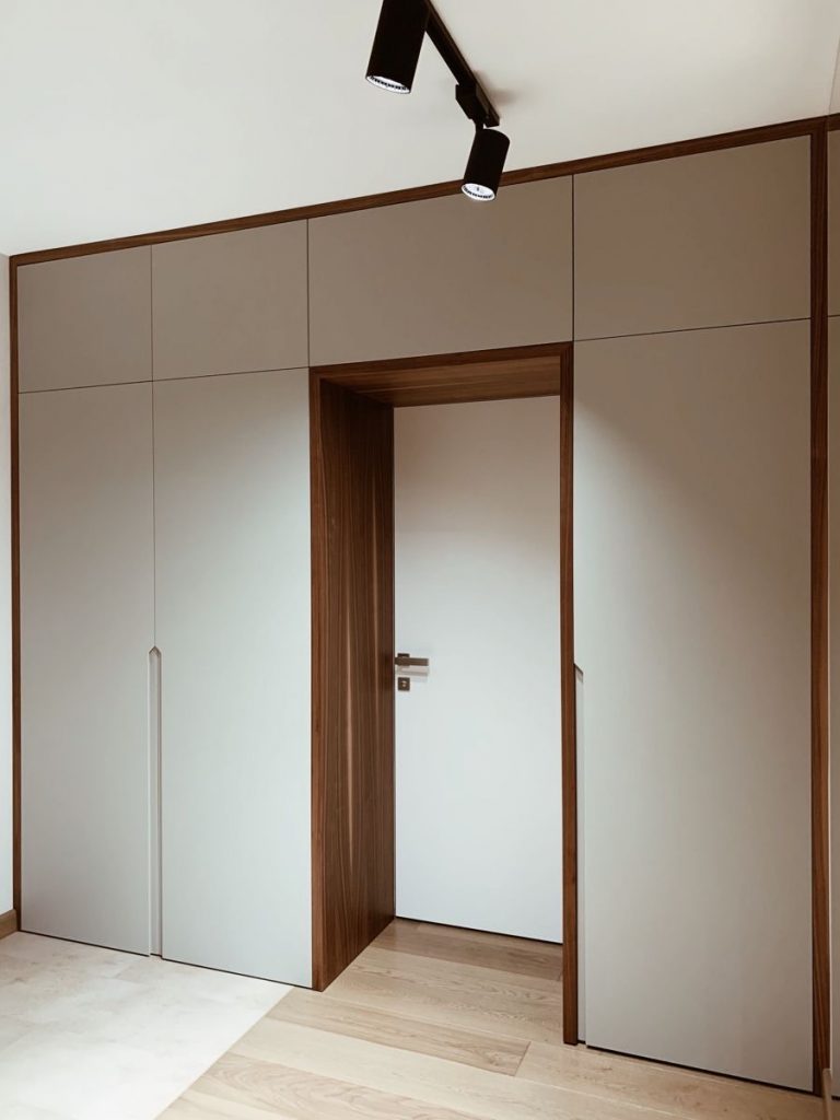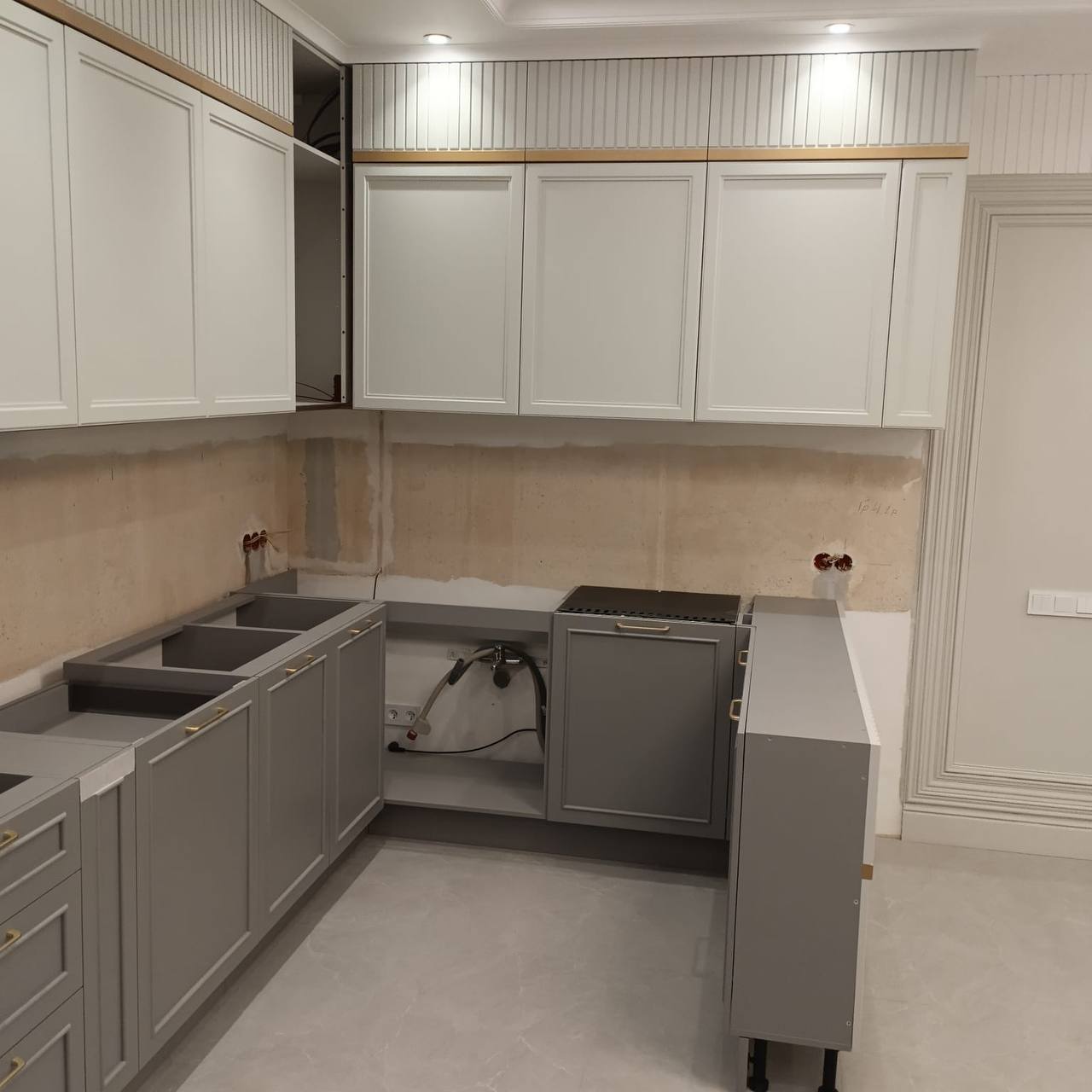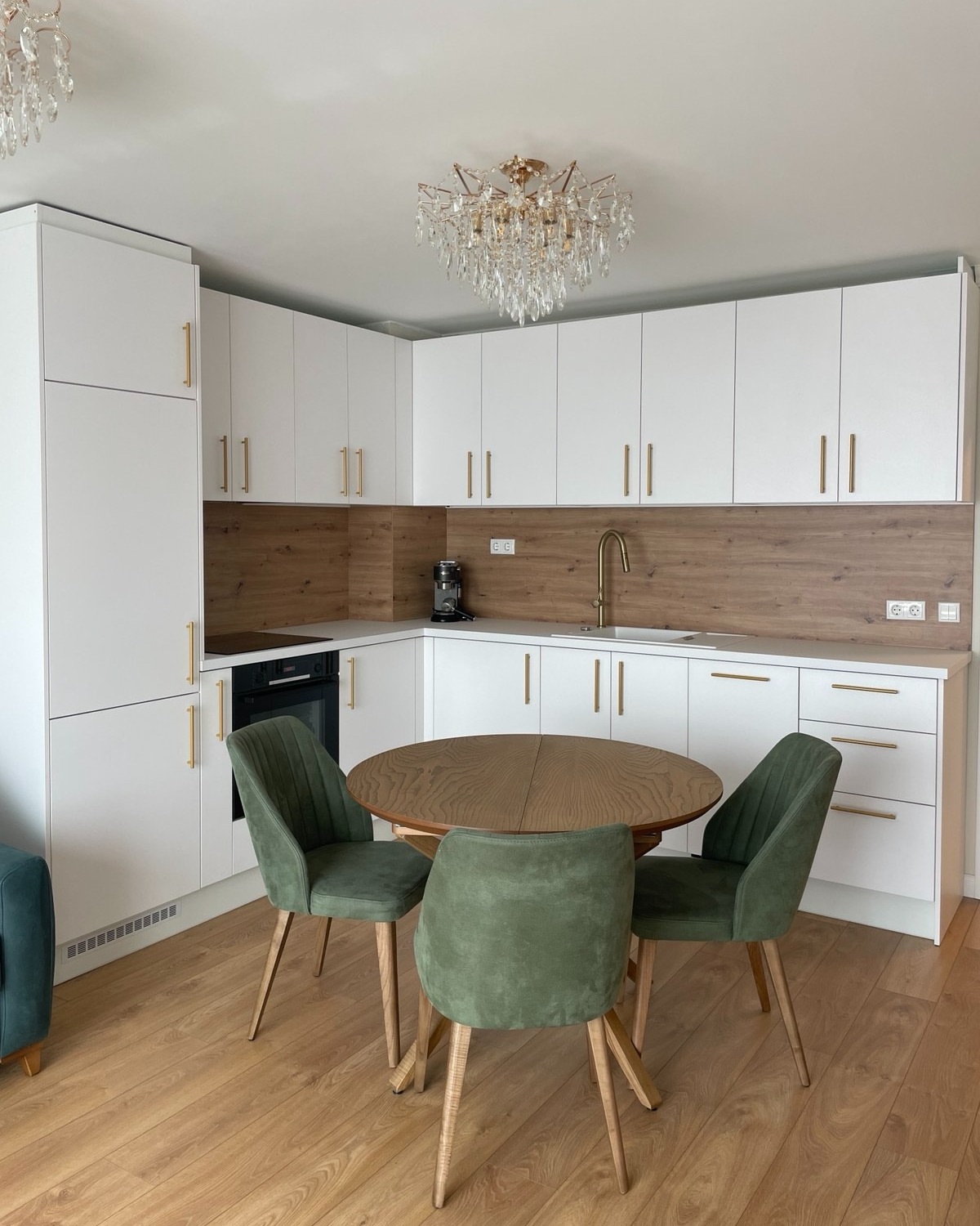 Решение: L-образная светлая стильная кухня с акцентами дерева и золота, высокими шкафами и вытянутыми модулями, обеспечившими вместительность и визуальную лёгкость.