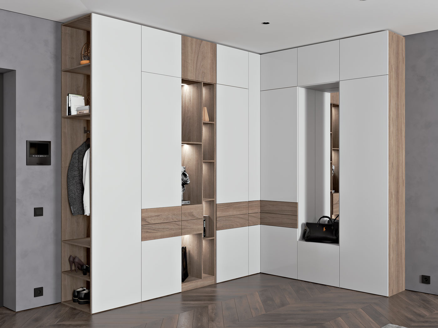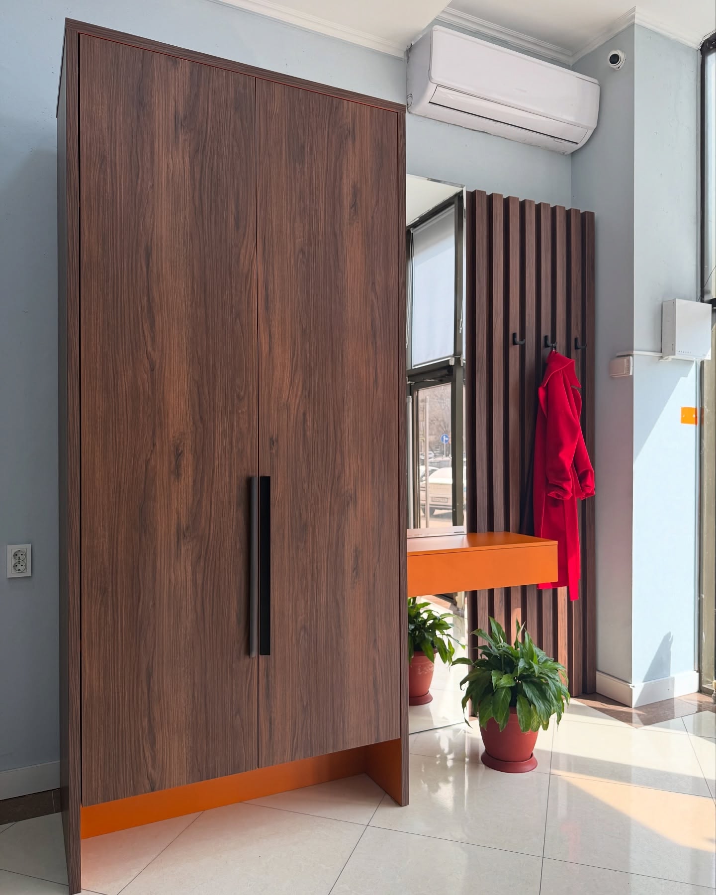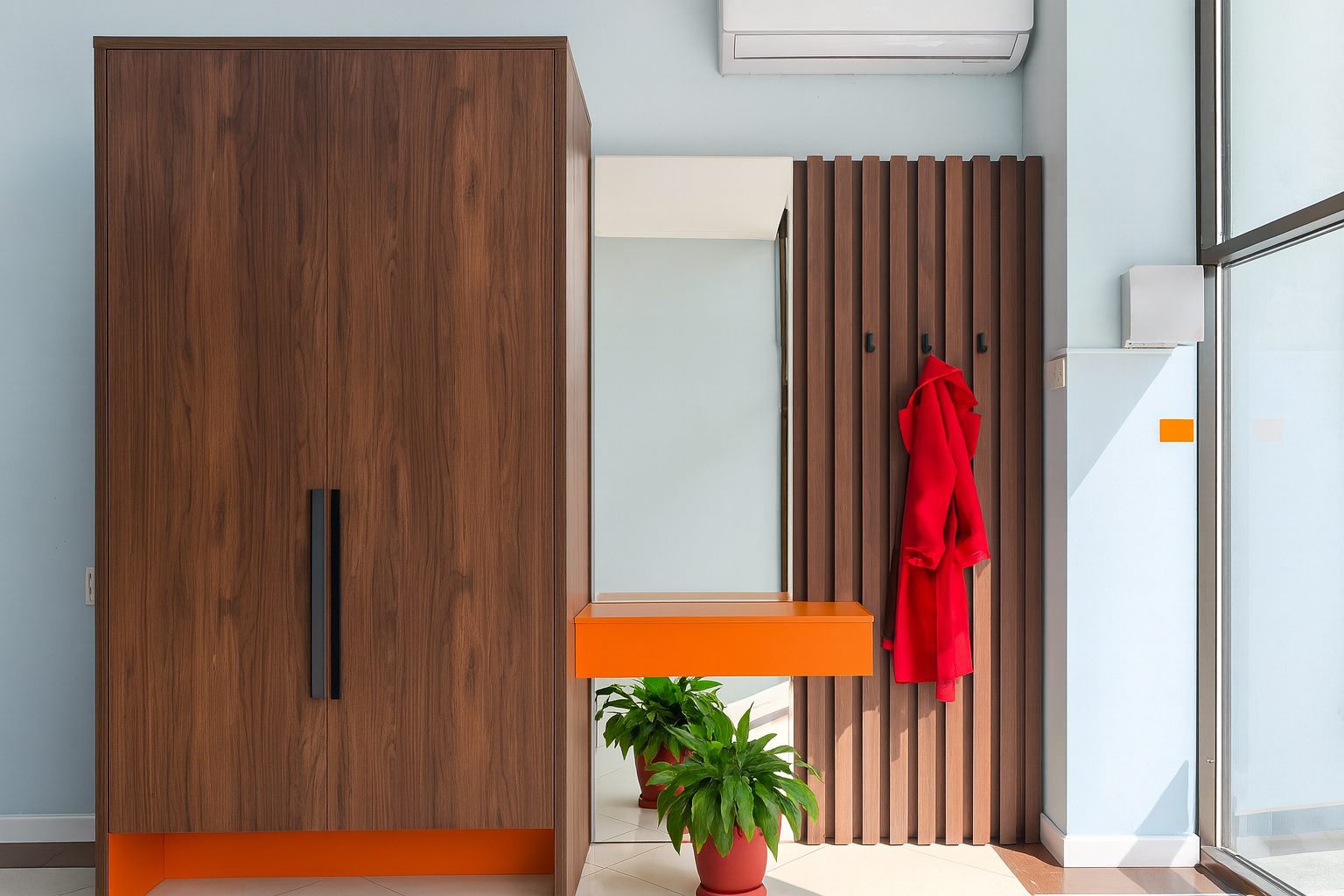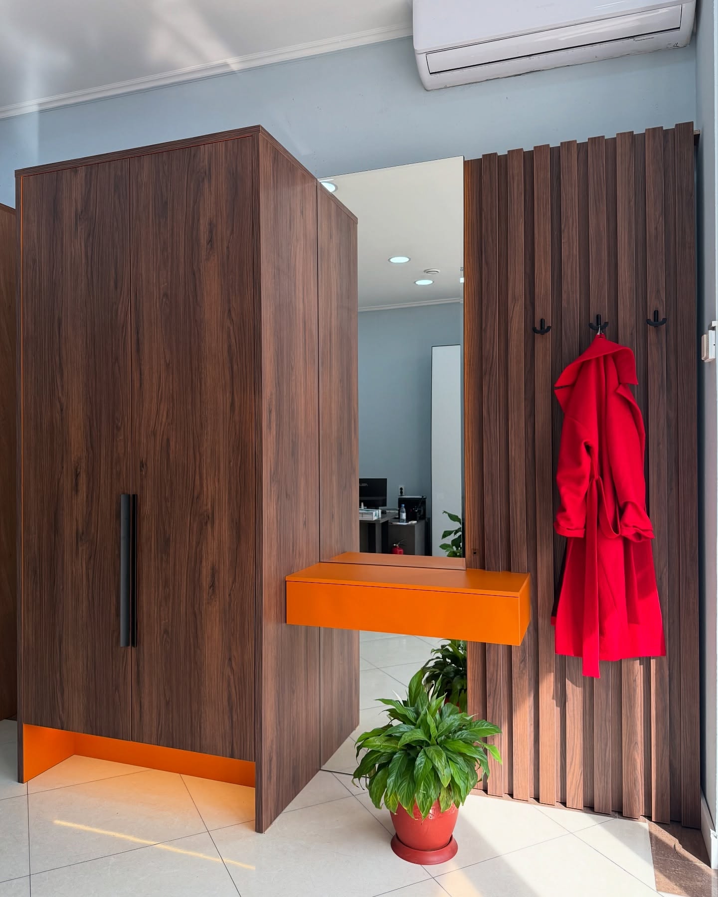 Задача: создать компактную современную прихожую с хранением одежды, местом для мелочей и зеркалом, добавив яркий акцент.