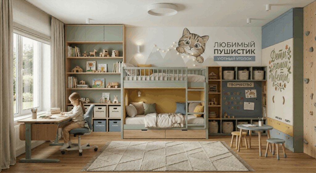 Решение: Мягко зонировали комнату, чтобы игровая зона не отвлекала от стола, а место для сна стало максимально уютным и уединенным. Добавили ящики, в которые легко убрать игрушки вечером.