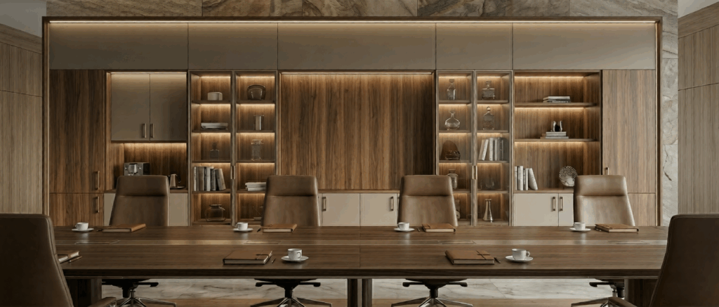 Решение: Мы спроектировали скрытые места для хранения, которые аккуратно спрятали всё лишнее. Розетки спрятали внутрь ящиков, чтобы провода не портили вид.