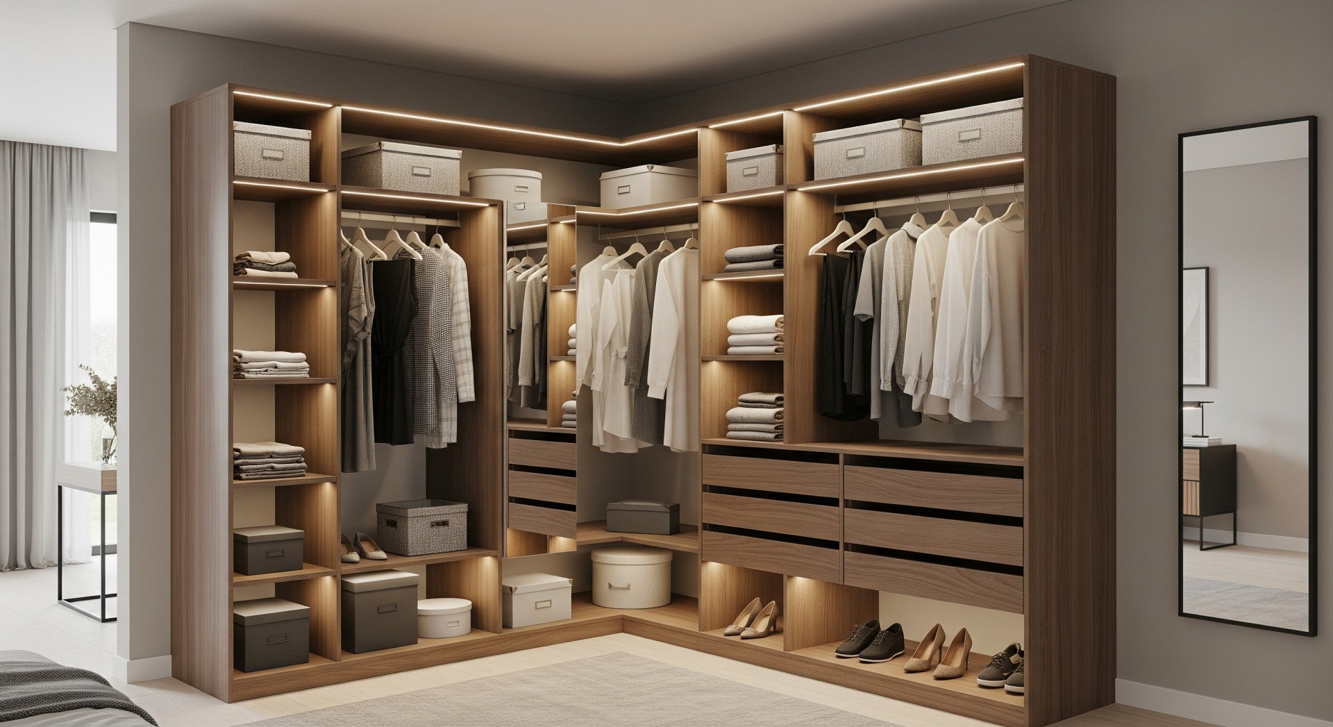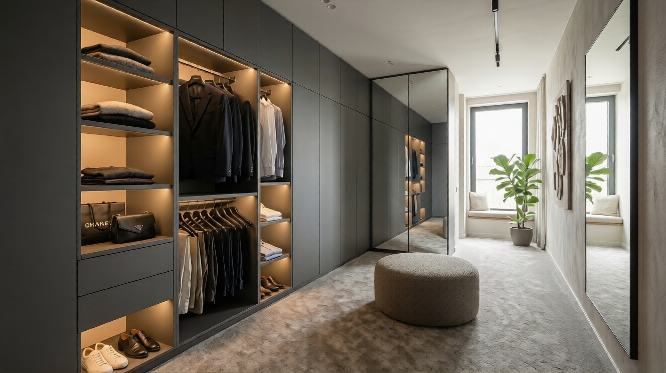 Решение: Мы превратили комнату в продуманную систему, где у каждой вещи — от вечернего платья до любимых кроссовок — появилось своё идеальное место. Мы использовали открытые секции для наглядности, изящные выдвижные ящики для мелочей и добавили мягкую, естественную подсветку, которая выгодно подчеркивает фактуру тканей.