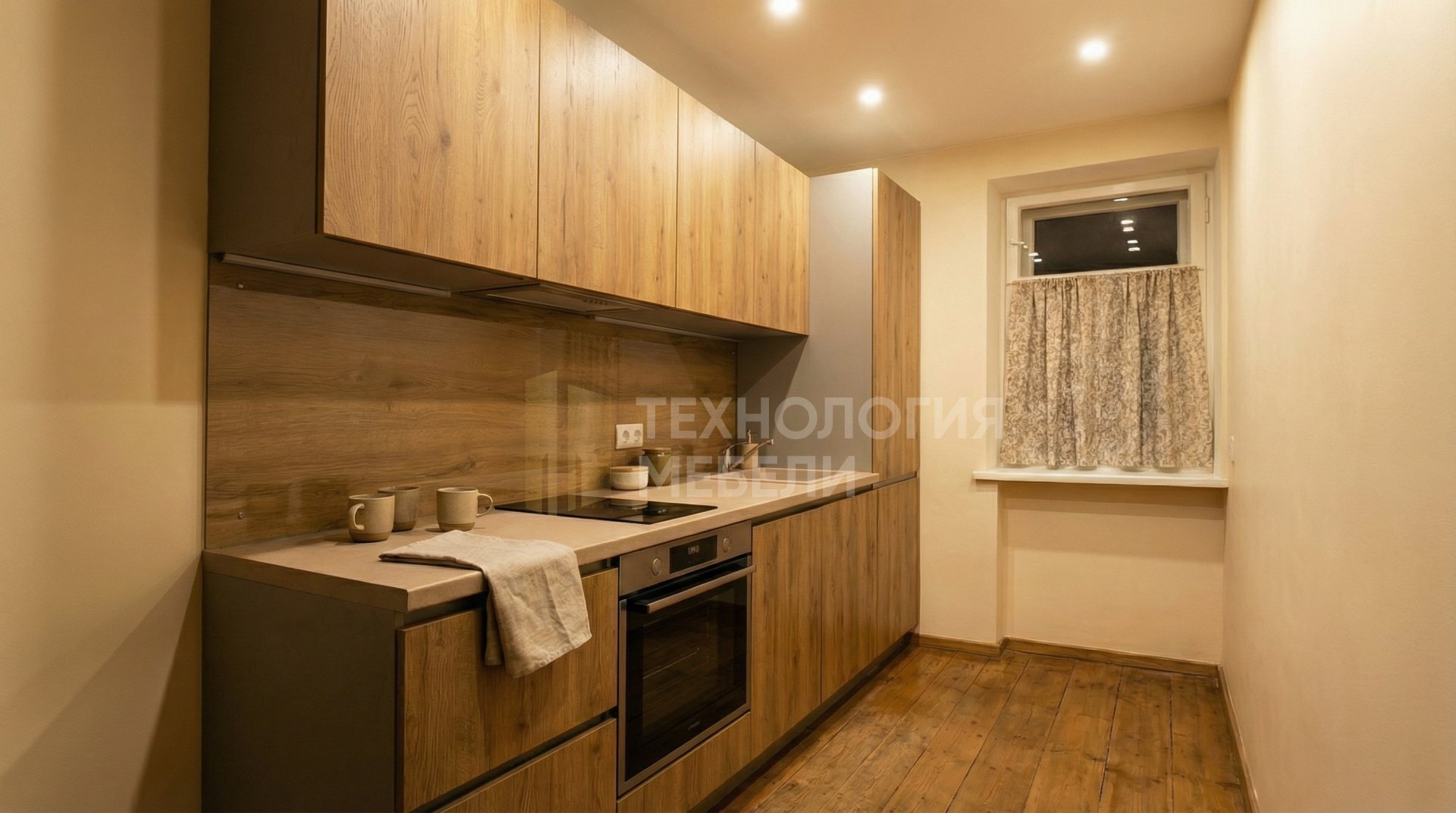 Представляем встроенную кухню длиной 1.8 м, созданную для максимальной функциональности и современного стиля. Корпус выполнен из прочного ЛДСП Kronospan в сером цвете. Фрезерованные фасады из МДФ с древесной фактурой оттенка Дуб вотан придают теплоту и натуральность. Столешница из искусственного камня бежевого цвета имеет элегантную матовую фактуру. Закаленный стеклянный фартук цвета под дерево гармонично дополняет дизайн. Кухня оснащена системой открывания Push-to-open, что позволяет отказаться от ручек, подчеркивая минимализм. Отсутствует кухонный остров и открытые полки, а также подсветка рабочей зоны, однако предусмотрены точечные светильники для общего освещения. Верхние модули стандартной высоты обеспечивают достаточно места для хранения. Акцент на выдвижном типе открывания обеспечивает удобный доступ к содержимому.
