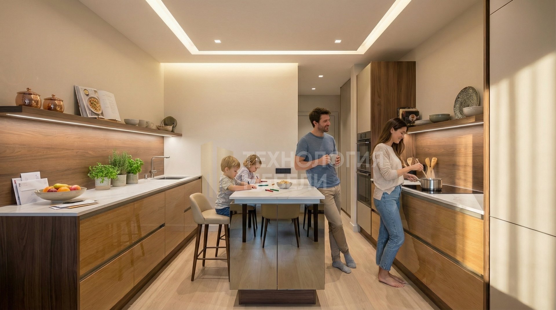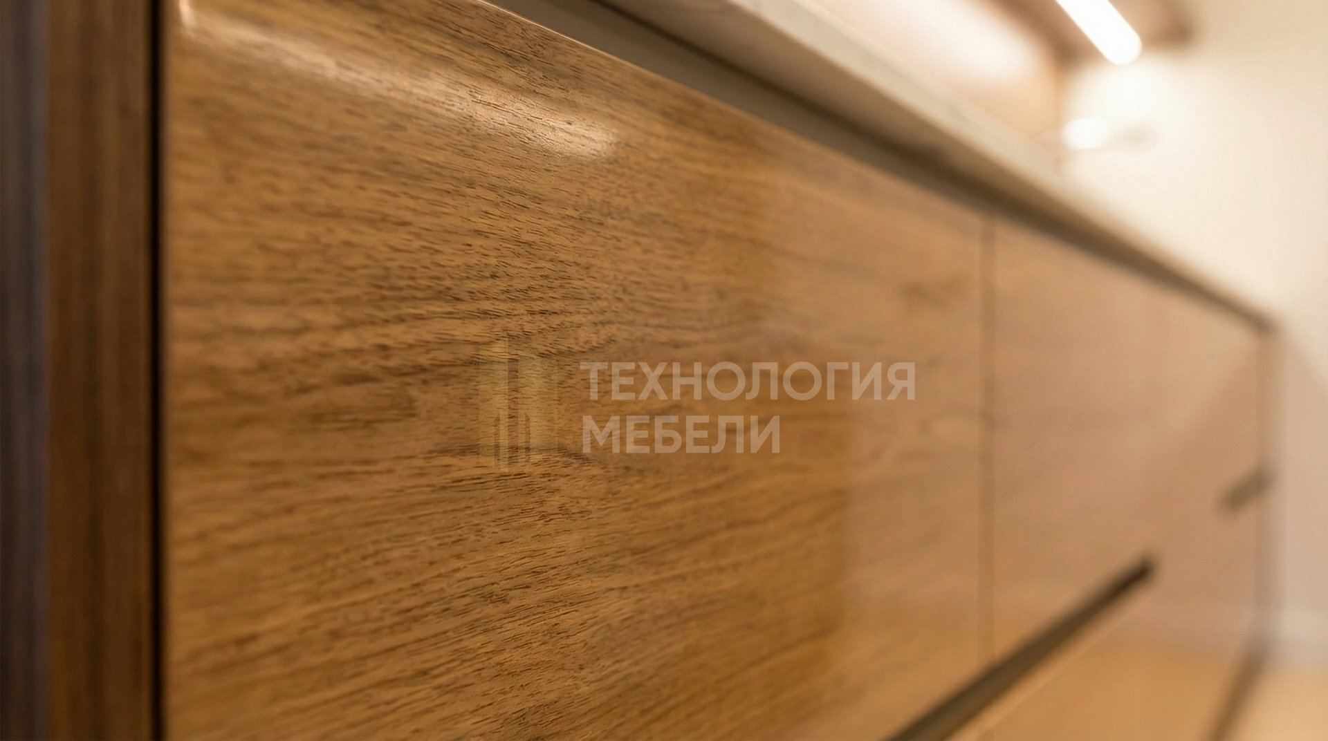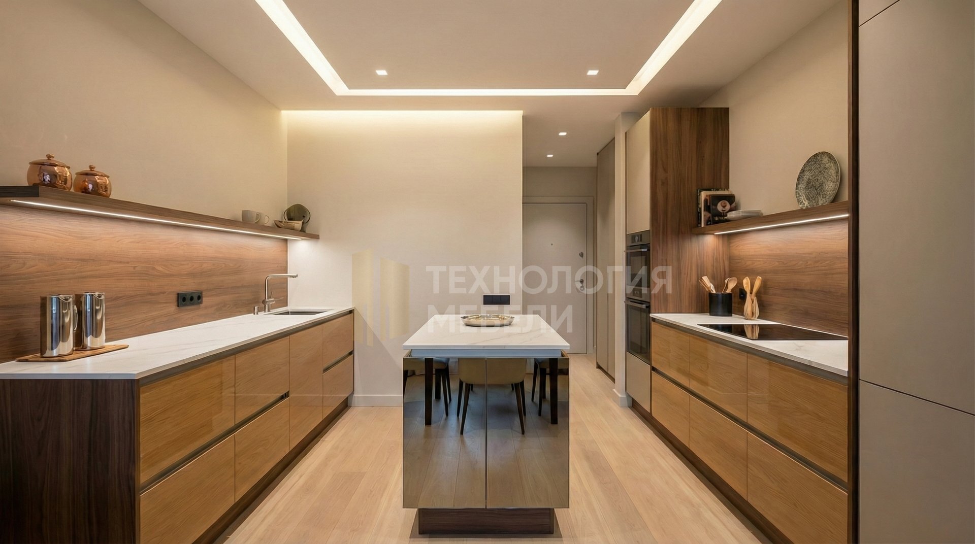Кухня "Астра" в стиле минимализм, двухрядная (1.8 м), с кухонным островом. Отсутствие верхних модулей и открытых полок подчеркивает лаконичность. Фасады (лак/эмаль, шпон, зеркальные панели) имеют пескоструйный рисунок, глянцевую фактуру, стекло в профиле. Цвет фасада — Дуб с нейтрально-тёплым подтоном. Корпус из ЛДСП Kronospan цвета Тёплый орех. Матовая столешница из акрилового камня — Белый мрамор. Фартук — МДФ-панель цвета "Под дерево". Открывание Push-to-open с интегрированным профилем (без ручек). Подсветка: накладные профили. Отсутствие подсветки рабочей зоны дополняет сдержанный стиль. Воплощение функциональности и современного дизайна.