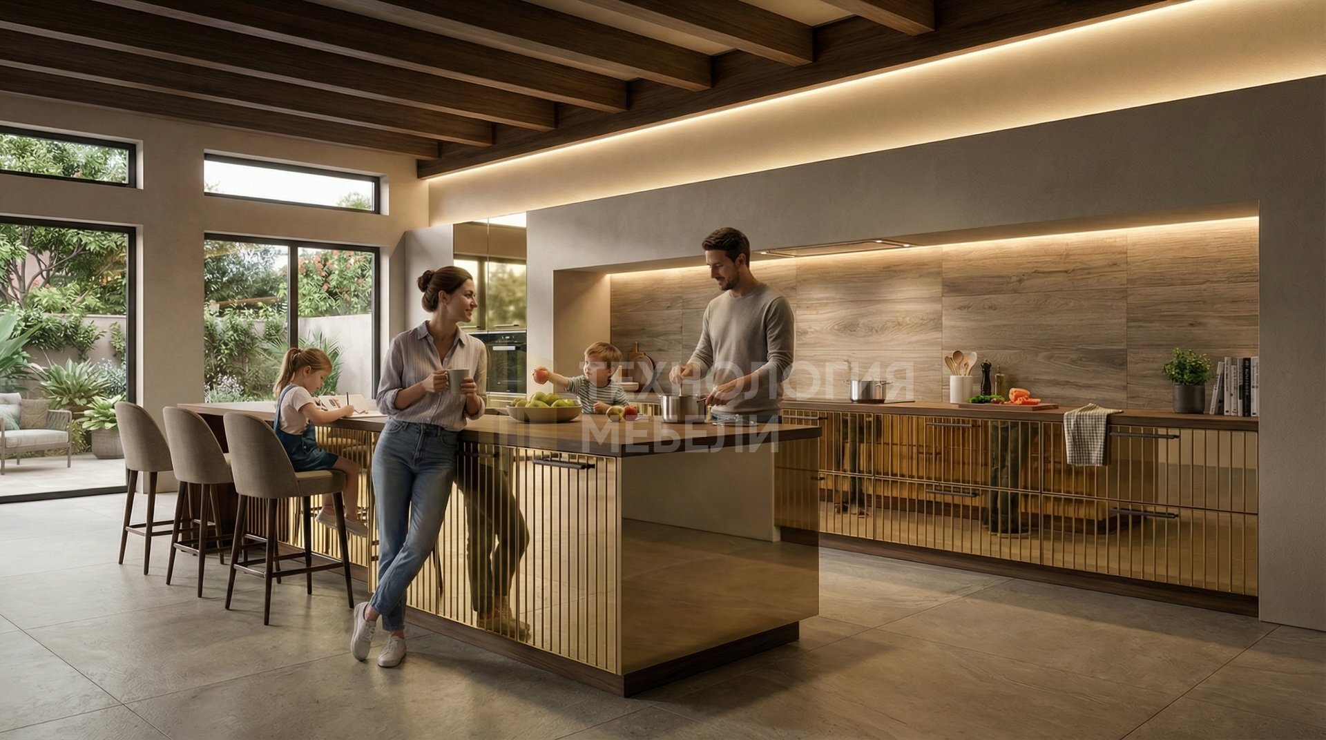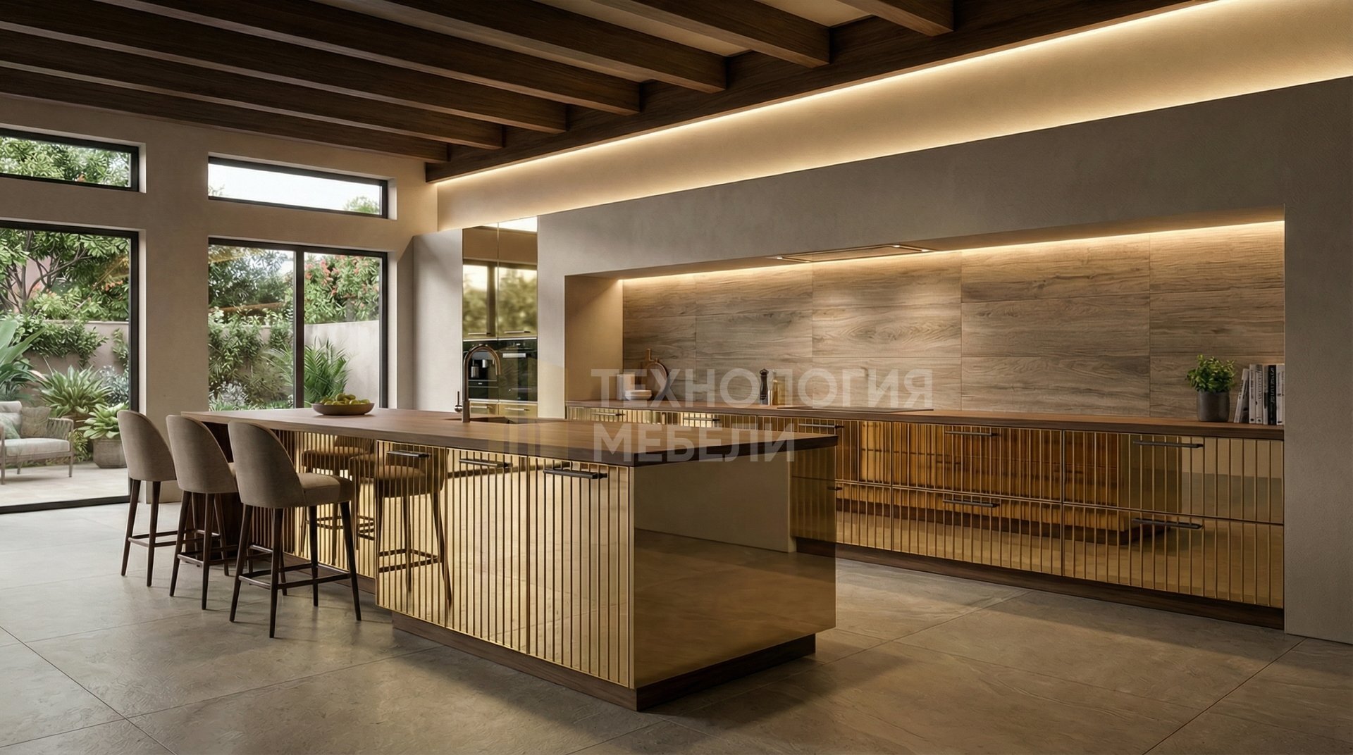 Представляем кухню в стиле Модерн, воплощающую современную элегантность и функциональность. Эта двухрядная модель длиной более 4.5 м идеально впишется в просторное помещение, предлагая кухонный остров для дополнительного комфорта. В конструкции гармонично сочетаются МДФ, дерево, пластик, кожа и зеркальные панели. Глянцевые реечные фасады выполнены из зеркального полотна в роскошном золотом цвете, создавая ощущение простора и света. Корпус из МДФ в белом оттенке подчеркивает чистоту линий. Столешница из МДФ со шпоном в тёплом ореховом цвете имеет матовую фактуру, контрастируя с глянцем фасадов. Фартук из керамогранита цвета под дерево добавляет природную теплоту. Отсутствие верхних модулей и открытых полок придает интерьеру минималистичный вид. Рабочая зона оснащена эффективной LED-подсветкой. Удобные ручки-скобы и выдвижные ящики обеспечивают легкий доступ к содержимому.