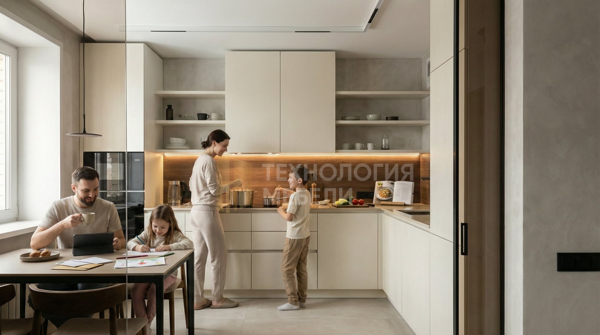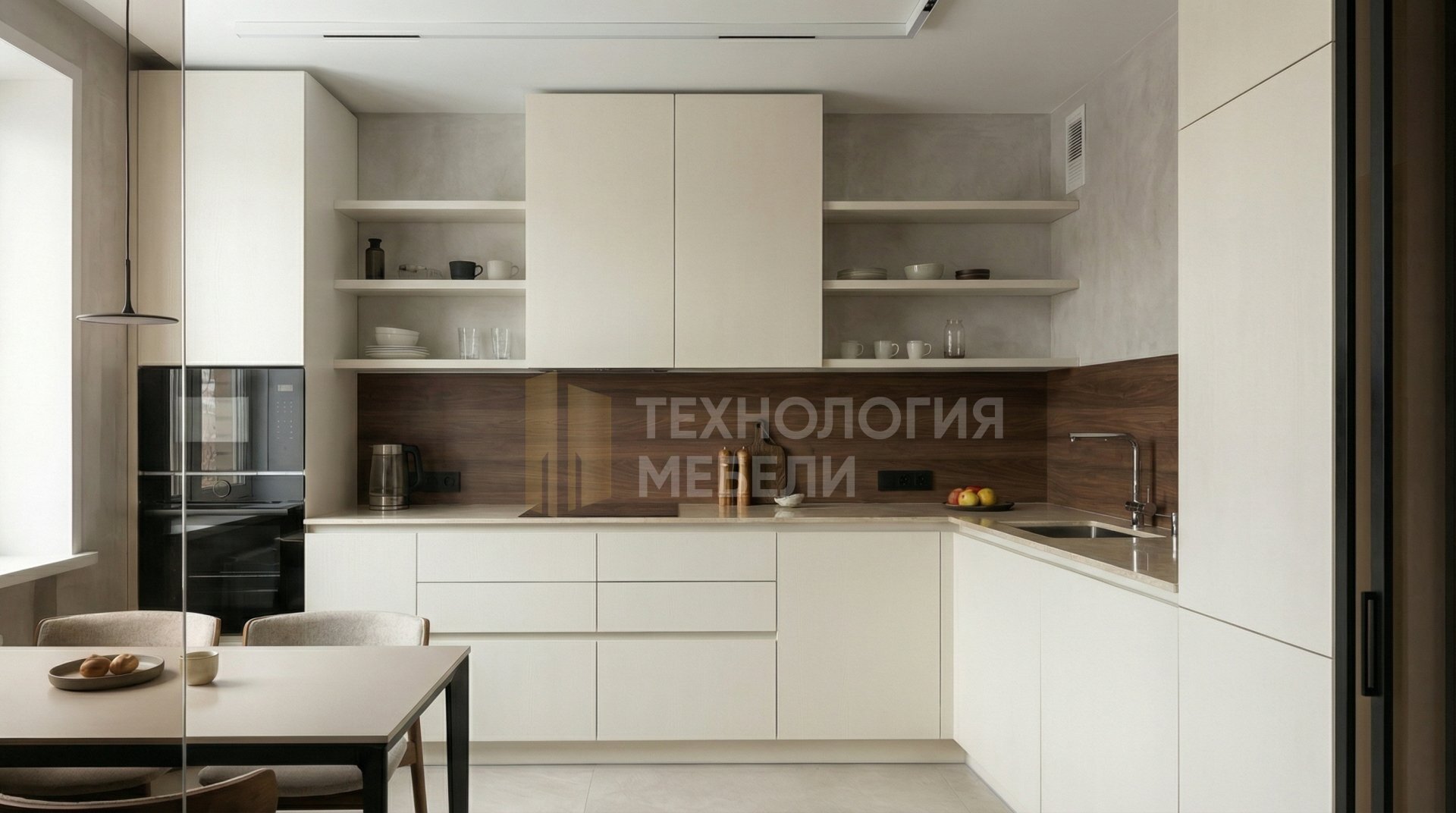 Представляем элегантную встроенную кухню Г-образной формы длиной 1.8 метра. Она отличается корпусом из МДФ безупречного белого цвета и фасадами из МДФ с премиум-декором под дерево, выполненными в нежном оттенке "Молочный ваниль". Плоская гладкая фактура фасадов и отсутствие ручек подчеркивают современный минимализм, с удобным распашным типом открывания. Фартук из панели МДФ под дерево цвета "Тёмный орех" придает глубину и контраст. Столешница из натурального камня бежевого цвета с глянцевой фактурой добавляет роскоши. Предусмотрена общая подсветка с использованием накладных профилей, но без фокусировки на рабочей зоне. Концепция включает функциональный кухонный остров, отсутствие верхних модулей и наличие открытых полок, что способствует созданию воздушного и просторного интерьера. В конструкции применены передовые материалы: стекло, керамогранит, инновационный нанотехнологичный пластик (Fenix) и микроцемент, обеспечивающие исключительную долговечность и эстетику.
