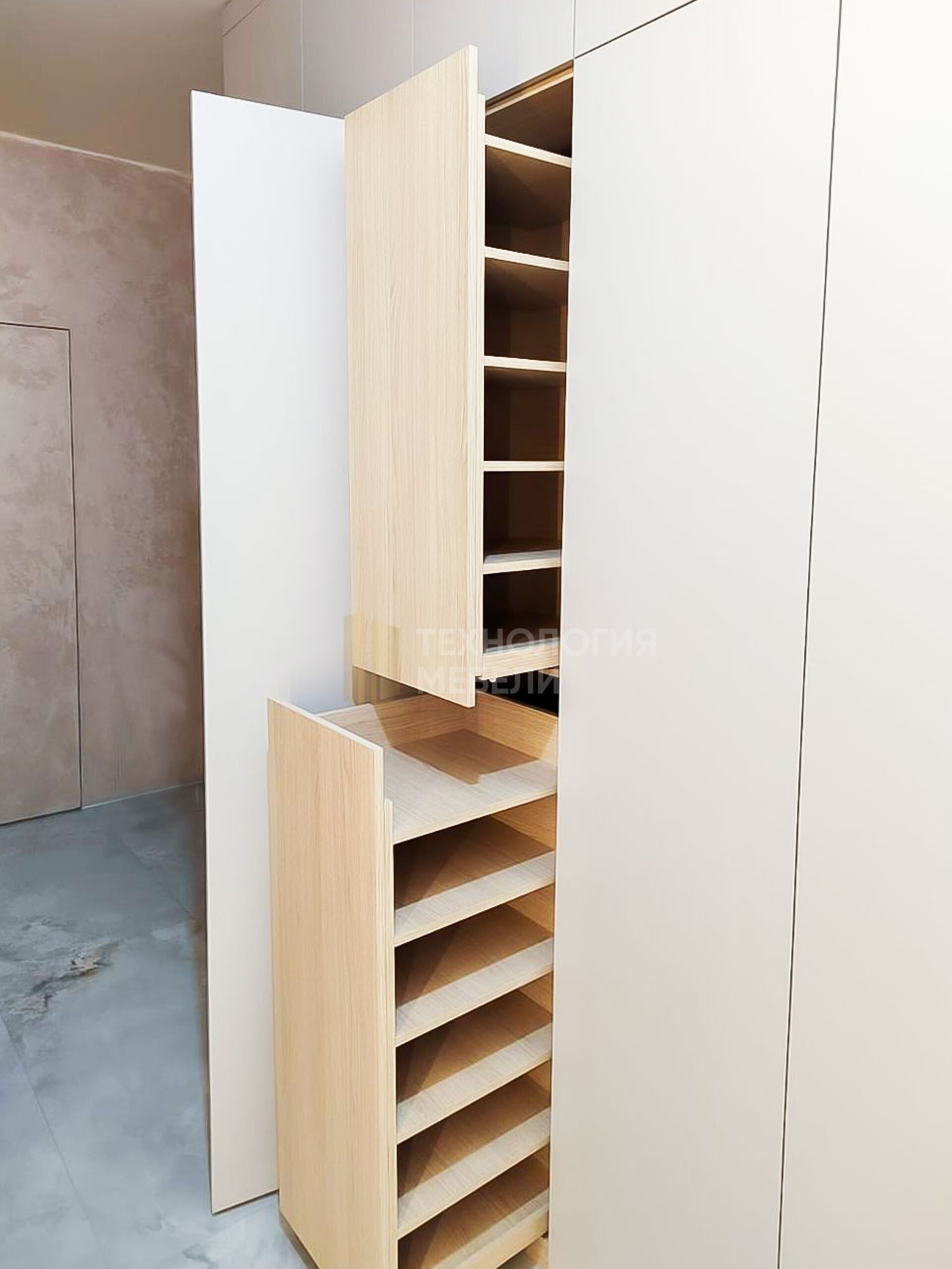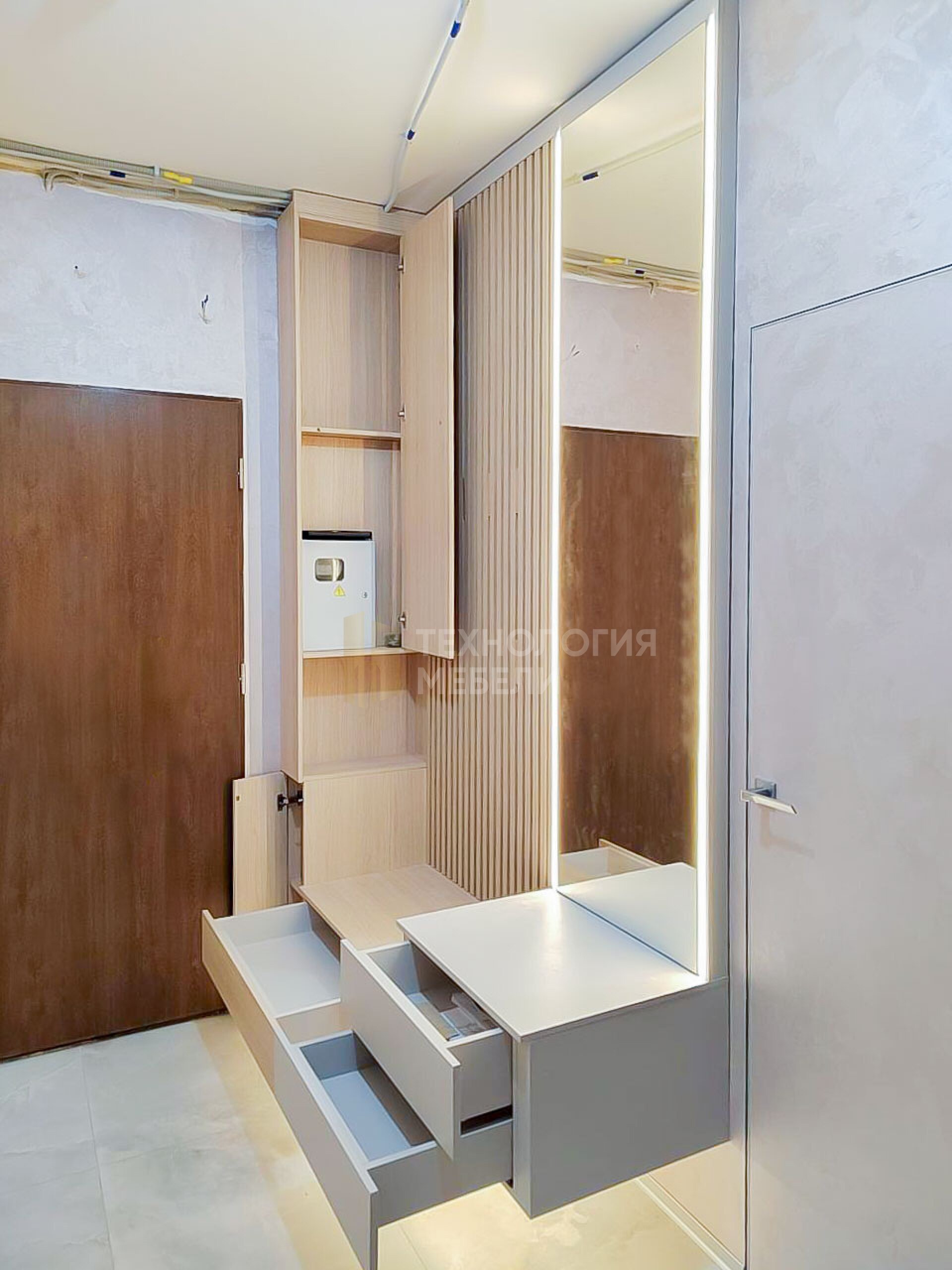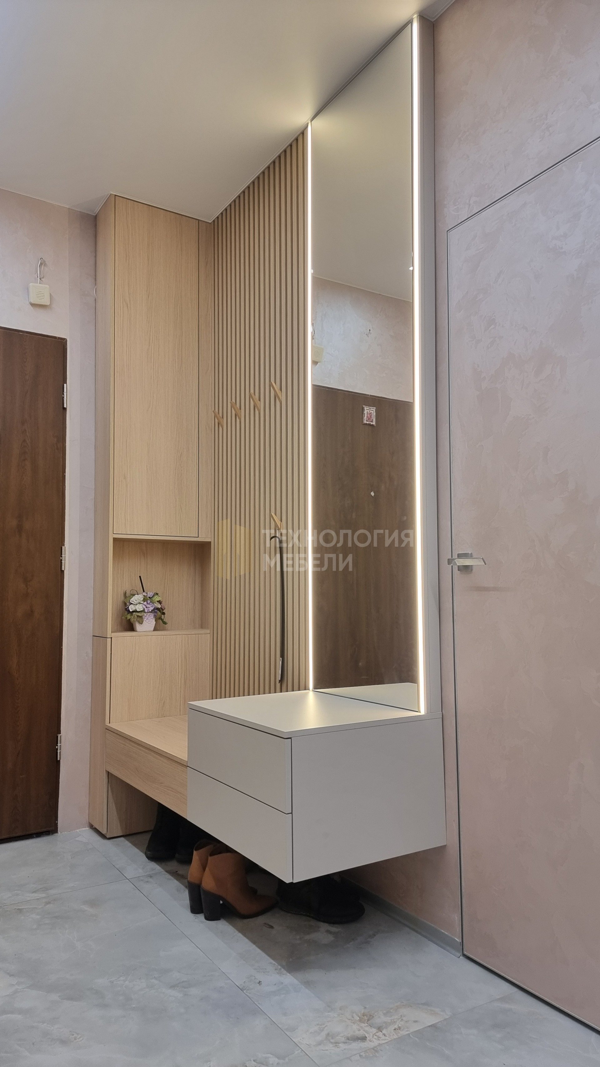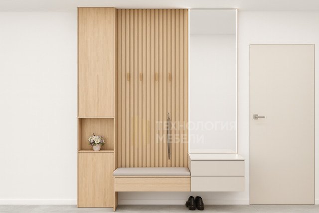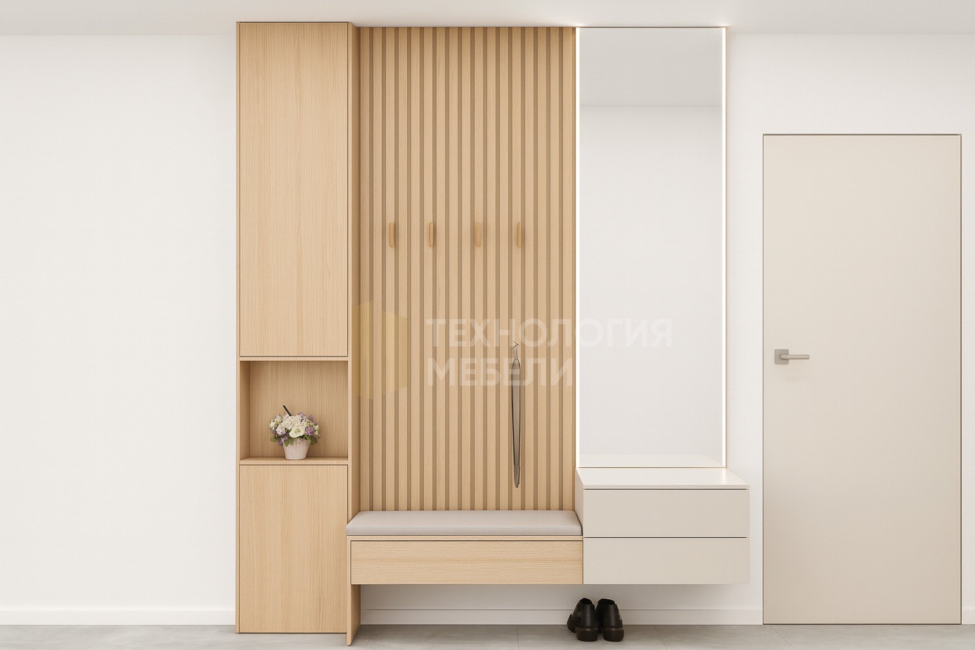 Прихожая «Аурелия» — стиль, свет и функциональность в одном решении Современная прихожая «Аурелия» создана для тех, кто ценит комфорт, эстетику и практичность. Тёплые деревянные панели в сочетании с мягкими бежево-серыми фасадами создают уютную атмосферу и визуально расширяют пространство. Встроенное зеркало с подсветкой делает интерьер лёгким и светлым, а функциональные элементы — открытые полки, выдвижные ящики и зона для сидения — обеспечивают удобство в использовании каждый день. 💡 Особенности модели: стильное вертикальное оформление рейками из натурального шпона дуба; подсветка с тёплым мягким светом вдоль зеркала; вместительные выдвижные ящики для аксессуаров и обуви; качественная фурнитура Blum с доводчиками; корпус из ЛДСП Egger, фасады — МДФ Soft Touch. 📐 Стиль: современный / скандинавский / минимализм ⚙️ Материалы: ЛДСП Egger, МДФ Soft Touch, шпон дуба 💡 Фурнитура: Blum / Hettich 🎨 Изготовление на заказ: возможен выбор цвета, фактуры и конфигурации Прихожая «Аурелия» объединяет эстетику и удобство, превращая обычное пространство у входа в элегантную зону приветствия.