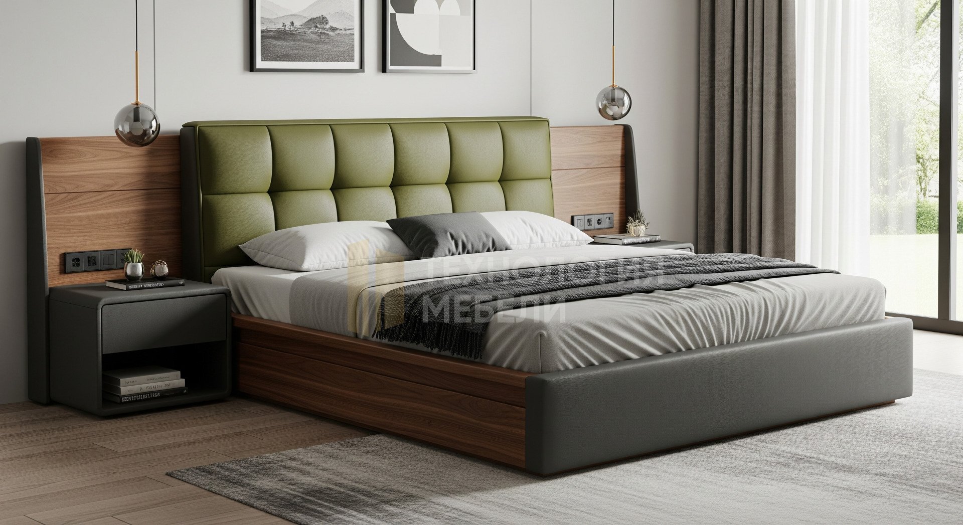 Кровать "Аванте" — это современное встроенное решение в стиле модерн. Односпальная, с просторным спальным местом 200x200 см, она выполнена из МДФ в мягкой обивке из экокожи цвета серый антрацит, дополненной натуральным шпоном оттенков зеленый оливковый и теплый орех. Конструкция без изголовья на коробе включает подъемный механизм газлифт и бельевой ящик. Основание (металлическая сетка) и матрас приобретаются отдельно. Макс. нагрузка до 100 кг на место.