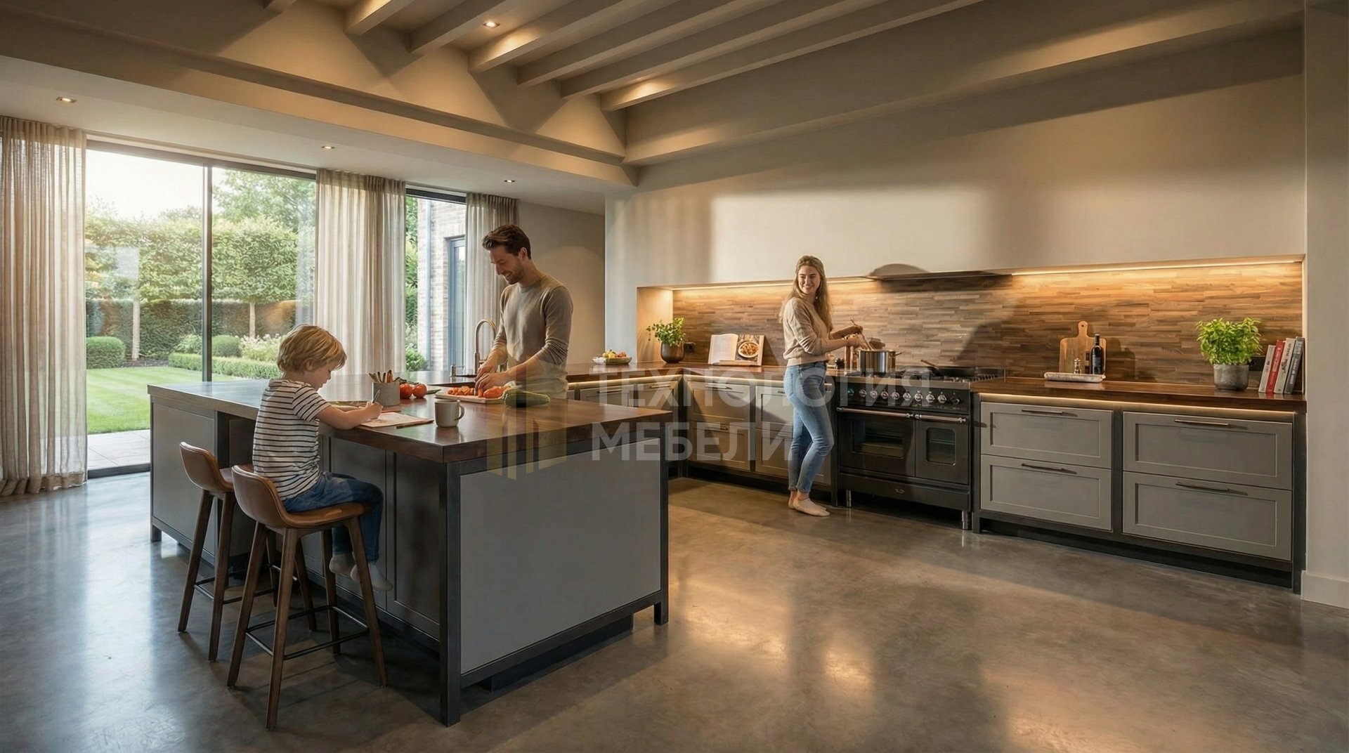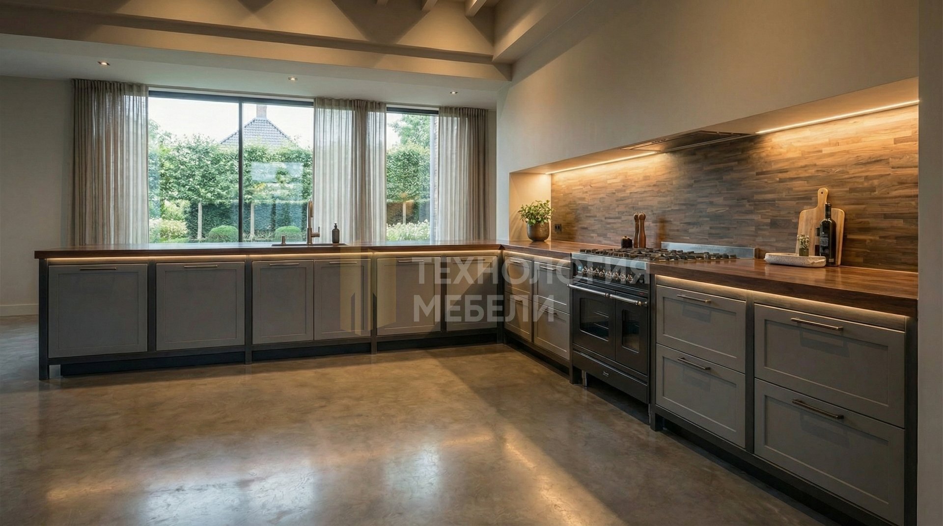 Модульная угловая кухня длиной 3.0 м. Корпус из металла цвета антрацит. Фасады МДФ фрезерованные, матовые, серого цвета. Столешница из ЛДСП, глянцевая, цвет тёмный орех. Фартук — мозаика под дерево. Ручки накладные. Тип открывания — подъёмный механизм. Подсветка рабочей зоны — LED. Отсутствуют кухонный остров, верхние модули, открытые полки. Материалы: металл, лак/эмаль. Цветовая палитра включает ореховые и бордовые оттенки. Фактура фасада матовая, столешницы — глянцевая. Функциональность и современный стиль. Практичная и эргономичная. Идеальное решение для стильных интерьеров.