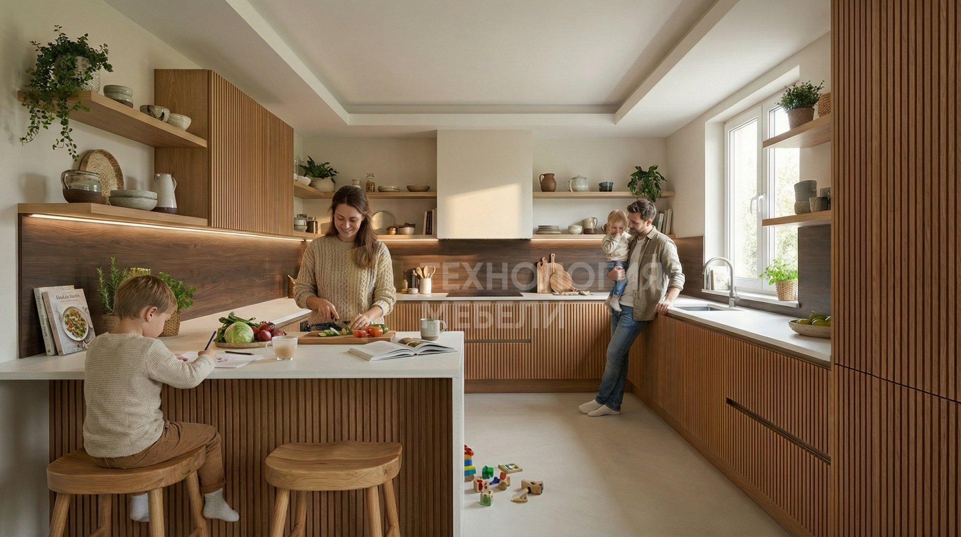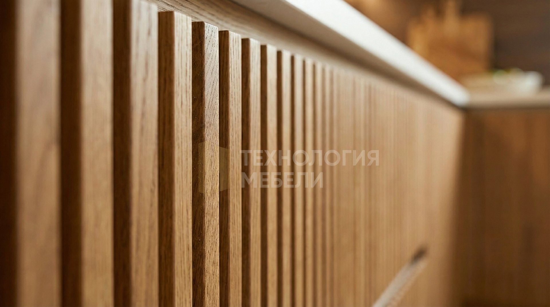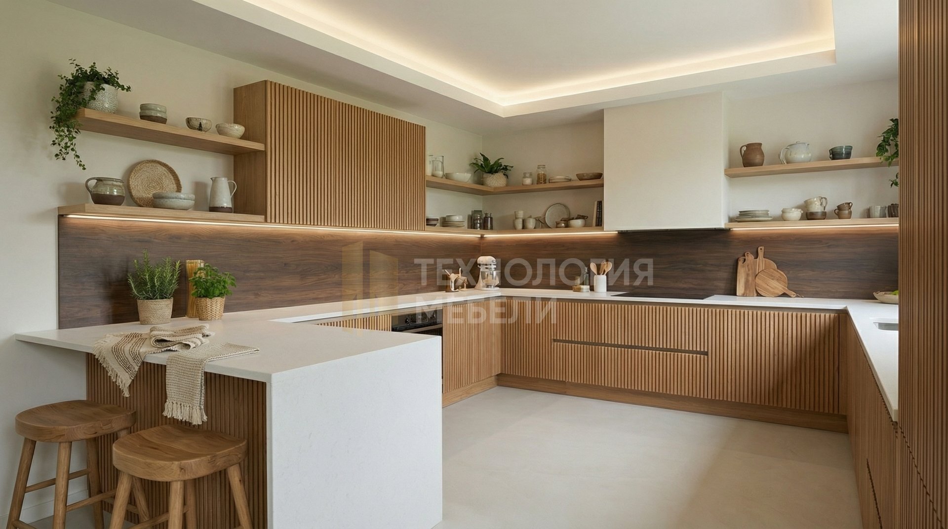 Кухня «Аврора Эко» (4.2 м) — это воплощение эко-стиля с П-образной формой. Корпус из влагостойкого ДСП цвета «Дуб» обеспечивает прочность. Реечные фасады из ЛДСП в теплом древесном оттенке с фактурой Soft-touch и интегрированными ручками Gola создают единый, минималистичный образ. Столешница из искусственного камня в белом матовом цвете с текстурированной поверхностью гармонирует с фартуком из керамогранита цвета «Темный орех». Отсутствие верхних модулей и наличие открытых полок со светодиодной лентой (без подсветки рабочей зоны) подчеркивают легкость и функциональность. Тип открывания — распашное.