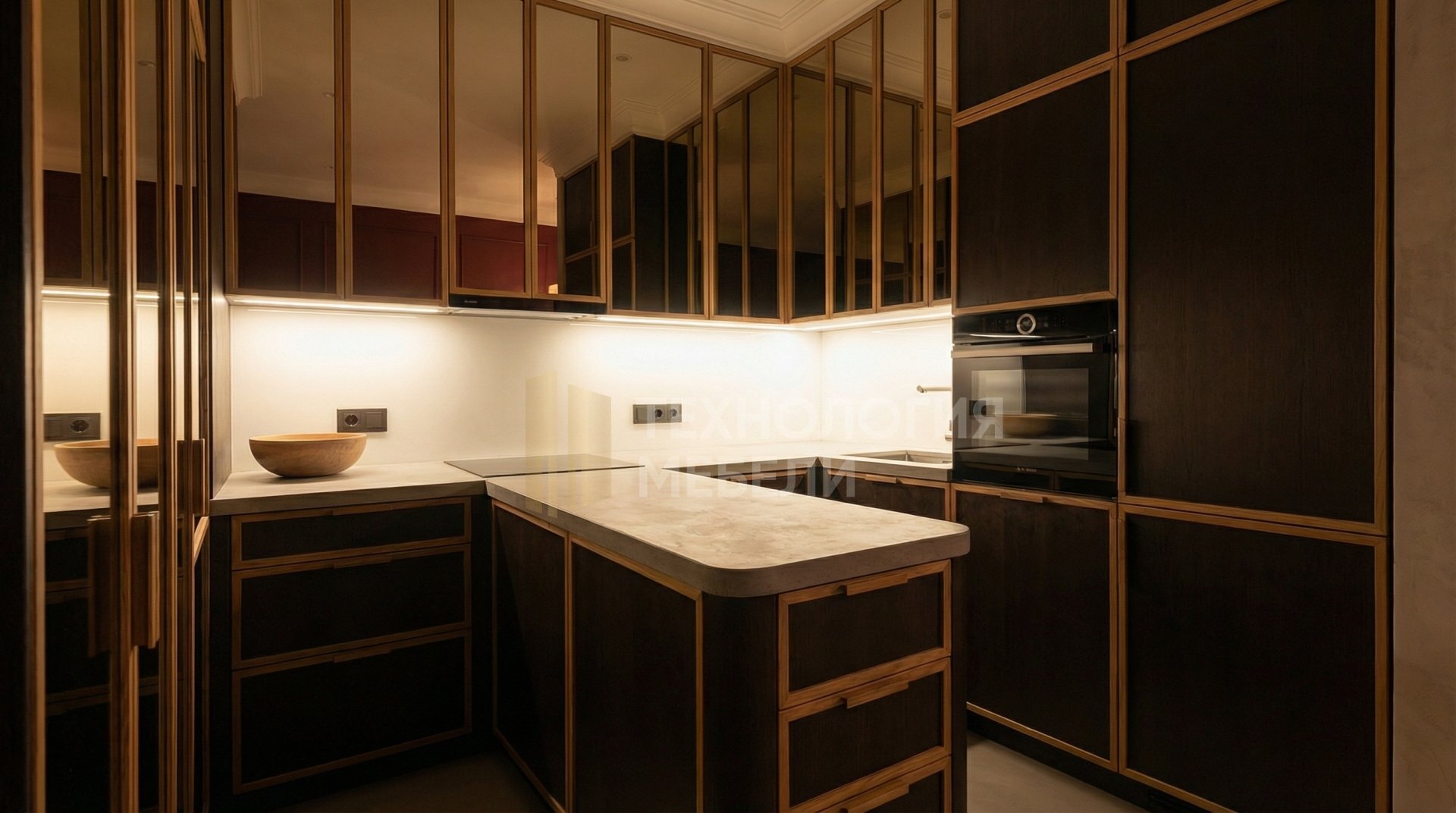 Кухня «Дубрава» в эко-стиле создает атмосферу природной гармонии и современного комфорта. В дизайне использованы натуральная кожа, элегантный микроцемент и прочный компакт-ламинат (HPL). Цветовая палитра включает тёмно-коричневые тона, оттенки ореха, глубокий красный бордовый и натуральный дуб. Фасады, выполненные из стекла в профиле, демонстрируют фактуру натурального дерева цвета натурального дуба, а также зеркальное полотно. Гармоничным дополнением служит фартук из закаленного белого стекла. Корпус из МДФ в цвете венге обеспечивает прочность и эстетику. Столешница из компакт-плиты имеет матовую фактуру и цвет бетона. Эргономичные ручки представлены интегрированным профилем Gola. Кухня длиной 2.4 метра имеет удобную островную форму с функциональным кухонным островом. Верхние модули до потолка и отсутствие открытых полок создают лаконичный и завершенный вид. Рабочая зона не имеет отдельной подсветки, однако общая атмосфера подчеркнута светодиодной лентой. Система открывания всех модулей — выдвижная.