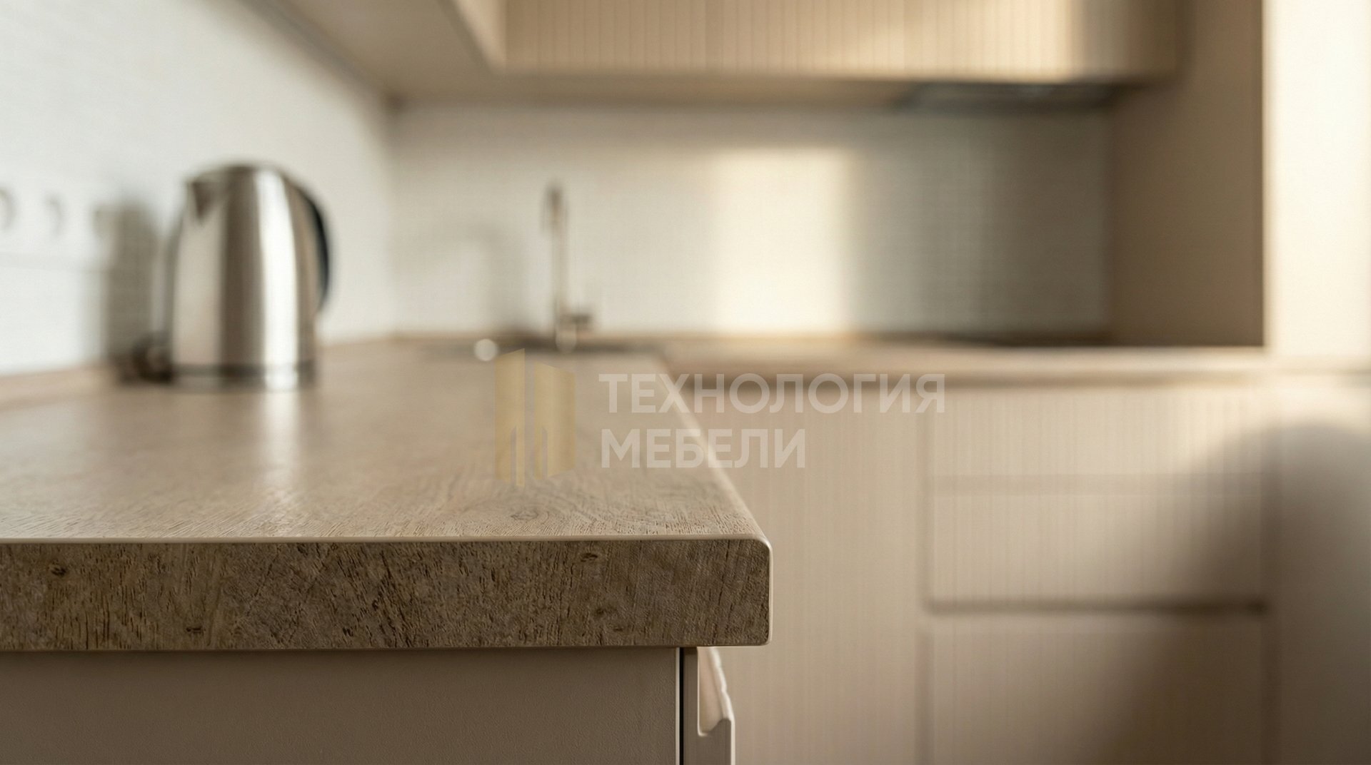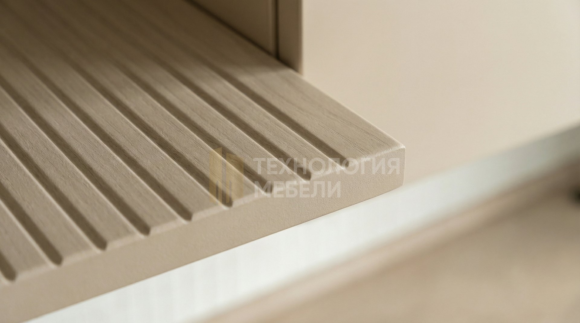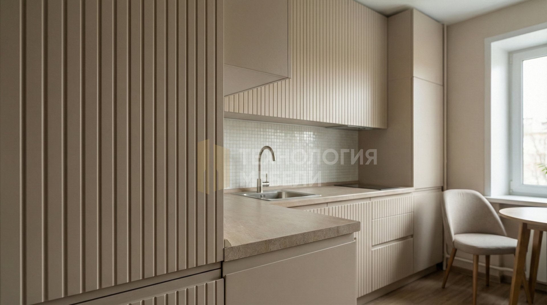 Кухня «Эфир» воплощает эко-стиль, создавая атмосферу уюта. Угловая, длиной 1.8 м, оптимальна для зонирования. Корпус из ЛДСП Kronospan светло-бежевого цвета гармонирует с матовыми кашемировыми реечными фасадами из ЛДСП с фрезерованной вертикальной фактурой. Отсутствие ручек (Push-to-open) подчеркивает минимализм. Столешница из МДФ песочного оттенка с текстурированной поверхностью дополняется белым фартуком из мозаики. Верхние модули до потолка обеспечивают максимум хранения, без открытых полок и острова, сохраняя чистоту линий. Подсветка выполнена накладными профилями, но рабочая зона не имеет дополнительного освещения. Распашное открывание. Общая палитра: белый, светло-бежевый, песочный, кашемир матовый, с элементами ткани и шпона, завершает образ природной легкости и её функциональности.