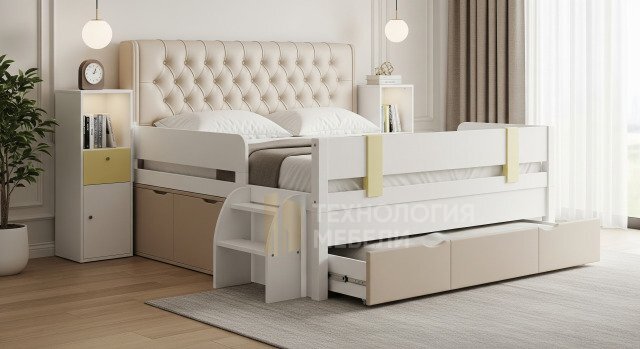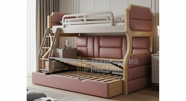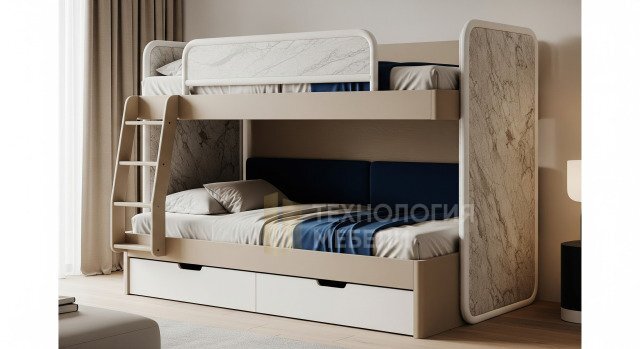 Элегантная двухъярусная кровать "Элевия" в стиле современного минимализма с ретро-элементами. Каркас из массива дерева, основание сплошное (ЛДСП). Спальное место 160x200 см. Низкое мягкое изголовье из микровельвета, гладкое. Нагрузка до 150 кг на место. Цвет обивки бежевый. Выдвижной бельевой ящик. Без подъемного механизма и ножек (на коробе). В отделке натуральный камень. Доступна в цветах: слоновая кость, темный синий, молочный ваниль, белая эмаль. Основание в комплекте, матрас не в комплекте.