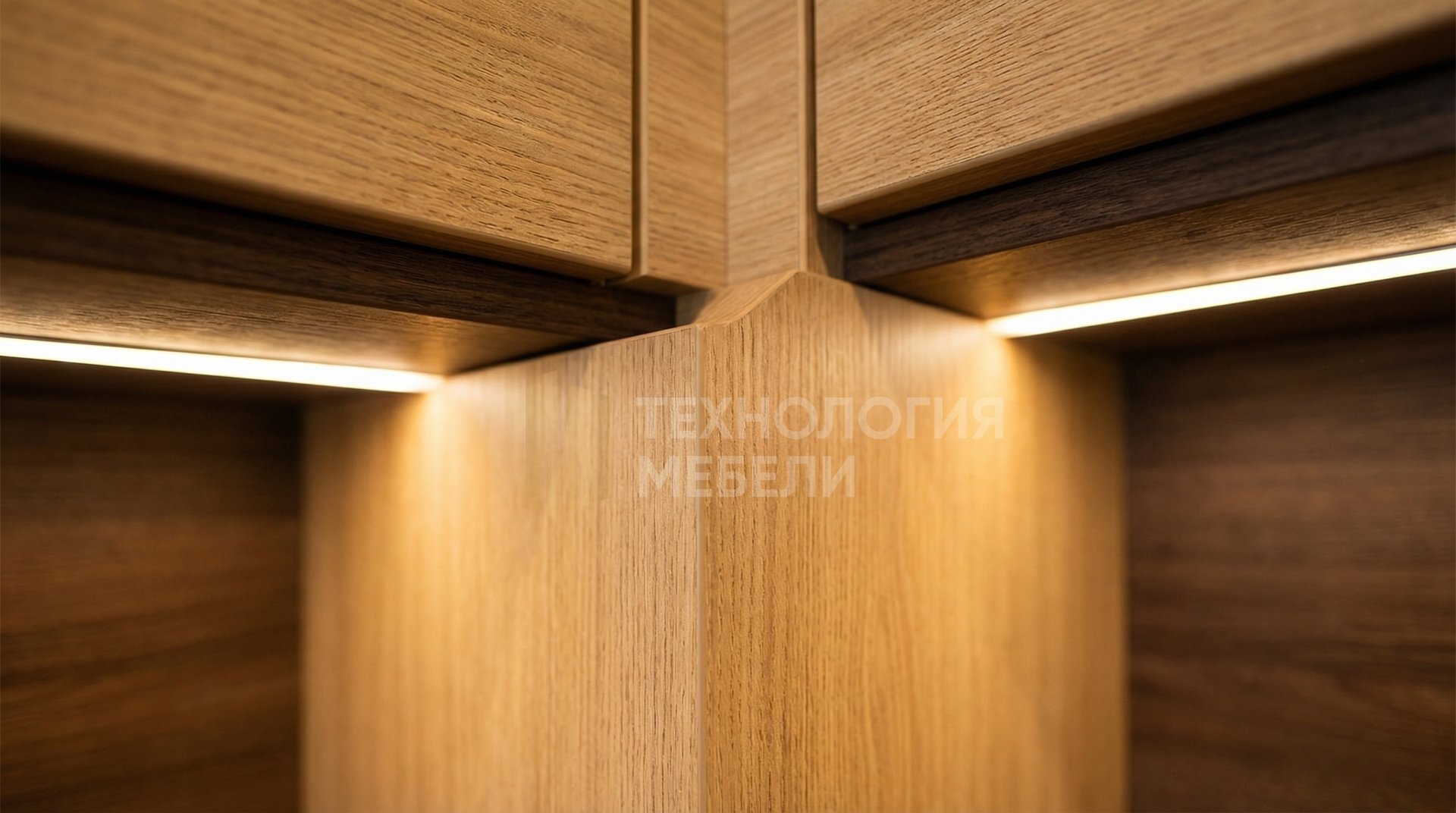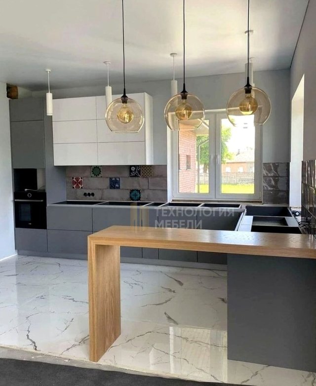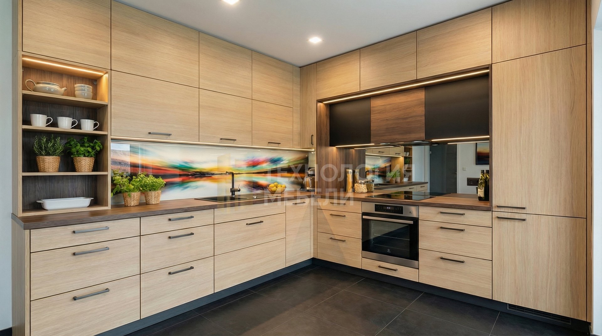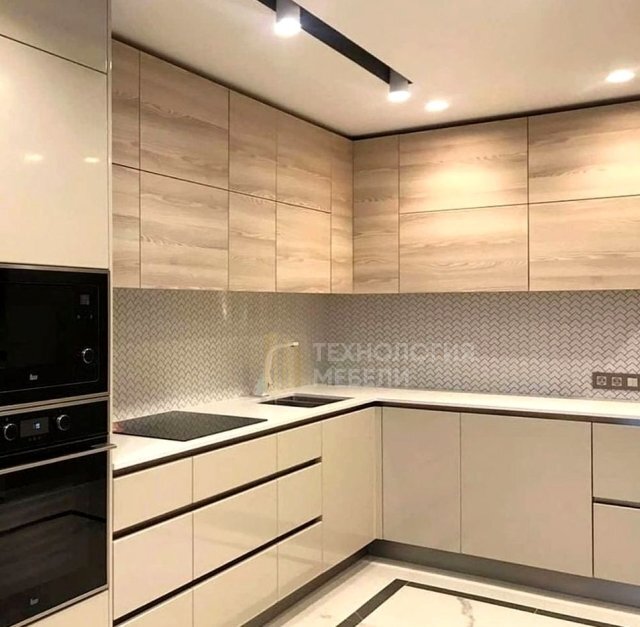 Представляем современную угловую кухню длиной 3.6 м, выполненную из высококачественных материалов. Корпус из ЛДСП Kronospan в цвете антрацит идеально сочетается с фрезерованными МДФ-фасадами оттенка светлый дуб, имеющими матовую фактуру. Столешница из натурального камня также матовая, выполнена в цвете орех. Закаленное стекло фартука украшено фотопечатью, добавляя уникальный акцент. Функциональность обеспечивается накладными ручками и подъемными механизмами открывания. Верхние модули достигают потолка, а наличие открытых полок и LED-подсветки рабочей зоны повышает удобство. В дизайне использованы элементы из металла, ткани, нанотехнологичного пластика Fenix, шпона и зеркальных панелей, создавая стильное и практичное пространство.