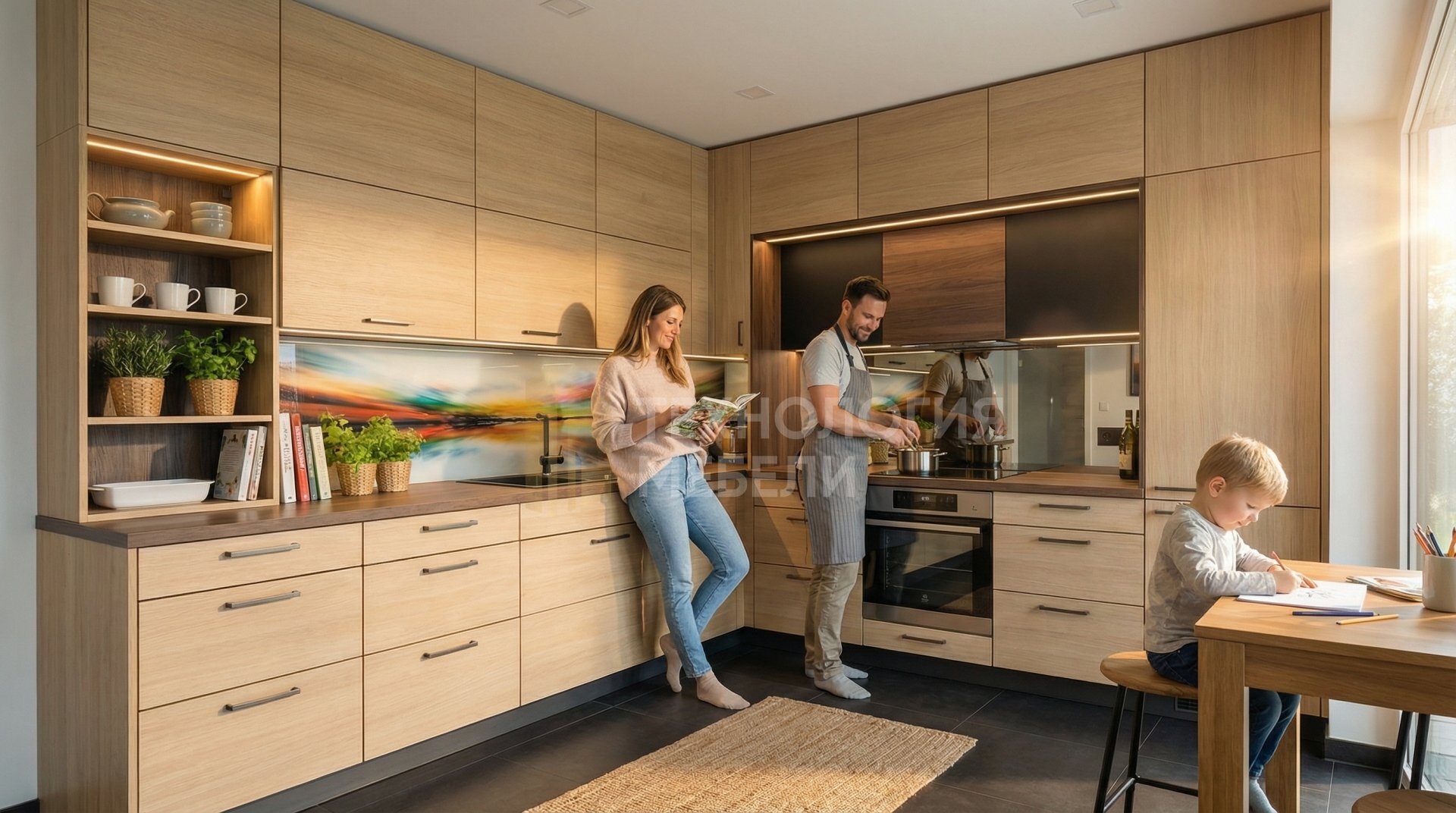 Приедем в удобное время с образцами материалов, сделаем точный лазерный замер и подготовим 3D-эскиз вашей будущей кухни.