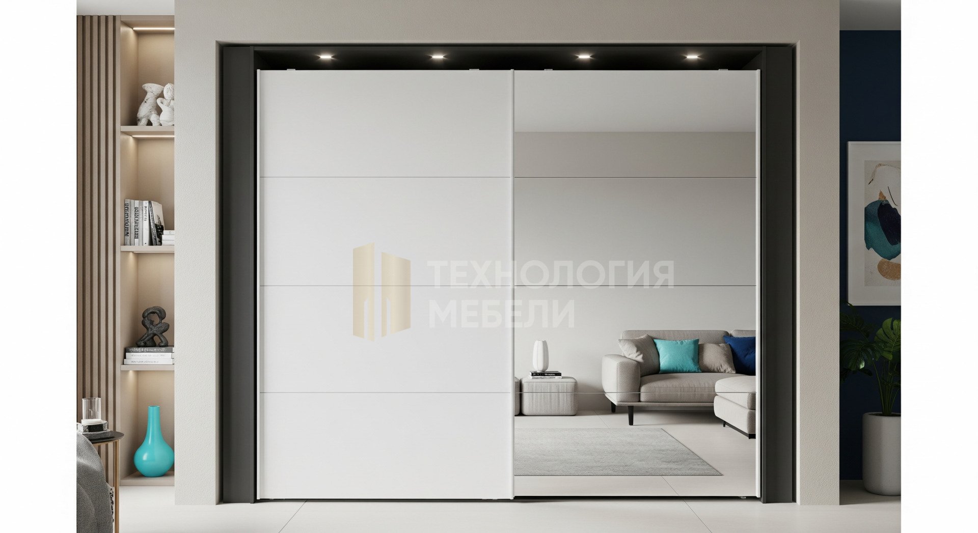Встроенный шкаф-гардеробная с модульным дизайном в стиле Лофт/Хай-тек и Скандинавским исполнением. Корпус из МДФ (18мм) цвета антрацит. Фасады из МДФ под эмалью, матовые, белого цвета. Используются профиль-ручки и компланарная система раздвижения с доводчиками на двух дверях, каждая из которых имеет зеркало. Внутреннее наполнение премиум-класса: пантографы, ящики, выдвижные брючницы/обувницы, точечная подсветка. С антресолями. Материалы: керамогранит под светлый камень, натуральный камень. Монтаж в нишу.