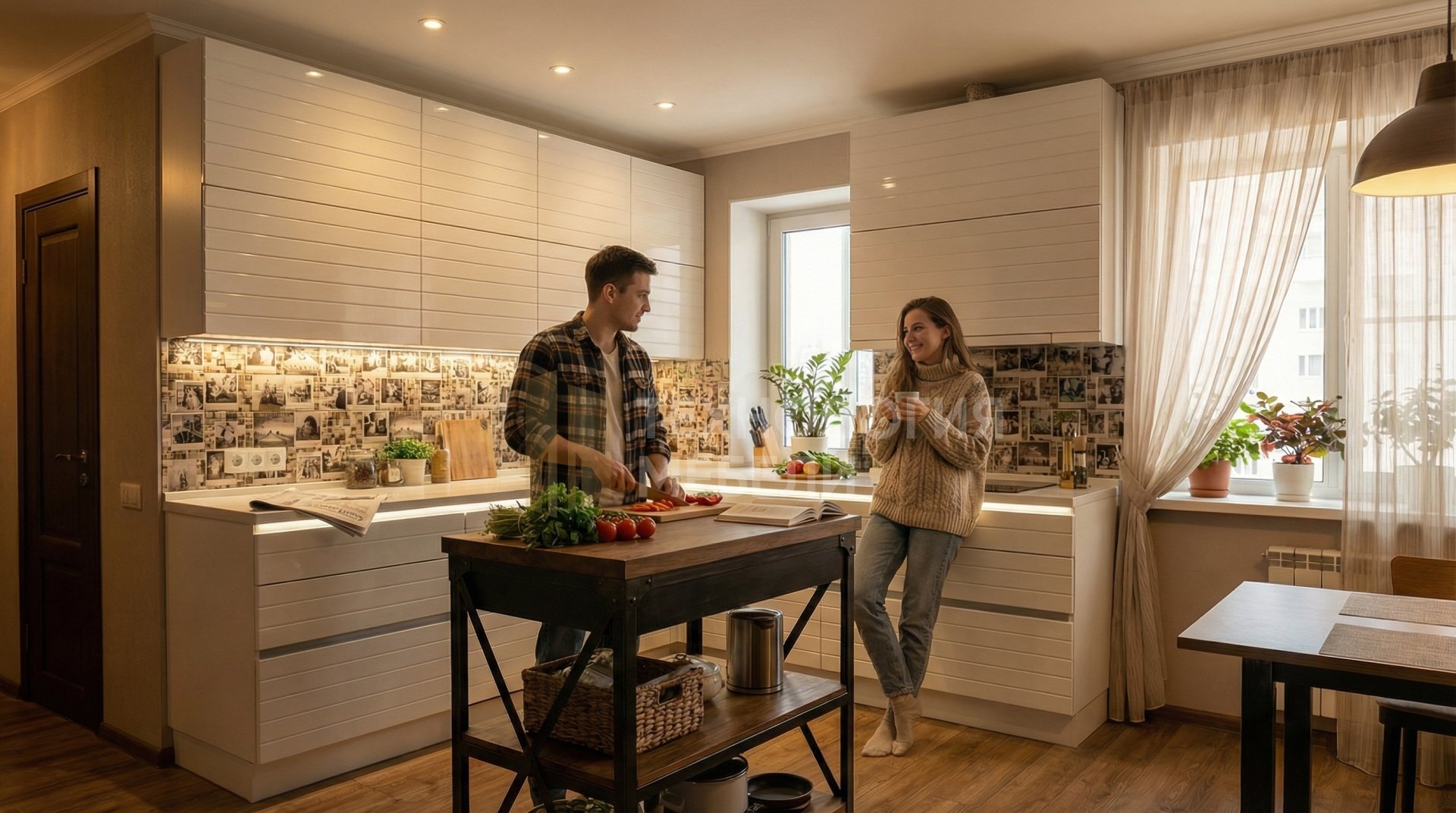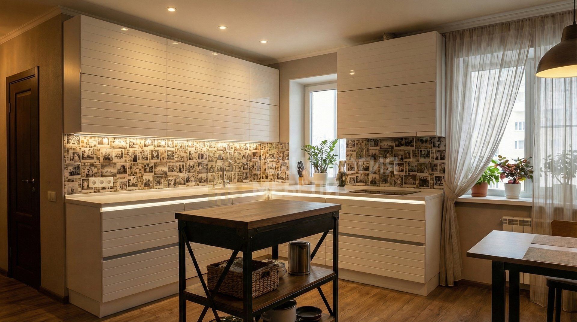 Представляем угловую кухню в стиле лофт, длиной 1.8 м, дополненную функциональным кухонным островом. Фасады выполнены из гладкой эмали в белом глянце, с реечным типом, и оснащены системой открывания Push-to-open без ручек. Корпус из ЛДСП в белом цвете обеспечивает надежность. Рабочая зона выделена столешницей из натурального камня белого матового цвета с текстурированной фактурой. Эффектный фартук из мозаики украшен фотопечатью. Встроенная подсветка рабочей зоны реализована накладными профилями. Организация хранения продумана с выдвижными ящиками и верхними модулями стандартной высоты, без открытых полок, что создает цельный и современный вид.