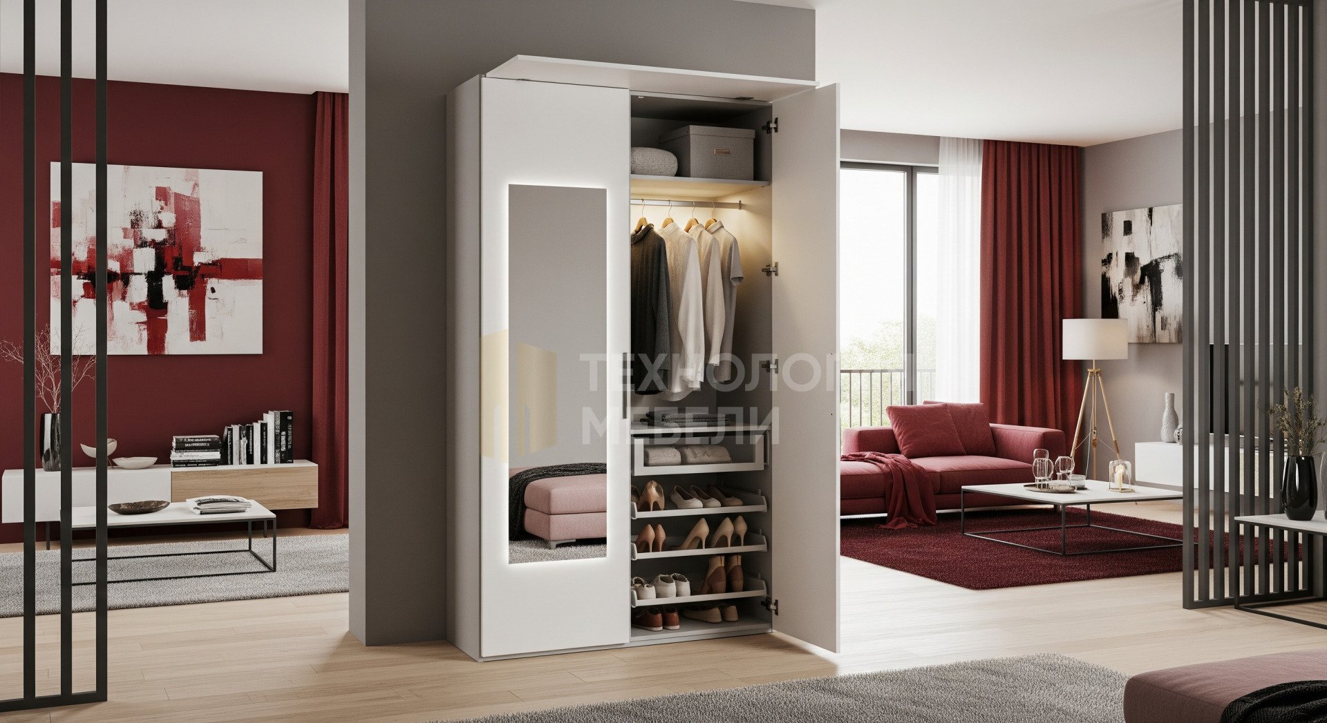 Эсмера" — пристенный однодверный шкаф-купе, сочетающий современный модерн и классику. Корпус МДФ (ЛДСП 18 мм), светло-серый. Фасад ЛДСП: белый матовый, глянцевая фактура, с зеркалом на двери, распашная система Push-to-open. Внутреннее наполнение стандарт: полки, продольная штанга, выдвижные брючницы/обувницы. С антресолями и внутренней подсветкой (с датчиком открытия). Основные материалы: пластик, камень.