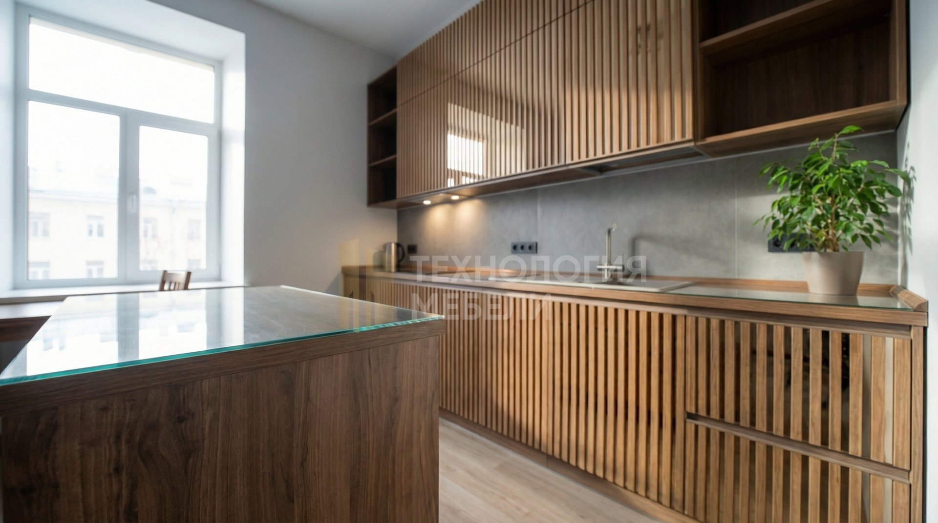 Представляем встроенную кухню, длиной 2.4 м, воплощающую современное решение для дома. Корпус выполнен из металла в светло-сером оттенке. Фасады МДФ, реечного типа, обладают древесной фактурой и цветом "зеркальное полотно". В дизайне интерьера органично использованы натуральные ротанг и бамбук. Столешница из закаленного стекла, матовой фактуры, представлена в цвете тёплый орех. Фартук — керамогранит, выполнен в сером матовом цвете. Ручки — интегрированный профиль Gola, обеспечивающий минималистичный вид. Рабочая зона оснащена точечной подсветкой. Тип открывания — удобные выдвижные ящики. Кухня имеет прямую форму и дополняется функциональным кухонным островом. Верхние модули достигают потолка, предусмотрены открытые полки для декора. Цветовая гамма: тёплый орех, светло-серый, зеркальное полотно, серый матовый.