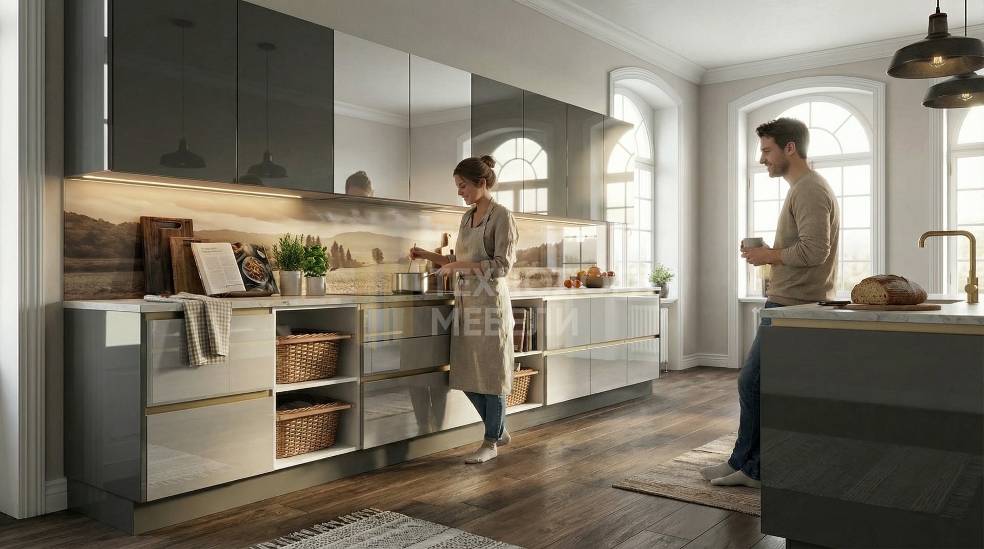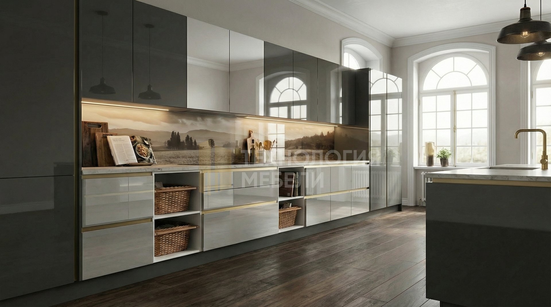 Классическая кухня длиной 3.0 м представляет собой воплощение изысканности. Корпус выполнен из металла в белом цвете. Фасады фрезерованные, глянцевые, цвета графит, со вставками из зеркала серебро. Открываются распашным способом с системой Push-to-open, что позволяет отказаться от ручек. Материал столешницы – натуральный камень с матовой фактурой, цвет мрамор. Рабочая зона оснащена LED-подсветкой. Фартук из закаленного стекла с фотопечатью. В дизайне использованы элементы ротанга. Кухня имеет форму с островком. Верхние модули стандартной высоты дополнены открытыми полками. Это идеальное решение для создания стильного и функционального пространства.