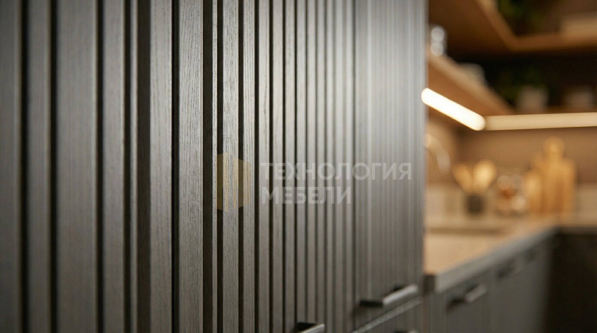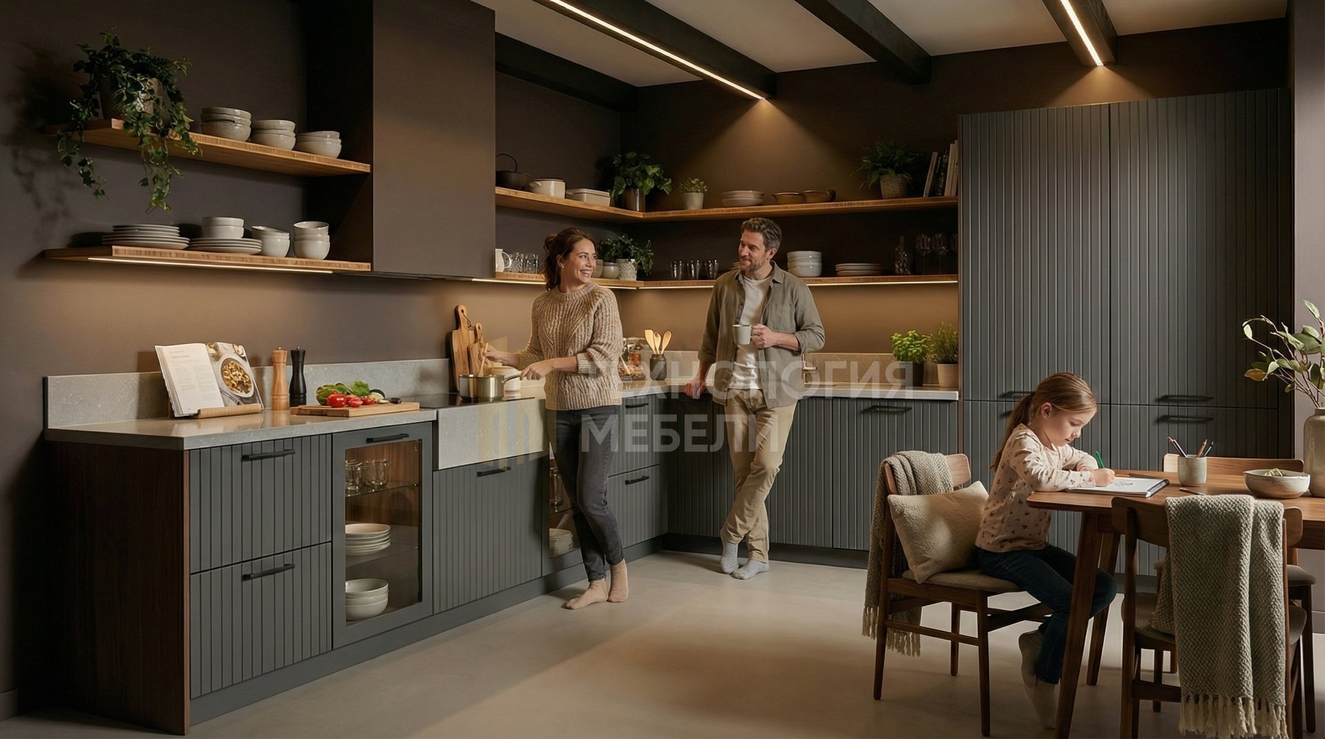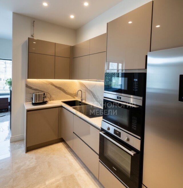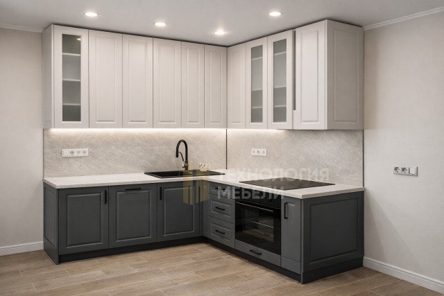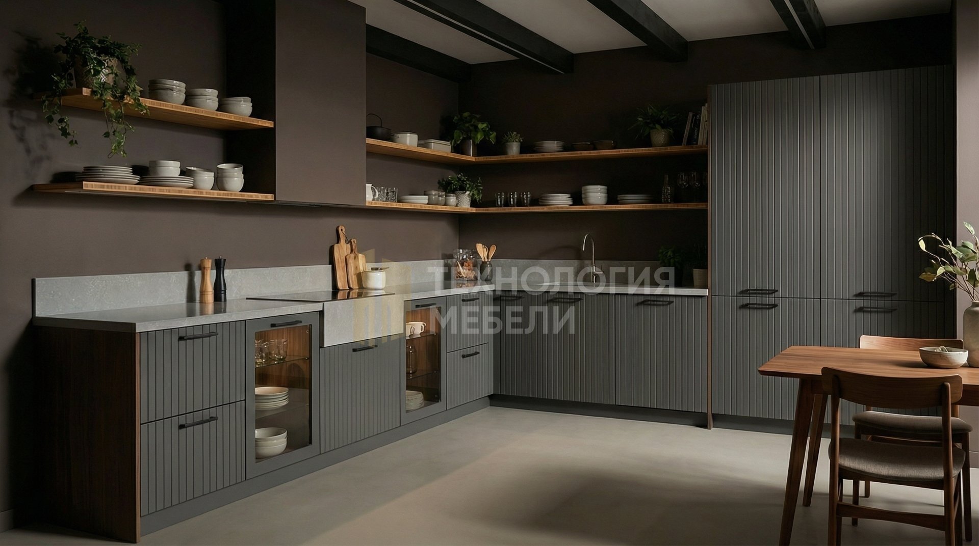 Кухня Эстелла, воплощение лофт-стиля, Г-образная, 2.4 м. Корпус МДФ в тёмно-коричневом цвете. Фасады из МДФ под эмалью графит, фрезерованные вертикально, со стеклом в профиле, распашные, с ручками-скобами. Верхние модули отсутствуют, открытые полки создают простор. Столешница из светло-серого натурального камня с глянцевой фактурой. Фартук — серый матовый керамогранит. Среди материалов: бамбук, композиты, лак/эмаль, зеркальные панели. Общая LED подсветка присутствует (рабочая зона без подсветки). Отсутствие кухонного острова обеспечивает лаконичность. Эта кухня идеально подойдет для ценителей современного дизайна и изысканных решений.