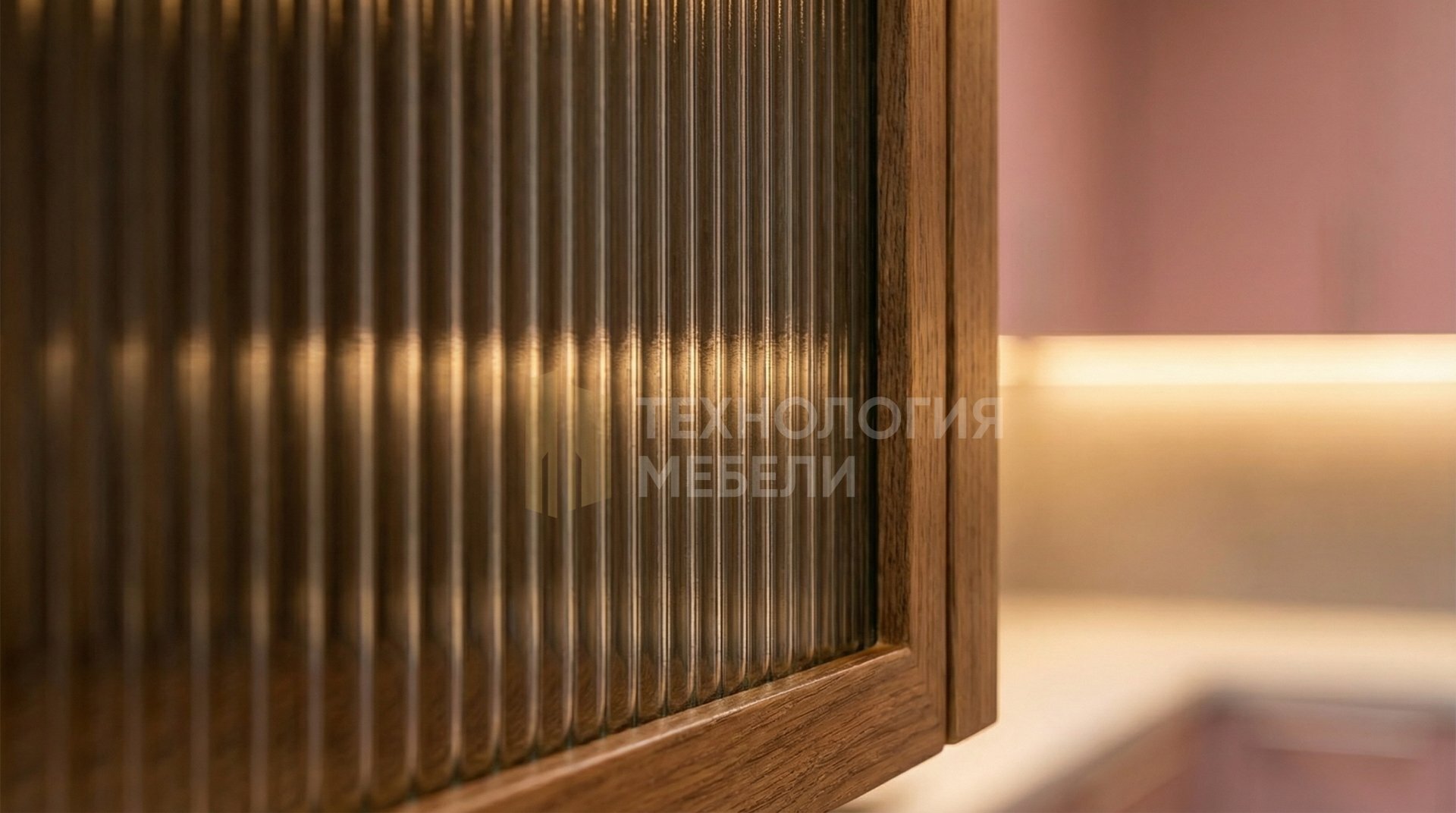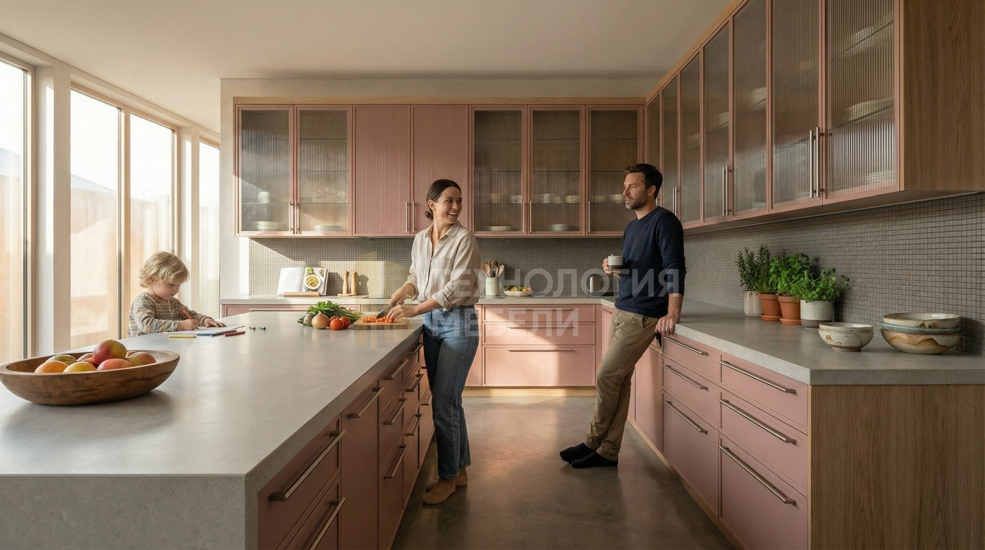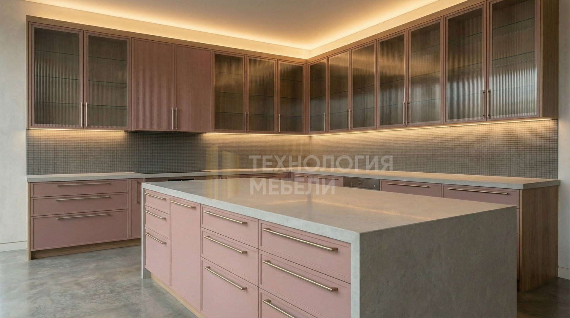 Эта модульная кухня, выполненная в современном стиле, где прочные металл и композитные материалы обеспечивают ее долговечность. Фасады из стекла с фрезерованной вертикальной фактурой окрашены в нежный цвет пыльной розы, придавая интерьеру изысканность. Корпус изготовлен из влагостойкого ДСП оттенка дуб вотан. Г-образная форма кухни идеально подходит для просторных помещений длиной более 4.5 метров, дополненных функциональным кухонным островом. Столешница из натурального камня светло-серого цвета имеет матовую фактуру, гармонируя с фартуком из мозаики в сером матовом оттенке. Удобные ручки-скобы и выдвижные ящики обеспечивают высокую эргономичность. Рабочая зона оснащена светодиодной лентой для комфортной подсветки. Верхние модули стандартной высоты без открытых полок поддерживают минималистичный дизайн.