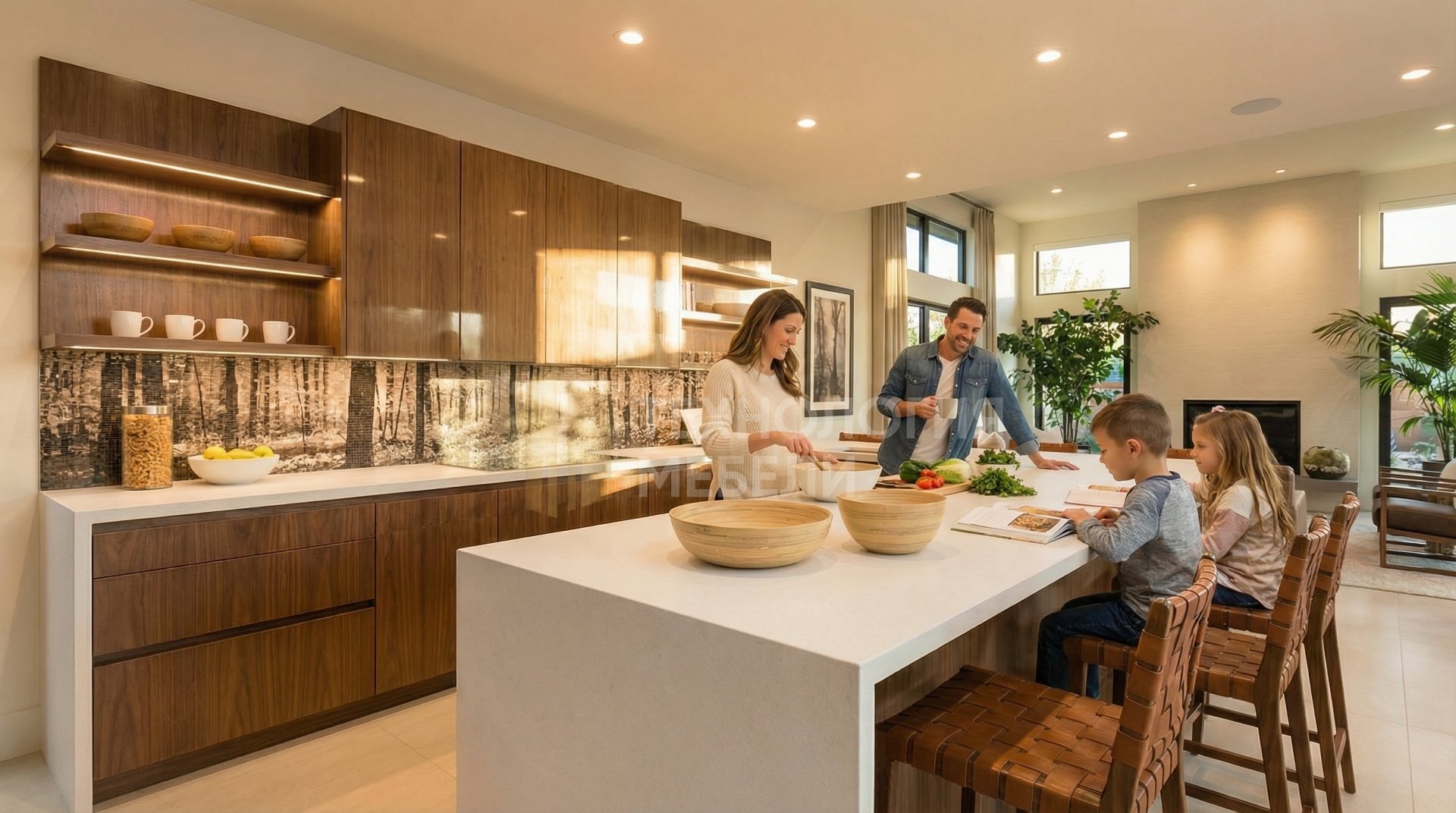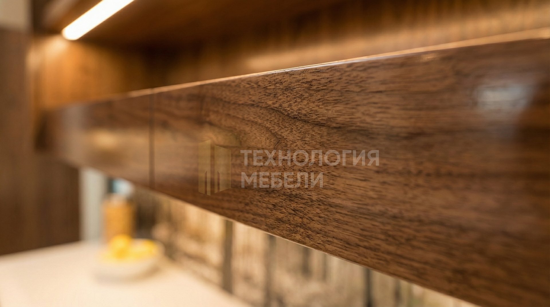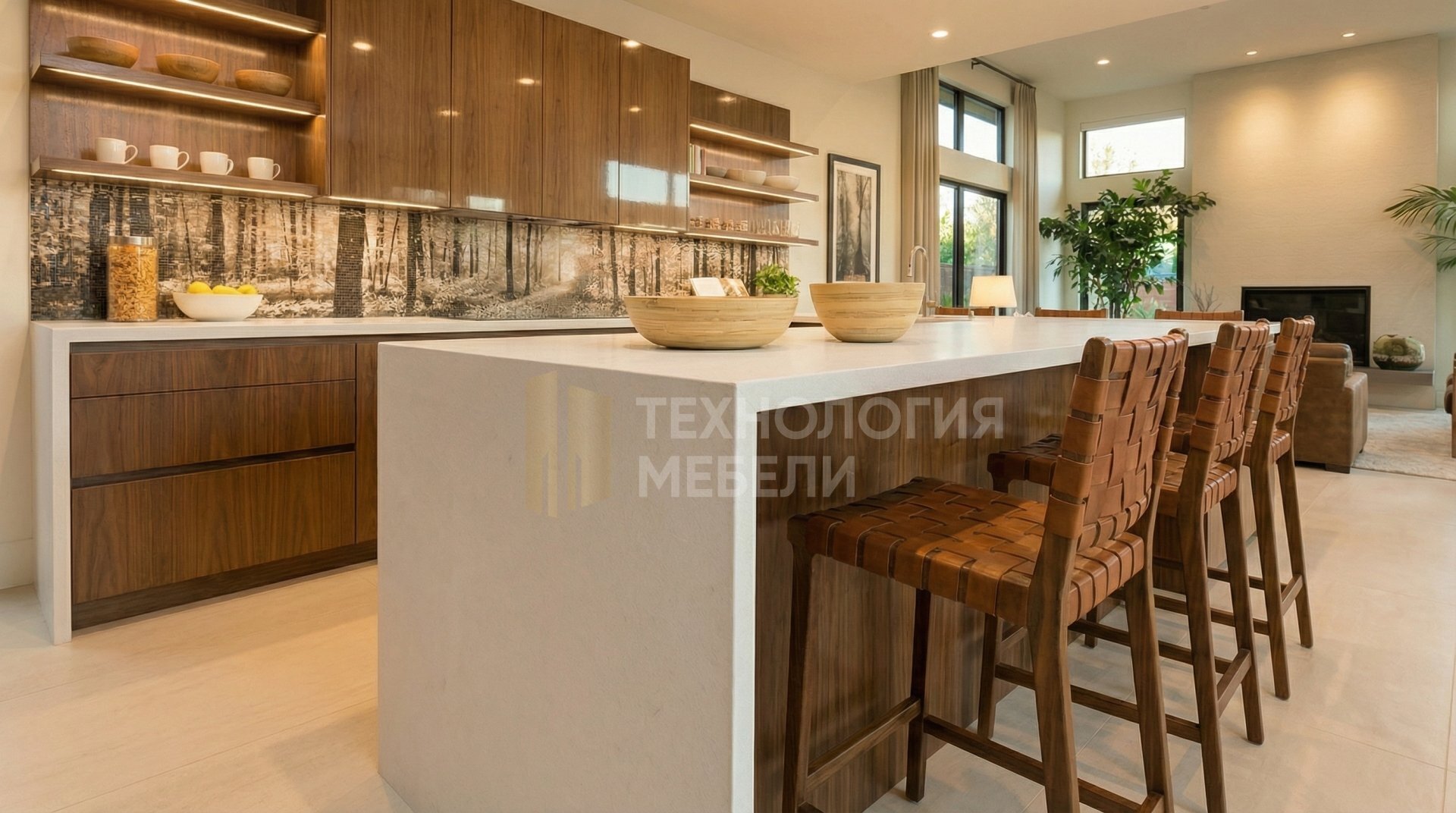 Представляем угловую кухню в стиле Модерн, длиной более 4.5 м. Плоские глянцевые фасады из эмали цвета Натуральный орех, без ручек, оснащены подъемными механизмами. Корпус из влагостойкого ДСП в Тёплом орехе. Столешница – текстурированный акриловый камень Белый матовый. Фартук из мозаики с фотопечатью. Подсветка рабочей зоны отсутствует, но предусмотрена светодиодная лента. Верхние модули стандартной высоты, есть открытые полки. Кухонный остров не предусмотрен. В дизайне используются МДФ, кожа, бамбук. Сочетание Натурального и Тёплого ореха с Белым матовым и фотопечатью создает гармоничный и функциональный интерьер, идеально для современного дома.