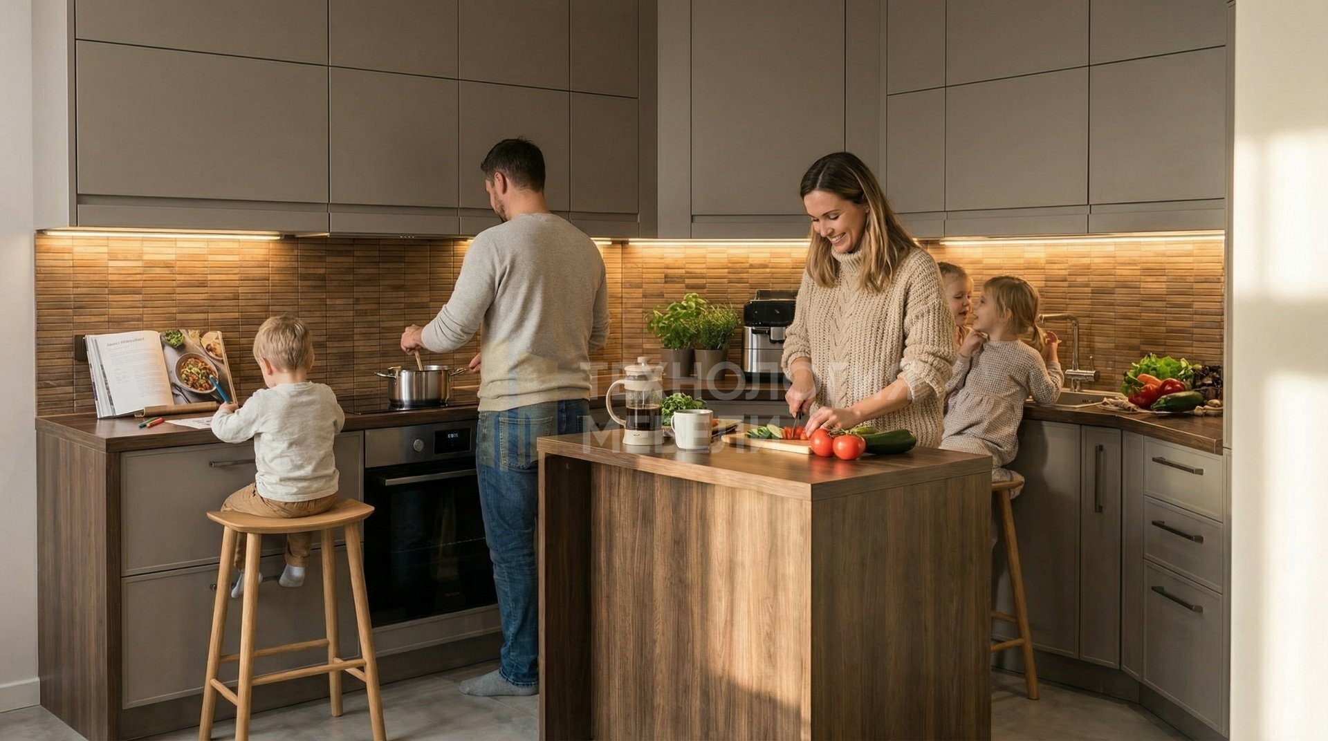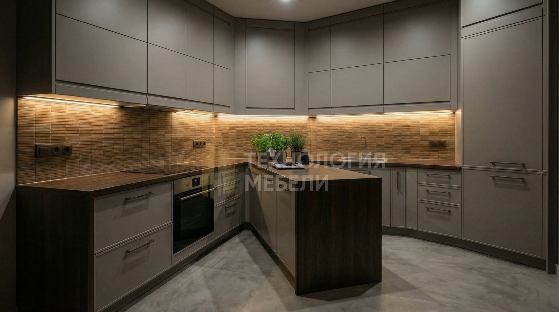 Г-образная кухня длиной 1.2 м в стиле хай-тек. Корпус из влагостойкого ДСП в сером цвете. Фасады из пластика, фрезерованные, с гладкой фактурой, представлены в матовом кашемировом оттенке. Глянцевая столешница из МДФ выполнена в тёмно-коричневом цвете. Фартук из мозаики "под дерево" придает интерьеру теплоту. Рабочая зона оснащена LED-подсветкой. Верхние модули до потолка, без открытых полок, создают цельный и минималистичный вид. Ручки-скобы и подъемный механизм обеспечивают удобство. Функциональный кухонный остров дополняет пространство. В производстве использованы массив дерева, ДСП, стекло, ЛДСП, микроцемент. Цветовая палитра: серый, "под дерево", тёмно-коричневый, кашемир матовый – гарантия долговечности и стиля.