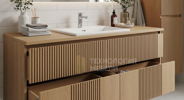 Тумба для ванной «Флорен» – это изысканное воплощение стиля Современный модерн, разработанное для тех, кто ценит безупречный дизайн и высокую функциональность в каждом элементе интерьера. Фасады тумбы выполнены из МДФ с премиальным покрытием под дерево, что придает им эстетику натурального дерева и матовую фактуру, приятную на ощупь и устойчивую к загрязнениям. Корпус, изготовленный из влагостойкого ЛДСП, обеспечивает надежность и долговечность изделия в условиях повышенной влажности ванной комнаты. Дизайн фасадов отличается реечным исполнением и полным отсутствием ручек, создавая минималистичный и чистый образ. Открытие ящиков происходит с помощью современной системы, скрытой за фасадами. Функционал тумбы включает удобные выдвижные ящики, оснащенные высококачественной фурнитурой Blum с доводчиками, гарантирующими плавное и бесшумное закрывание. Столешница из массива дерева, обработанная влагостойким составом, подчеркивает природную красоту и практичность, а ее дизайн предусматривает установку накладной раковины. Для удобства монтажа тумба имеет готовое отверстие под сифон. Напольная установка обеспечивает стабильность и легкость в размещении. Матовая фактура как фасадов, так и корпуса в цвете натурального дерева, а также в оттенках Натуральный дуб (#8B6A4F) и Тёплый орех (#6B4A2F), создает теплую и уютную атмосферу. Отсутствие открытых полок поддерживает строгий и упорядоченный внешний вид. «Флорен» гармонично сочетает в себе красоту МДФ, ЛДСП и натурального шпона, становясь центральным элементом вашей ванной комнаты.