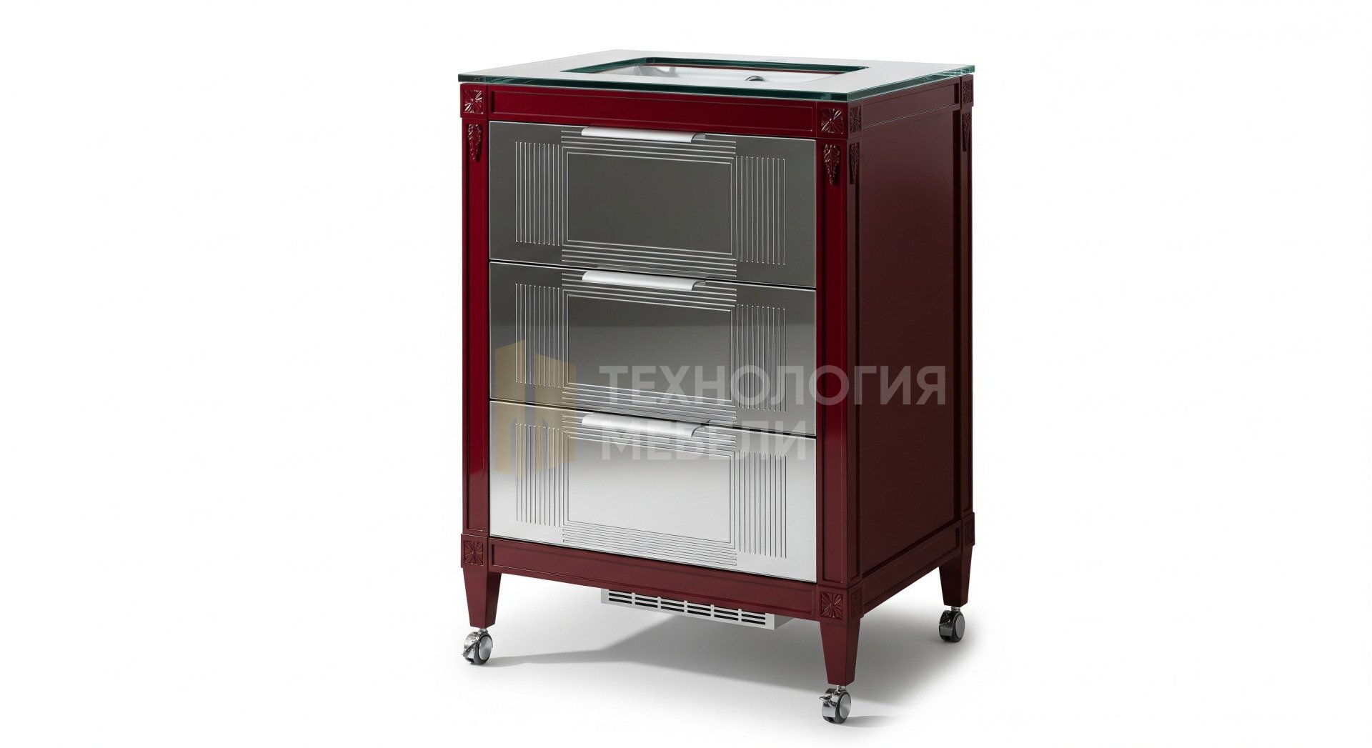 Тумба «Флорента» - барокко с нотами неоклассики. Металлический корпус антрацит, фасады — зеркальное полотно серого цвета с фрезерованной вертикальной фактурой. Лак/эмаль в палитре красного бордового и светлого алюминия. Три ящика на шариковых направляющих, торцевые ручки, стеклянная столешница. Узкая (до 30 см), на декоративных ножках 10 см и колесиках. Для ванной и к односпальной кровати, с вентиляцией.