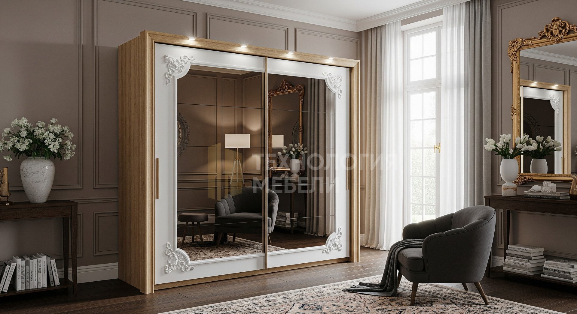 Шкаф-купе "Флоренто" – классический, с чертами барокко и скандинавского исполнения. Корпус ЛДСП Kronospan 16мм (черный/светлый дуб), частично встроенный, Г-образный, глубокий (>700мм), без задней стенки. Фасады: зеркало графит/бронза в широком классическом профиле белый глянец. Две компланарные двери с доводчиками. Внешний козырек с лампами. Наполнение под заказ (корзины, брючницы), без ящиков. Пантограф, обувница. Материалы: пластик, нат. шпон. Кромка ПВХ 2мм.