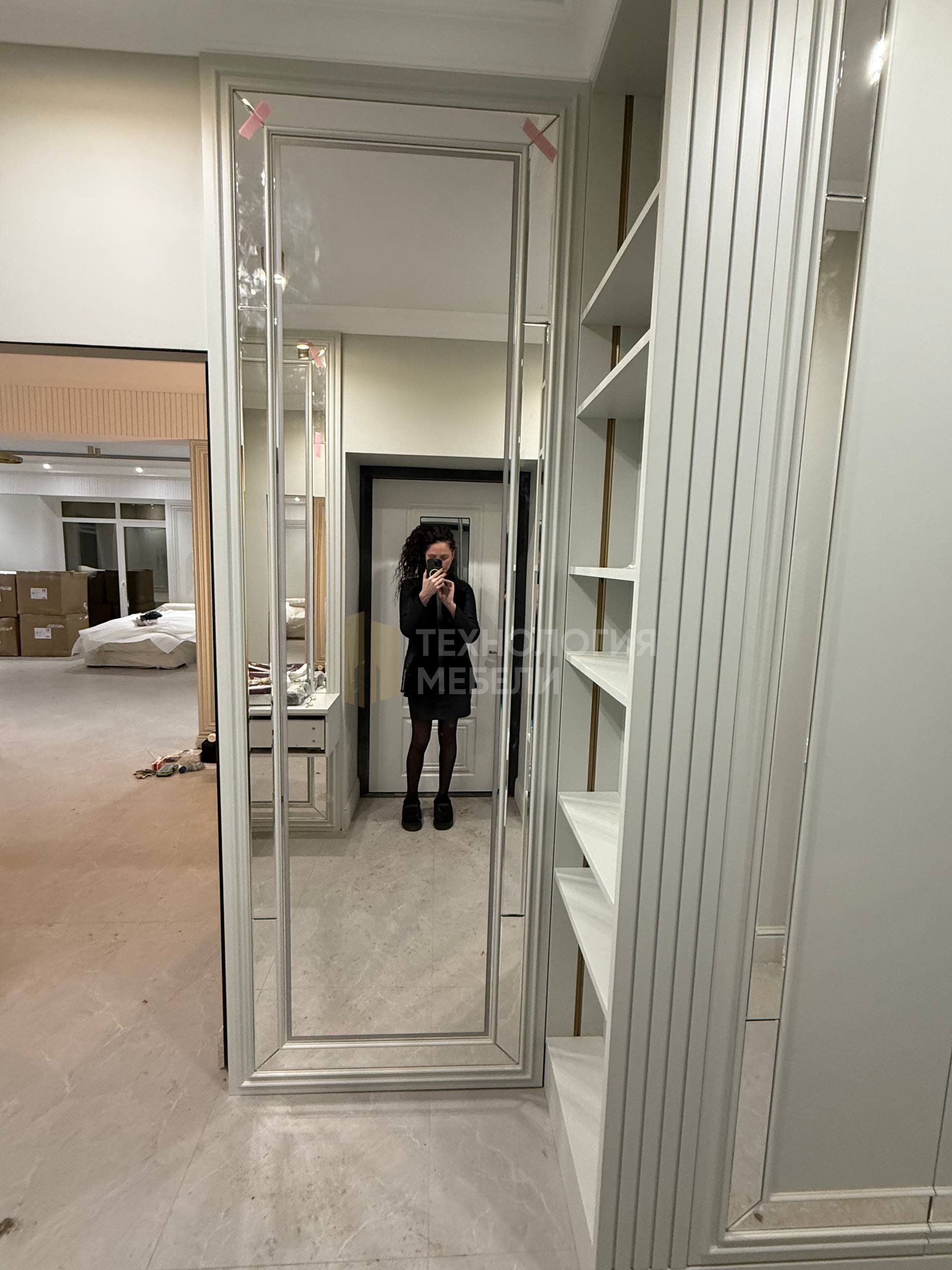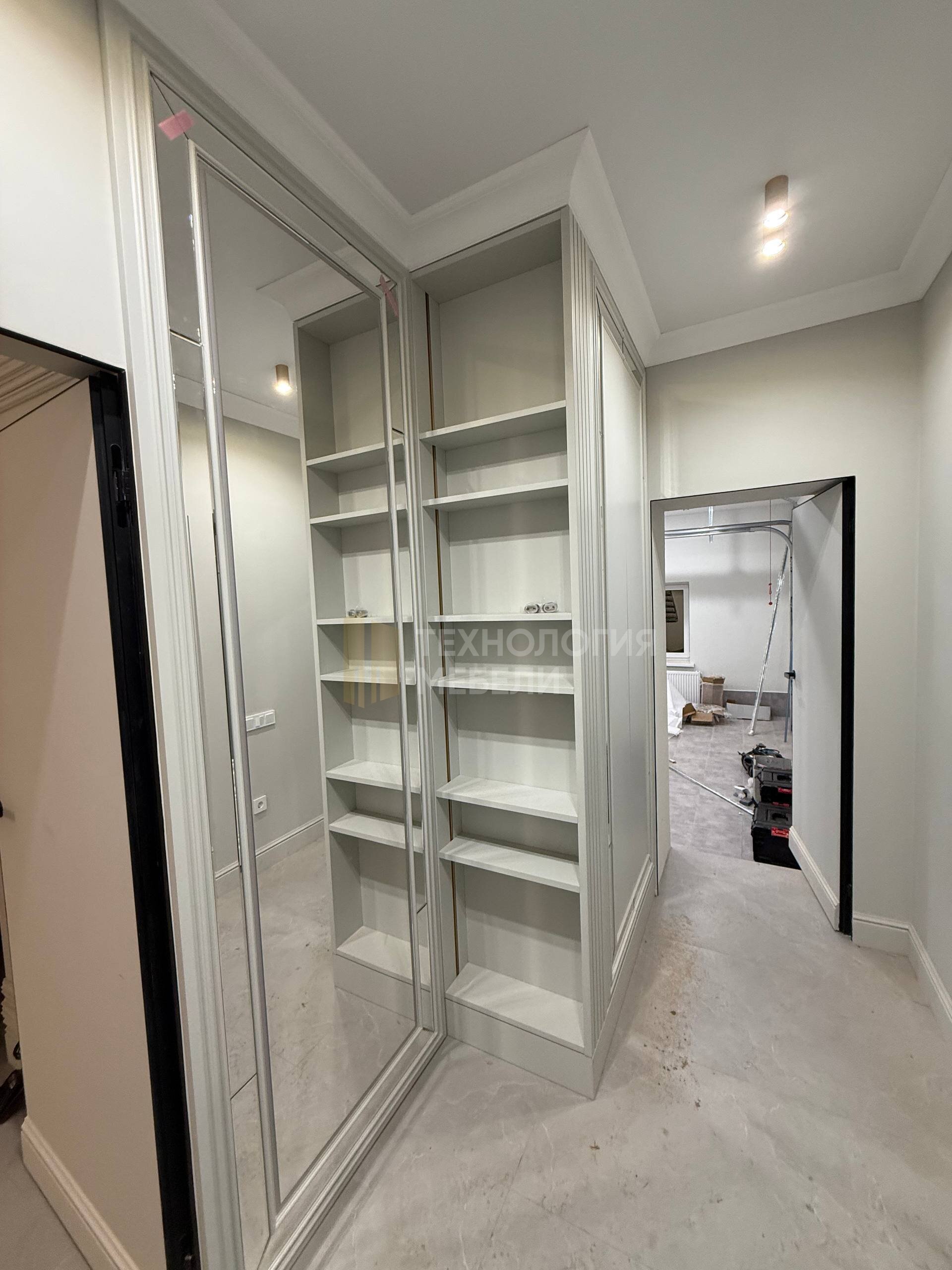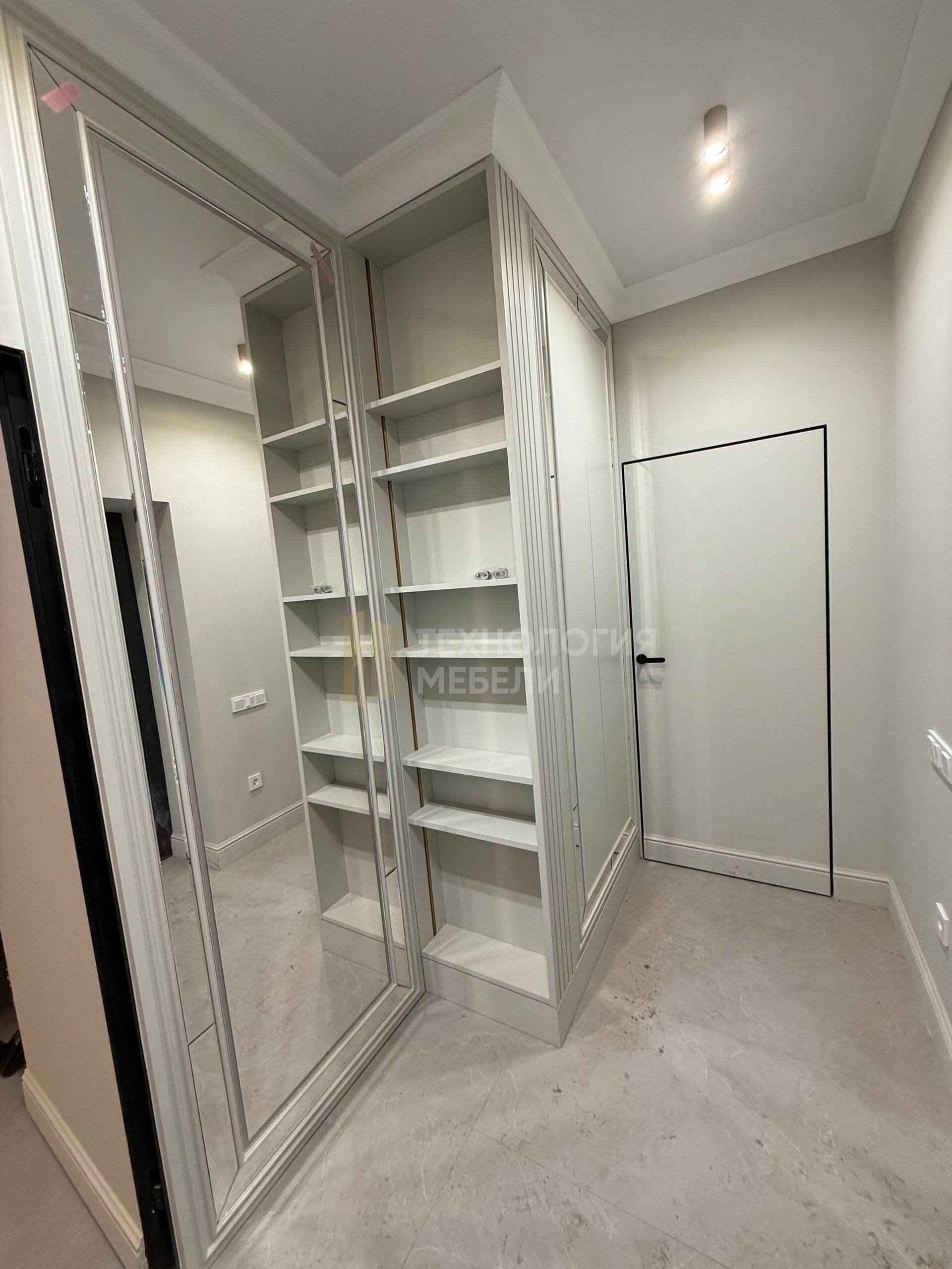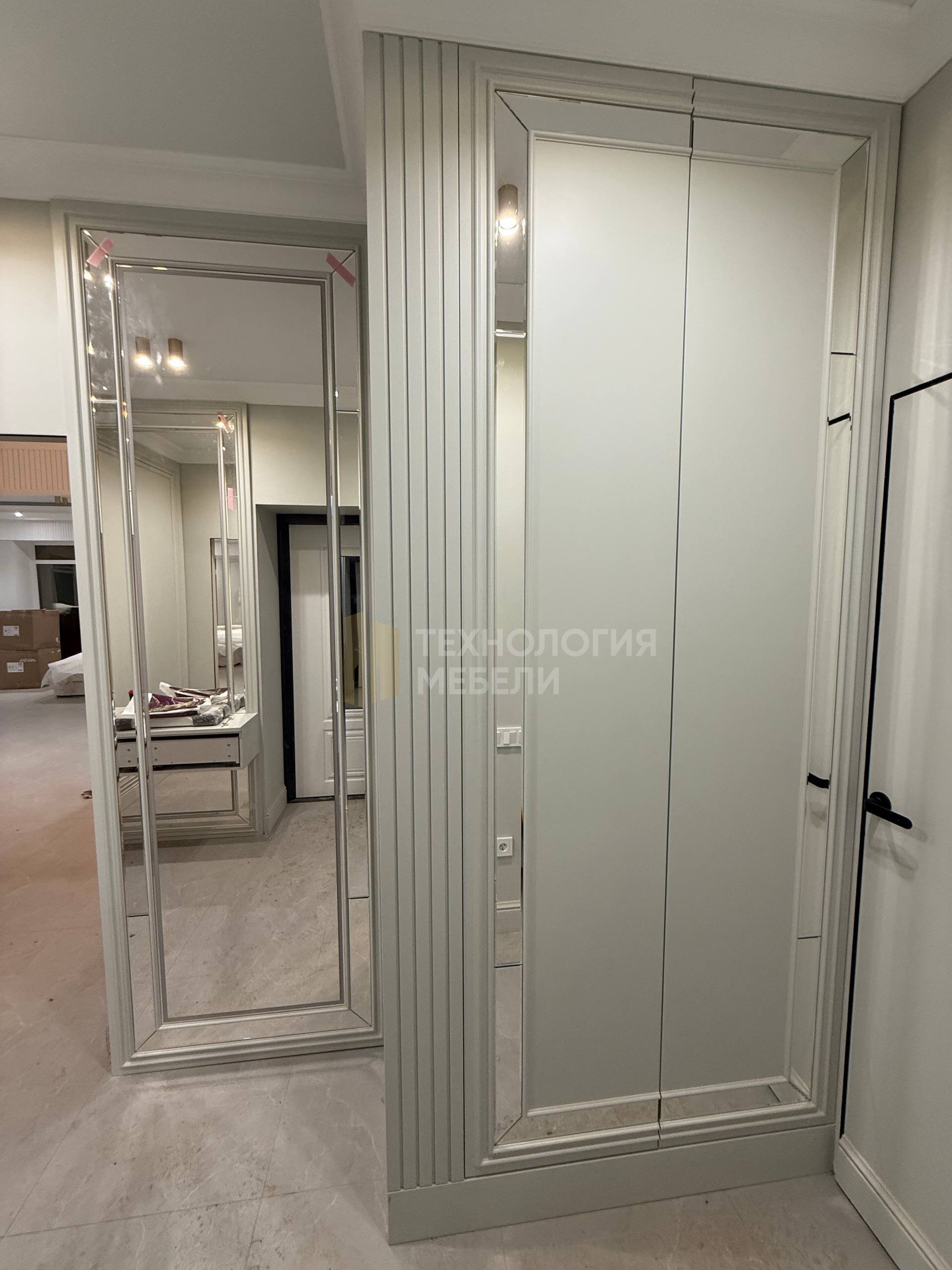 Встроенный шкаф с зеркальным фасадом и декоративным порталом Элегантный встроенный шкаф, выполненный по индивидуальному проекту, предназначен для современных интерьеров в стиле неоклассика и современная классика. Модель органично интегрируется в архитектуру помещения и становится её полноценным элементом. Шкаф изготовлен во всю высоту помещения, что обеспечивает максимальный объём хранения и визуально увеличивает пространство. Гладкие матовые фасады в светлом нейтральном оттенке подчёркивают лаконичность формы и создают аккуратный, сдержанный внешний вид. Дизайн дополнен декоративным порталом с фрезеровкой, который придаёт изделию выразительность и архитектурную завершённость. Вертикальная реечная панель служит стильным акцентом и добавляет глубину композиции. Зеркальный фасад во всю высоту расширяет пространство и повышает функциональность шкафа. Изделие изготавливается по индивидуальным размерам с точной подгонкой к стенам, полу и потолку. Возможна любая комплектация внутреннего наполнения: полки, штанги, выдвижные ящики, системы хранения. Преимущества модели: индивидуальное изготовление; установка до потолка; современные матовые фасады; зеркальные элементы; качественная фурнитура с плавным закрыванием; аккуратная интеграция в интерьер. Компания «Технология мебели» предлагает изготовление данного шкафа в различных цветах, материалах и конфигурациях с учётом особенностей вашего пространства.