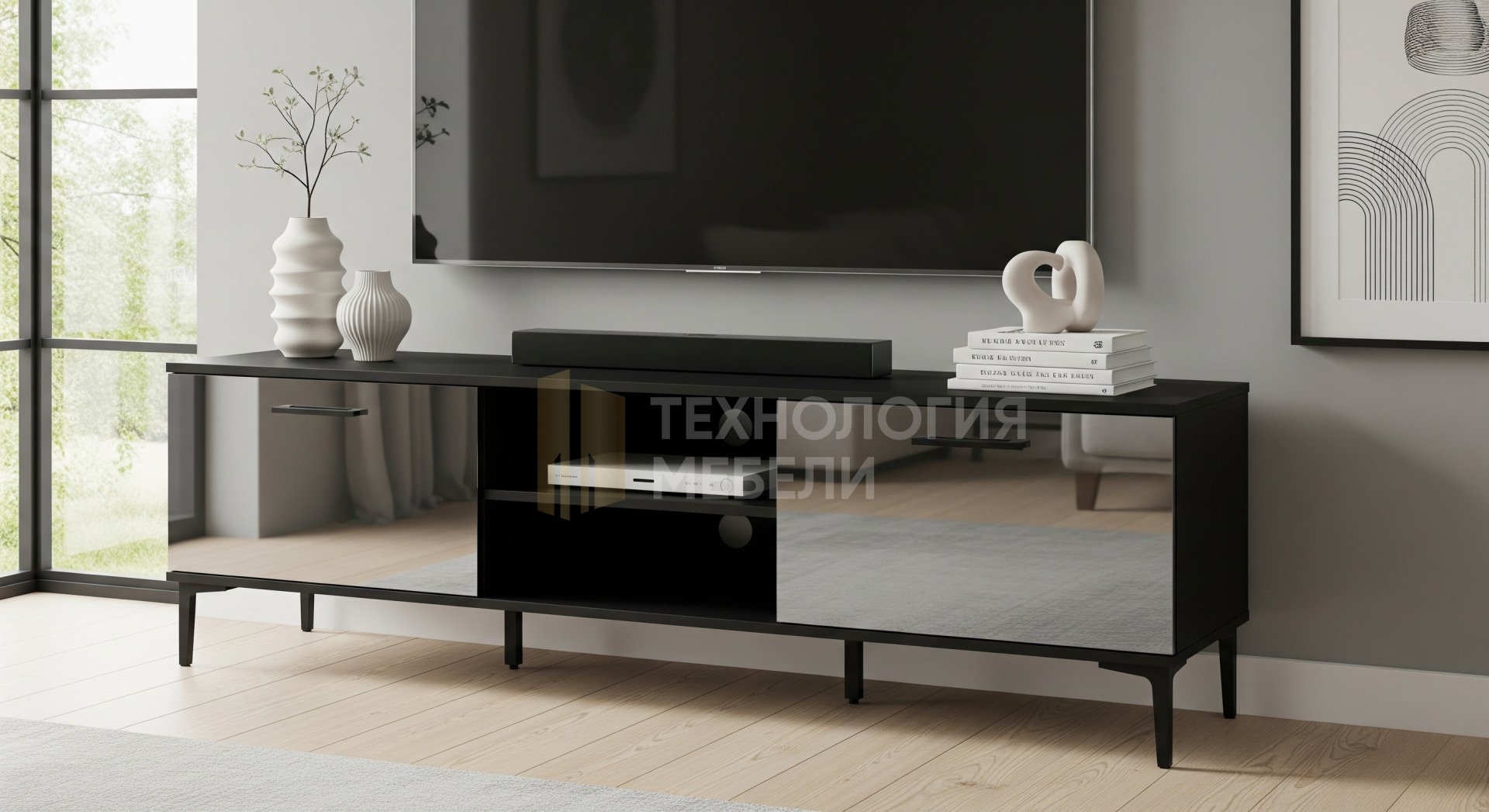 Тумба в стиле Лофт. Подвесная (консольная) конструкция с глубиной 40-45 см. Идеальна под ТВ, но также впишется в спальню или ванную. Корпус из МДФ черного цвета. Фасад – глянцевое зеркальное полотно графитового оттенка с накладными ручками. Столешница из ЛДСП. Внутреннее пространство с полками, без ящиков. Оснащена кабель-каналом для удобства. Практичное и стильное решение.