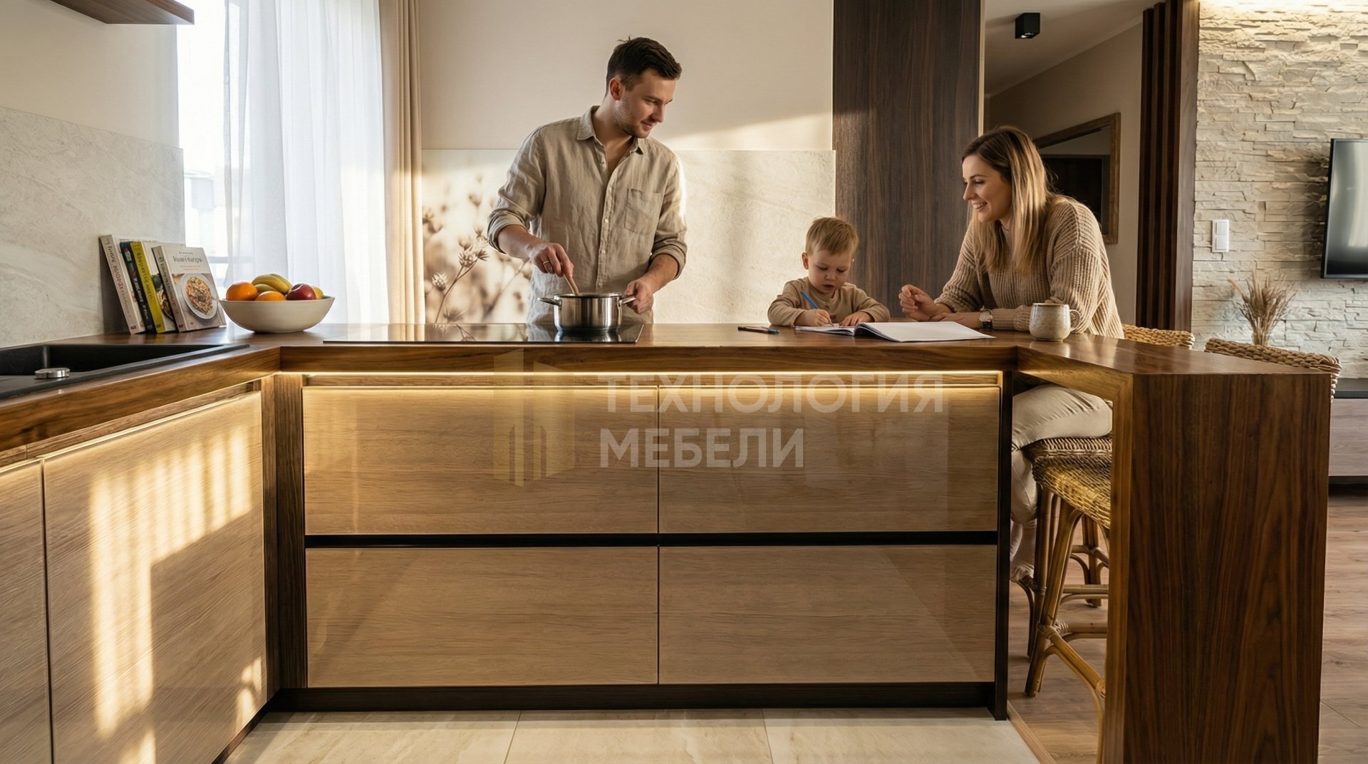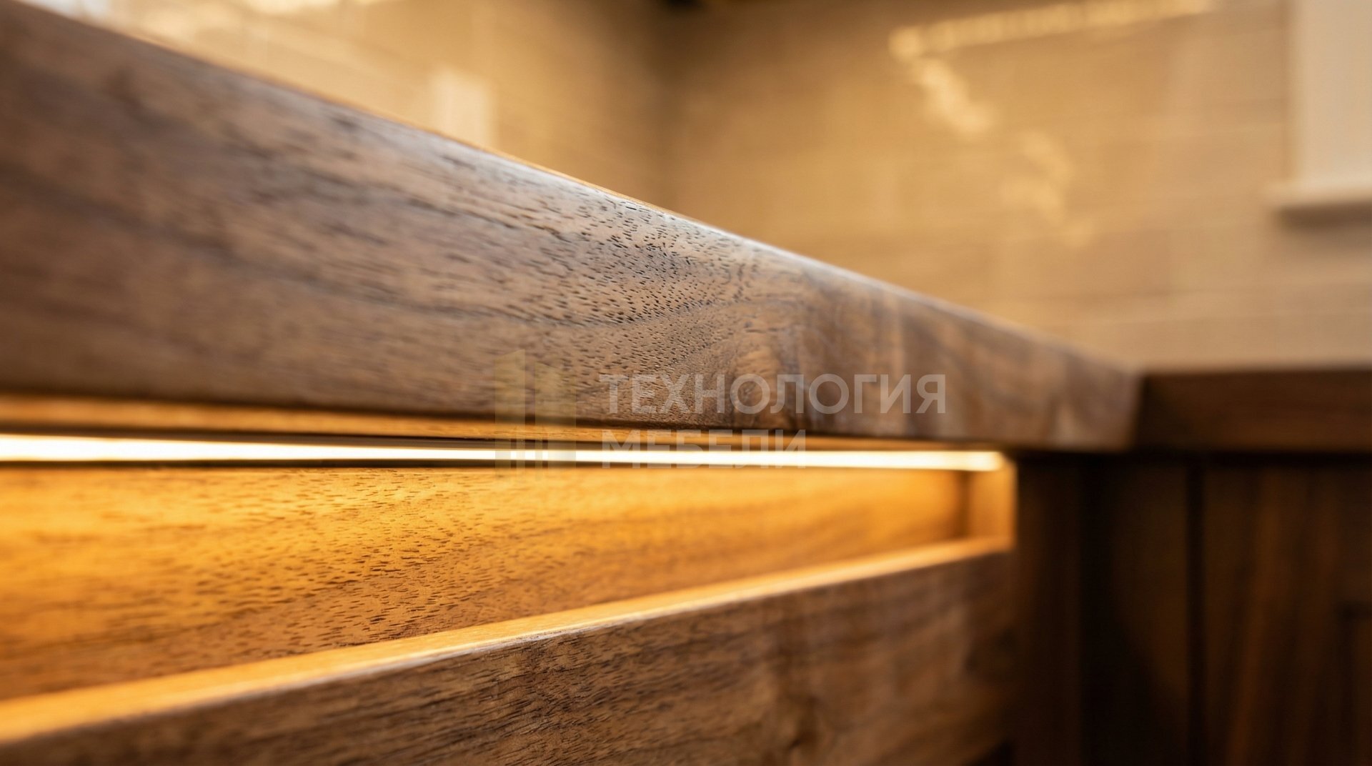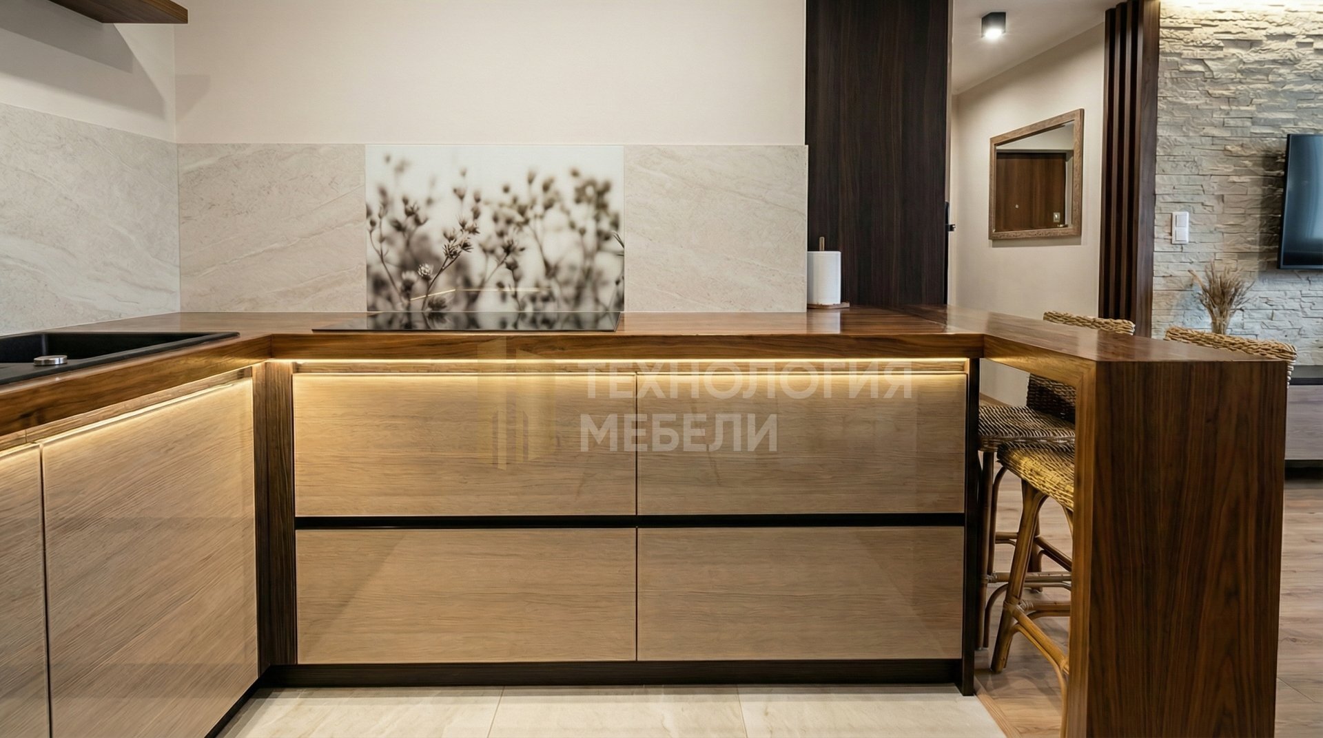 Элегантная кухня в стиле модерн, прямая, длиной 1.8 м. Корпус выполнен из ЛДСП цвета Венге. Фасады — плоские, глянцевые, цвета "Дуб Галифакс", из стекла Лакобель, оснащены интегрированным профилем Gola для удобного выдвижного открывания. Столешница из массива дерева в тёплом ореховом цвете имеет глянцевую фактуру. Фартук из керамогранита под светлый камень украшен эффектной фотопечатью. Отсутствуют верхние модули, открытые полки и кухонный остров, формируя минималистичный и современный вид. Общая подсветка реализована светодиодной лентой, подсветка рабочей зоны не предусмотрена. Использованы ротанг, камень, шпон, зеркальные панели.