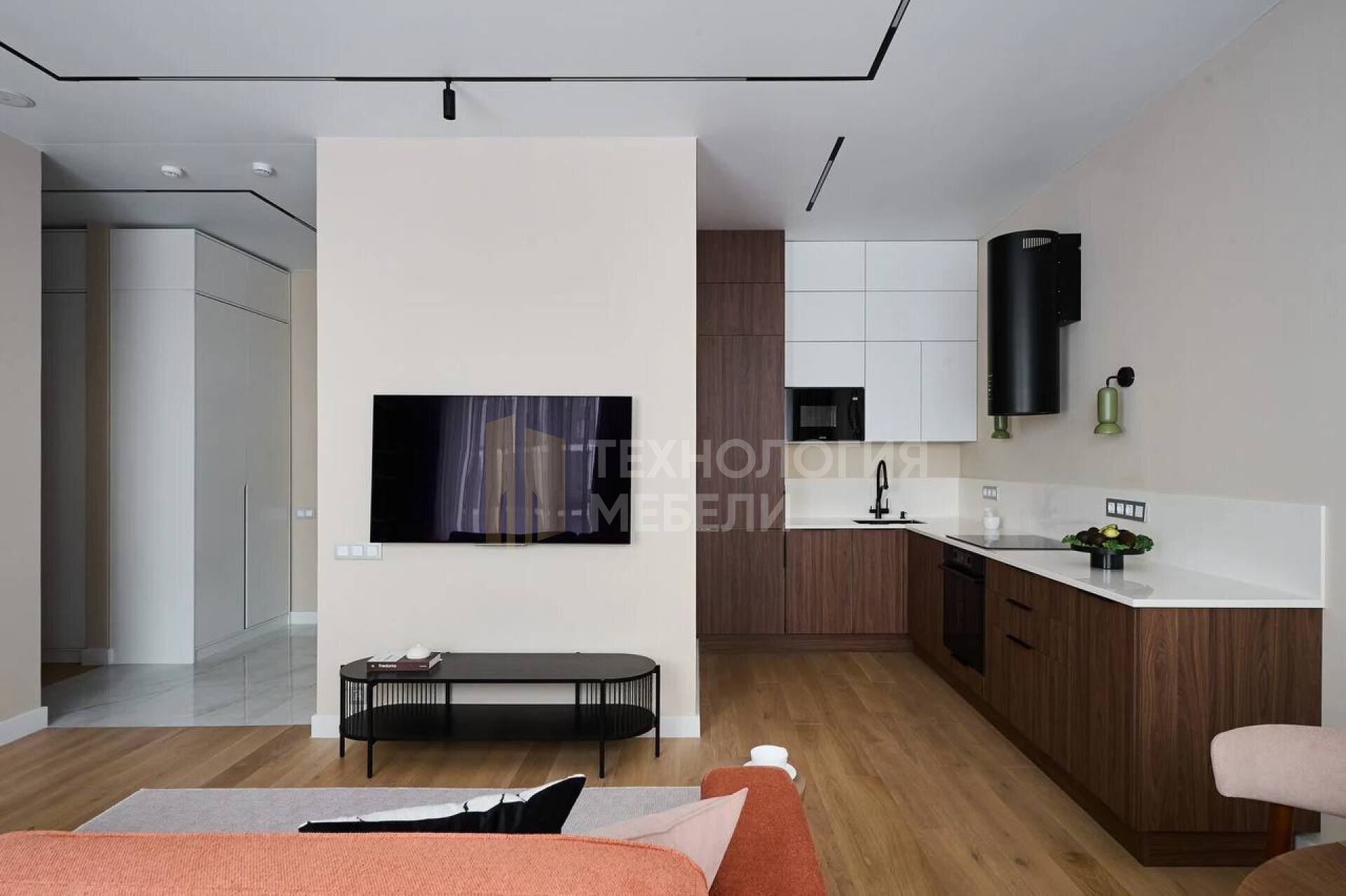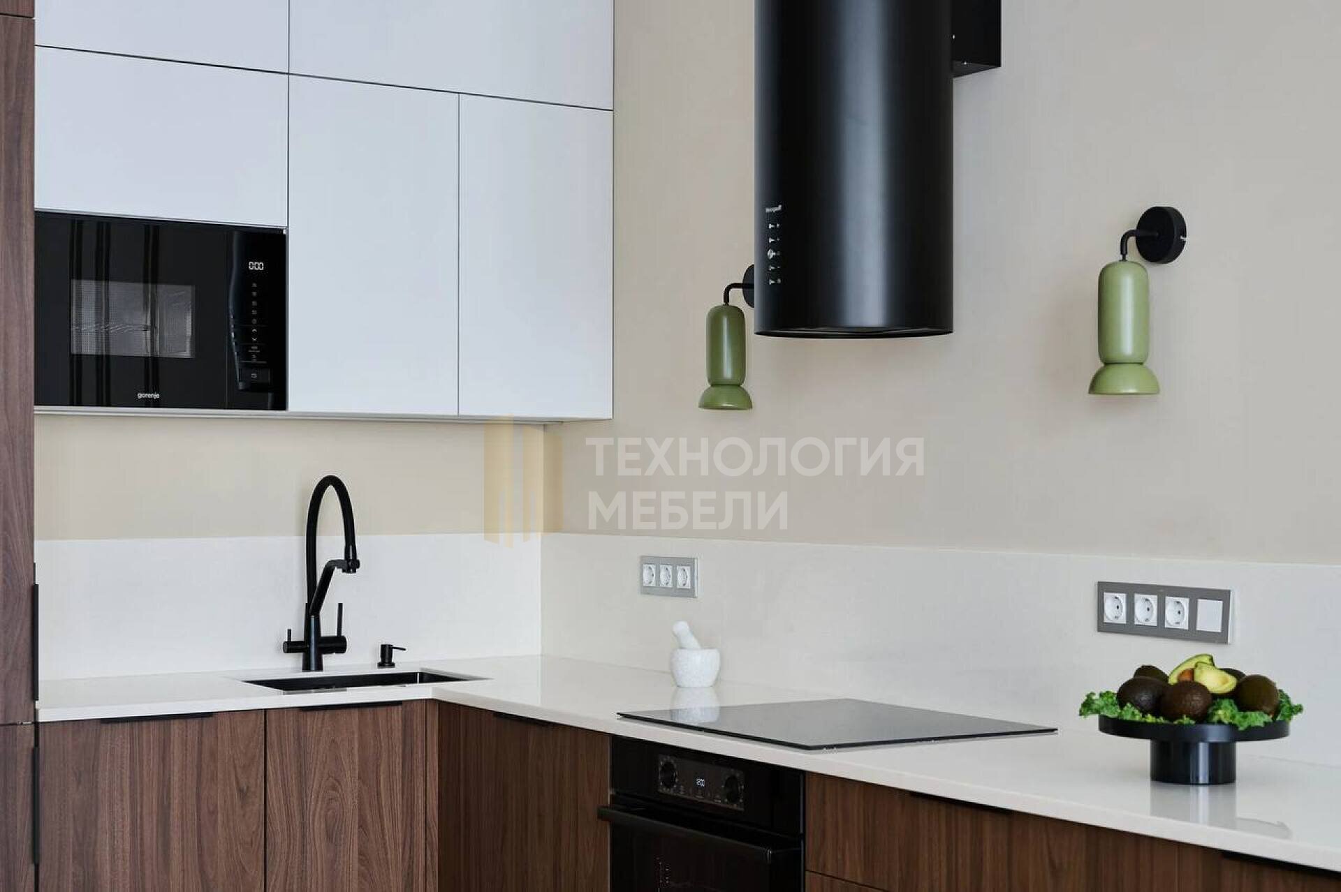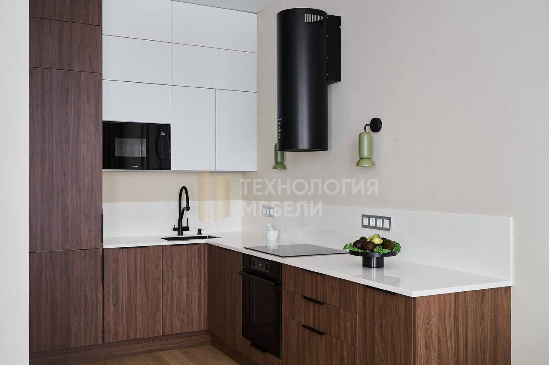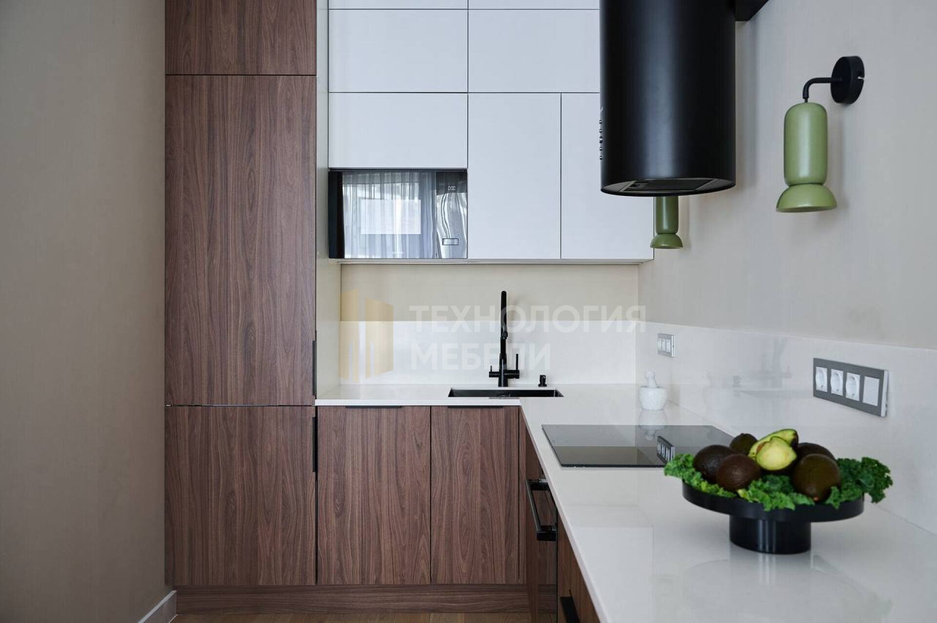 Современная кухня с пеналом и комбинированными фасадами Стильная кухня в современном минималистичном исполнении с контрастным сочетанием древесной текстуры и светлых гладких фасадов. Композиция построена с учётом эргономики и максимального использования пространства, благодаря чему кухня выглядит компактно, но остаётся функциональной и вместительной. Вертикальный пенал до потолка обеспечивает дополнительное хранение, а комбинированные фасады создают выразительный и актуальный интерьер. Светлая столешница и фартук визуально расширяют рабочую зону и делают кухню лёгкой и аккуратной. Особенности модели: Угловая компактная планировка Высокий пенал до потолка Комбинированные фасады: древесная текстура + светлые гладкие поверхности Встроенная техника в единой композиции Минималистичный дизайн без лишних деталей Удобная рабочая зона с мойкой и варочной панелью Современные акцентные элементы и освещение Рациональное использование пространства Материалы: корпус — ЛДСП повышенной прочности фасады — ЛДСП / МДФ (древесная текстура и матовые гладкие) столешница — влагостойкая под камень фартук — стеновая панель в цвет столешницы фурнитура — петли и направляющие с доводчиками Преимущества: современный актуальный дизайн вместительное хранение компактность и функциональность удобство ежедневной эксплуатации возможность изготовления по индивидуальным размерам Кухня изготавливается на заказ с подбором материалов, цветов и внутреннего наполнения под ваш интерьер и размеры помещения.