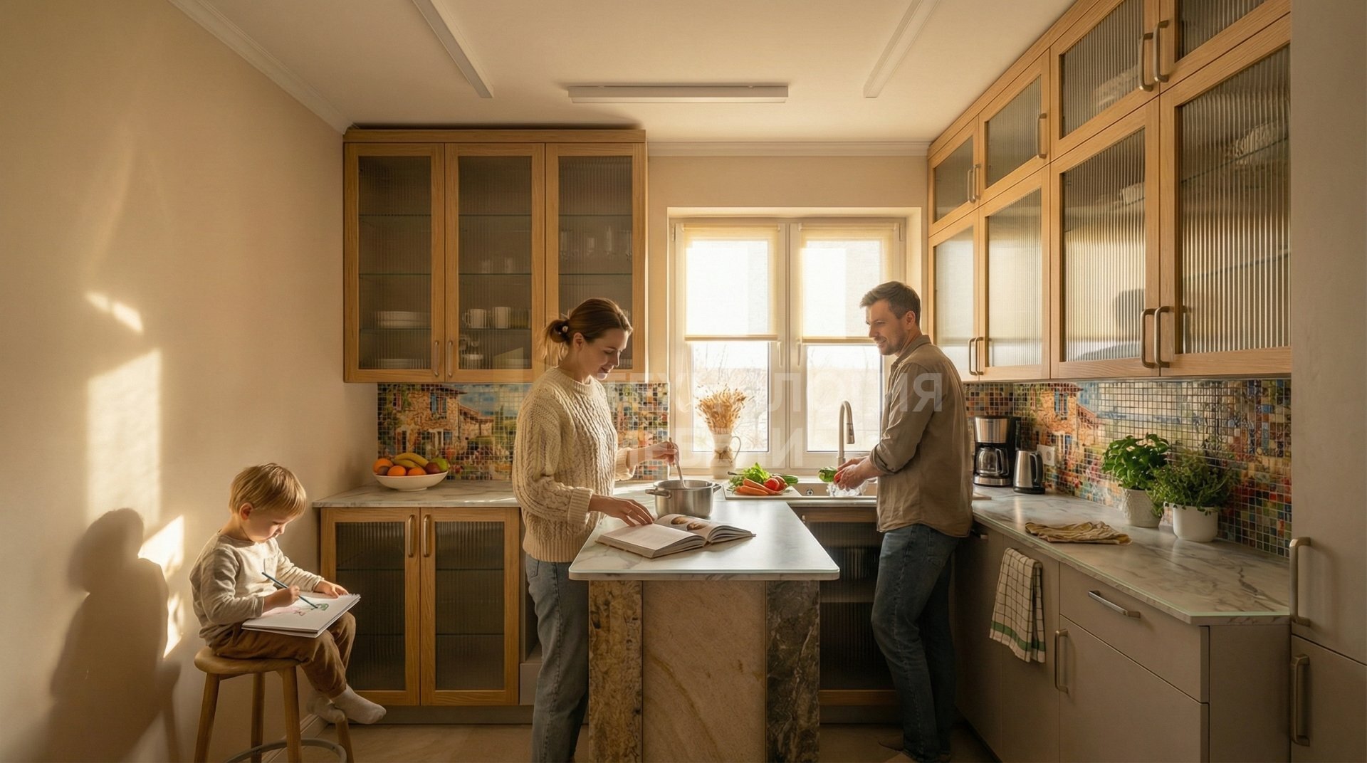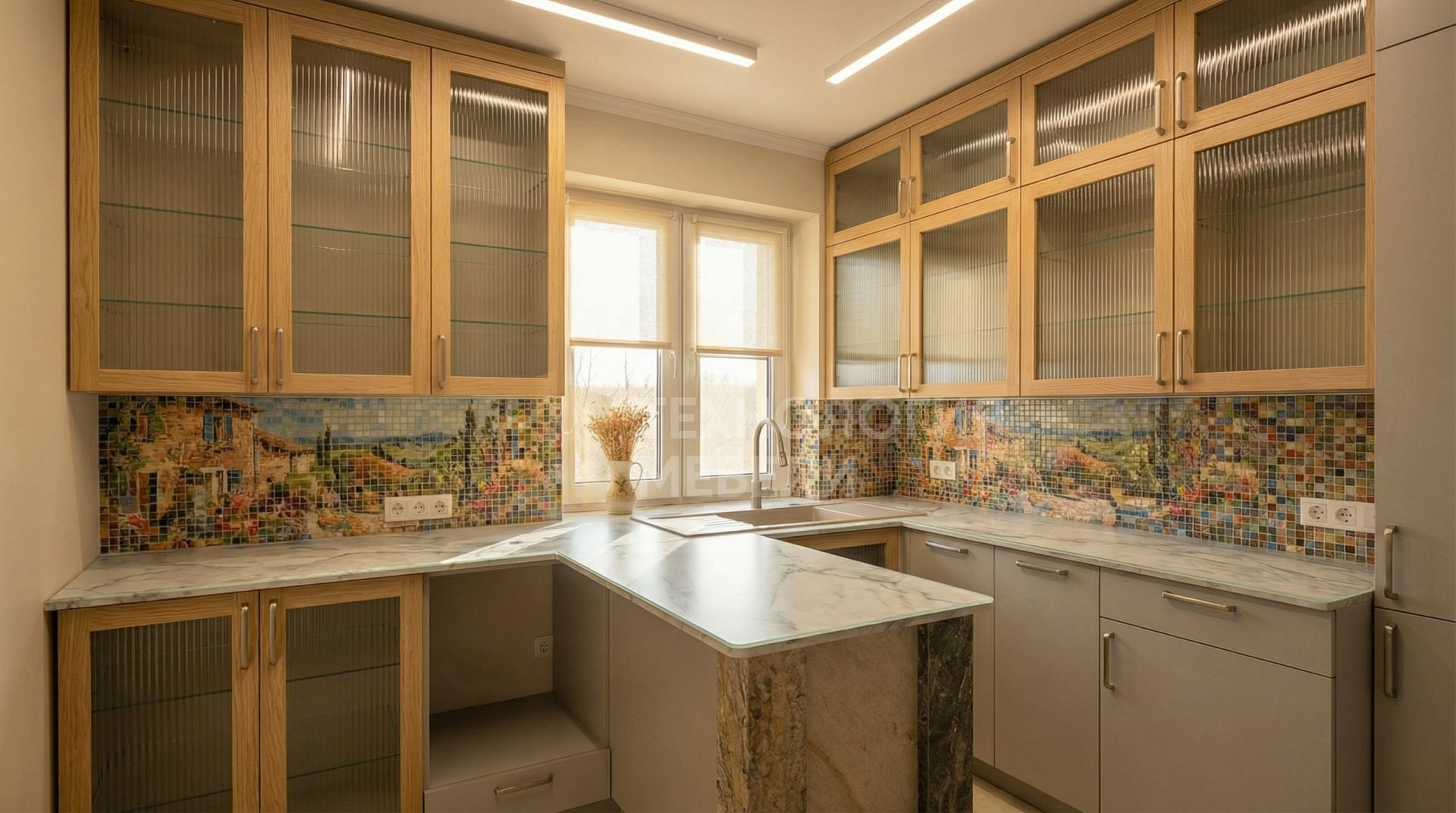 Кухня «Лавандель» в стиле Прованс – это воплощение нежности и функциональности. Спроектированная с островом, она идеально впишется в ваш дом. Корпус из влагостойкого ДСП в светло-сером цвете гармонично сочетается с рамочными фасадами из стекла Лакобель оттенка светлый дуб, дополненными вертикальной фрезеровкой и накладными ручками. Столешница из закаленного стекла с матовой фактурой имитирует мрамор, создавая атмосферу утонченности. Фартук из мозаики с фотопечатью придает уникальный акцент. Верхние модули достигают потолка, обеспечивая максимальное хранение, без открытых полок для поддержания порядка. Тип открывания – распашное. Подсветка реализована накладными профилями, создавая мягкий акцент. Длина кухни составляет 1.8 м. Эта кухня не имеет подсветки рабочей зоны, но ее дизайн компенсирует это общей атмосферой уюта.