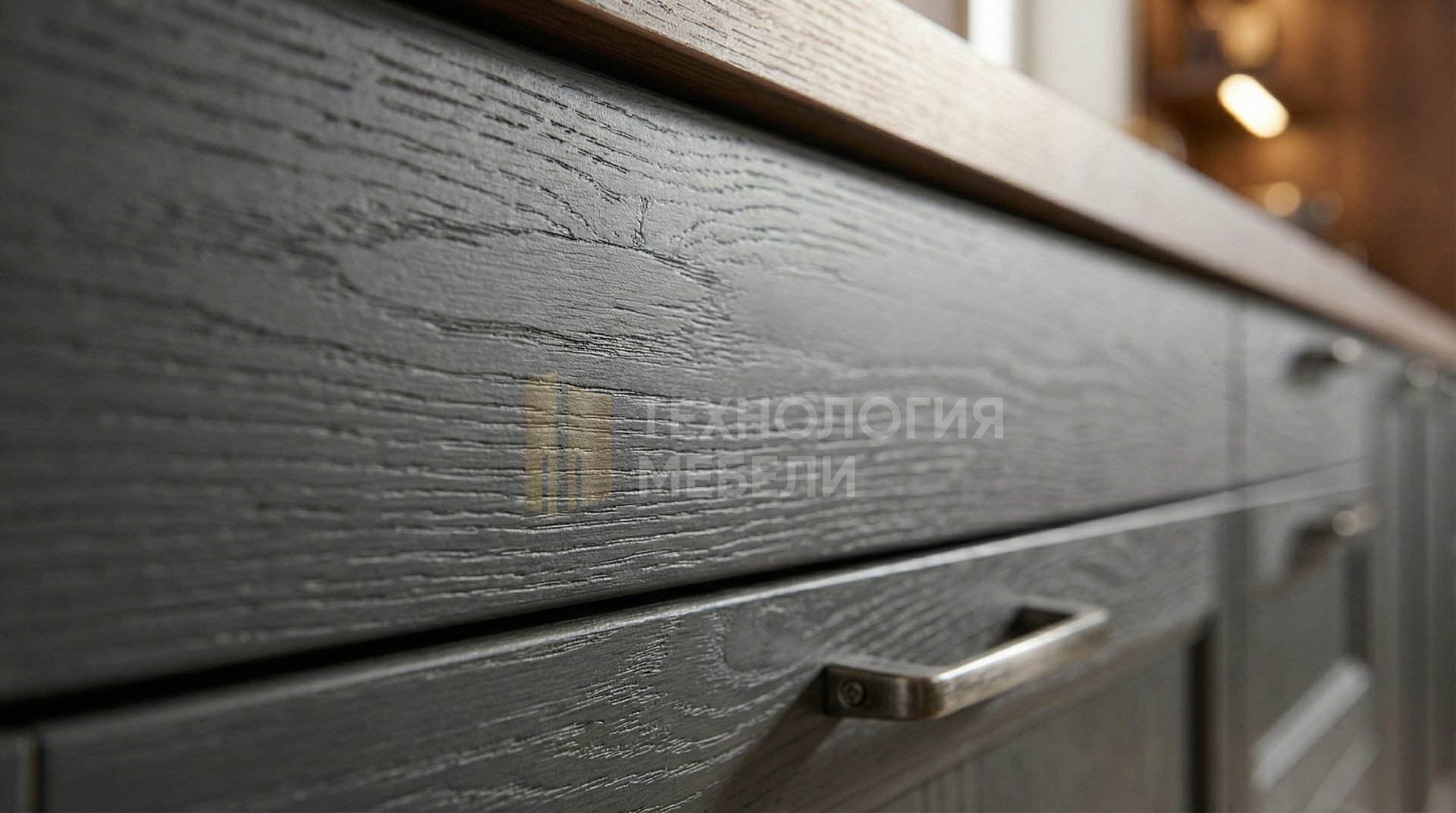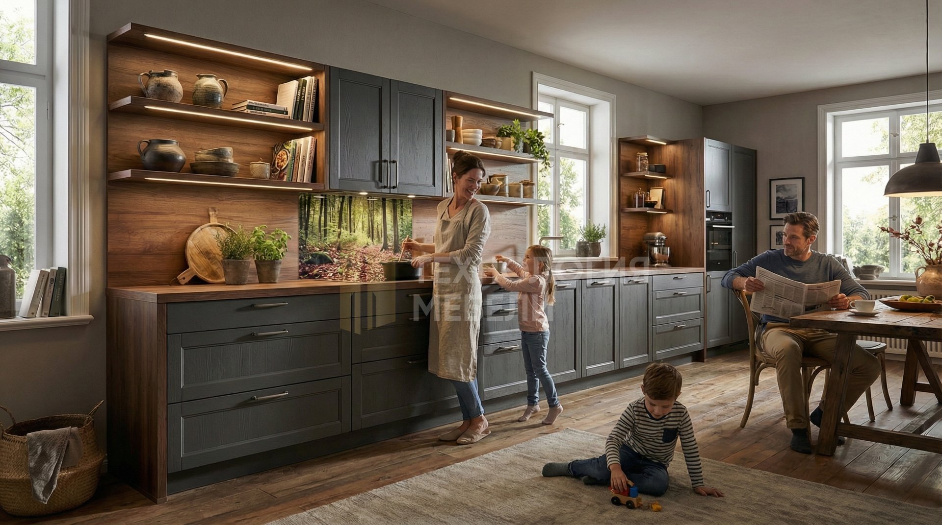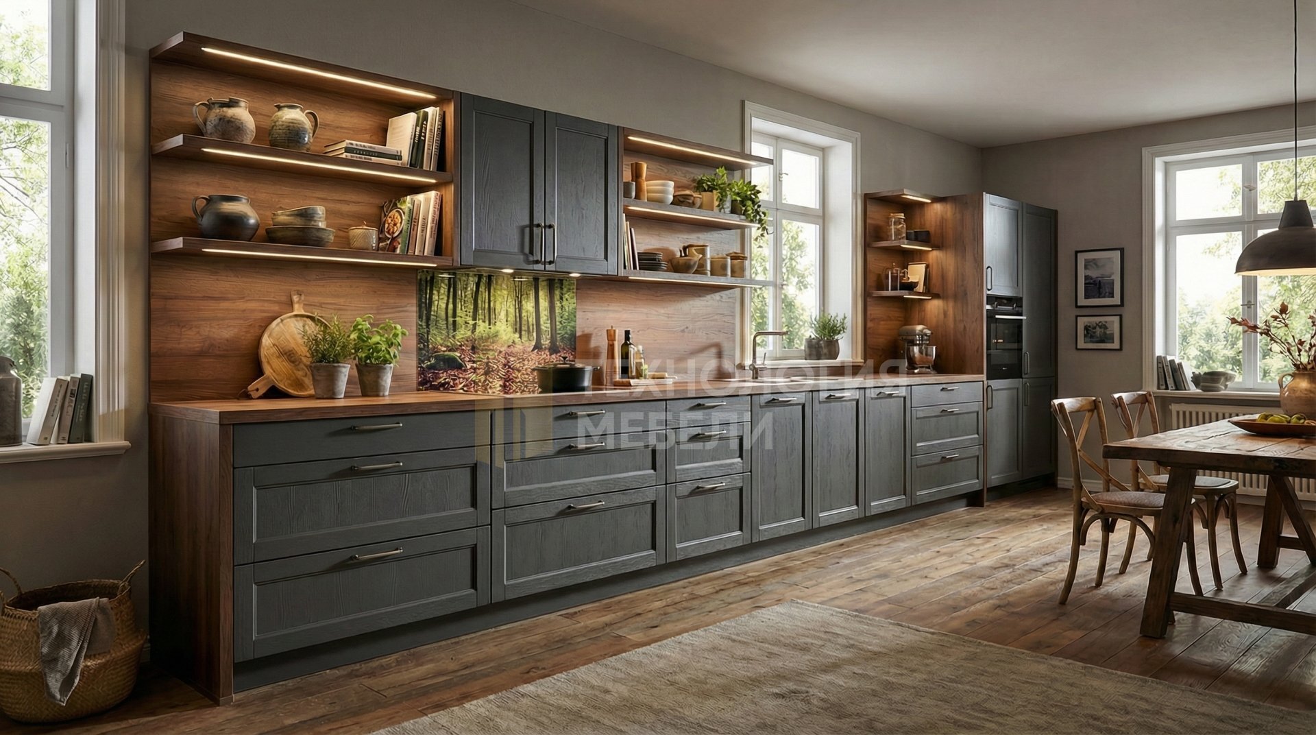 Кухня в эко-стиле "Лесная Гармония" - это прямолинейное решение длиной более 4.5 метров, созданное для ценителей природы. В основе конструкции – ЛДСП тёмно-коричневого цвета. Фасады цвета графит с фрезерованной древесной фактурой выполнены из эмали. Столешница из массива дерева цвета орех имеет текстурированную поверхность. Отсутствие верхних модулей и наличие открытых полок подчеркивают легкость. Фартук из панели МДФ под дерево с фотопечатью добавляет акцент. Накладные ручки удобны в использовании, а выдвижное открывание обеспечивает функциональность. LED подсветка рабочей зоны делает приготовление комфортным. В производстве использованы дерево, ЛДСП, шпон, а также элементы из кожи и ткани. Кухонный остров не предусмотрен.