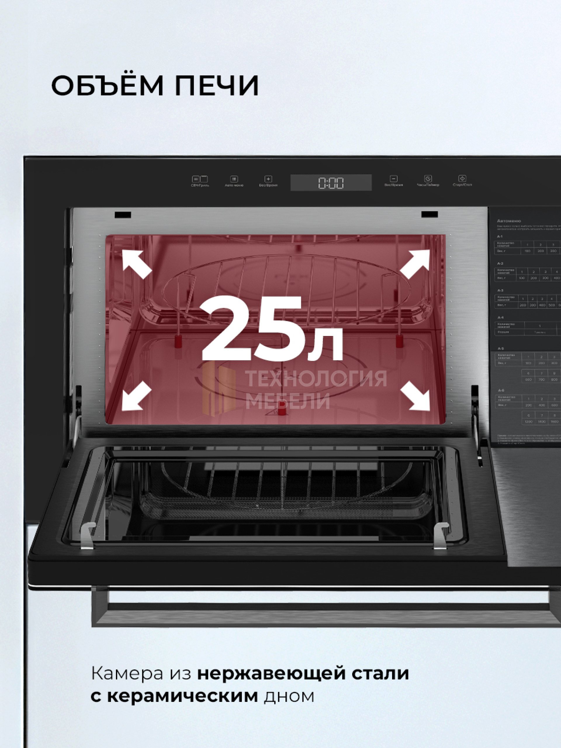 Дно, покрытое керамическим слоем, позволяет волнам распределяться равномерно, обрабатывать продукты со всех сторон. Отсутствие столика даёт возможность использовать вместительную посуду и противни , квадратные и прямоугольные тарелки при объеме камеры приготовления 25 литров.