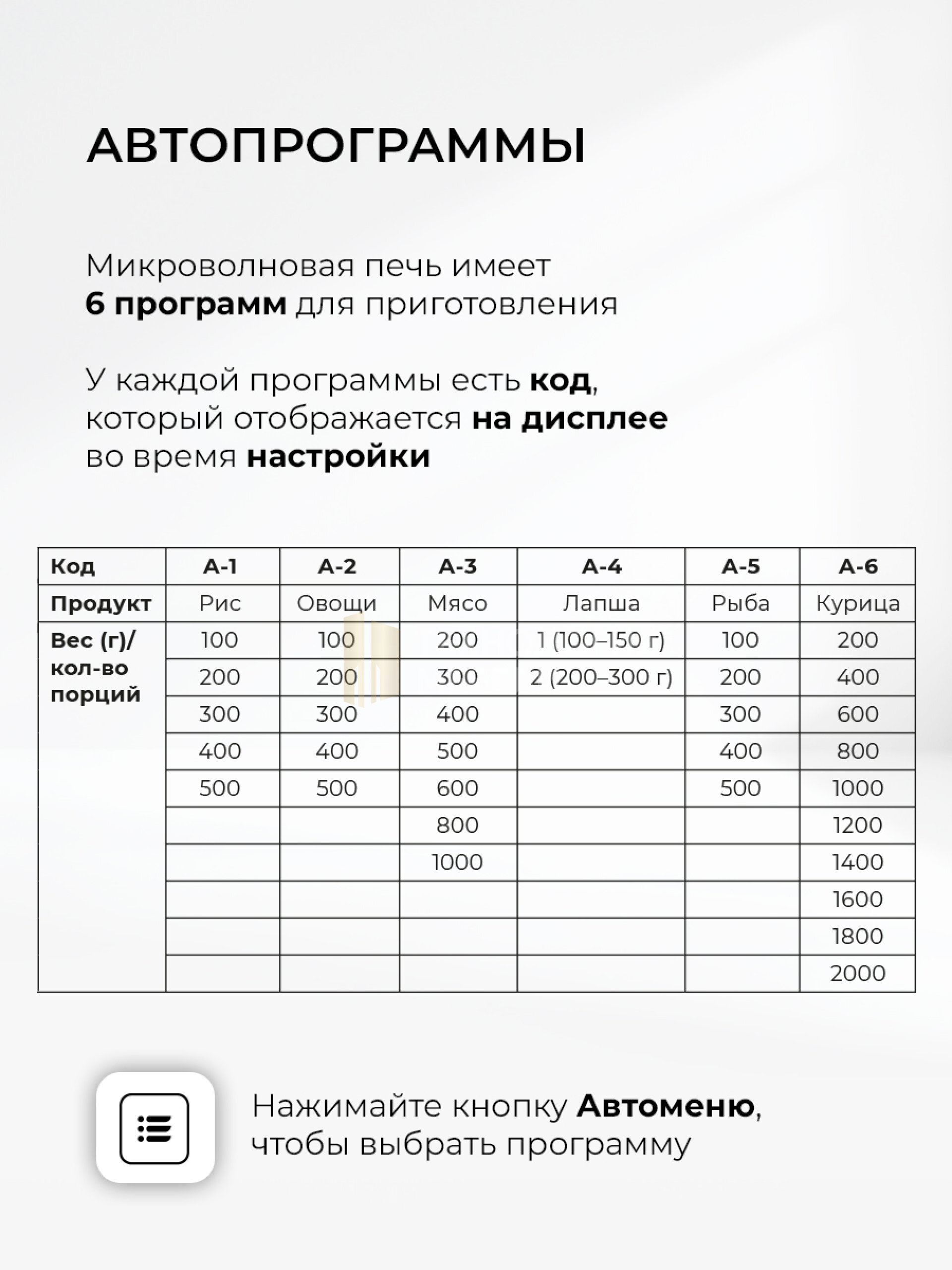В распоряжении пользователя 6 автопрограмм, которые сделают приготовление разнообразных блюд простым и быстрым. Также вы можете готовить на гриле мощностью 1200Вт, разогревать и размораживать продукты.