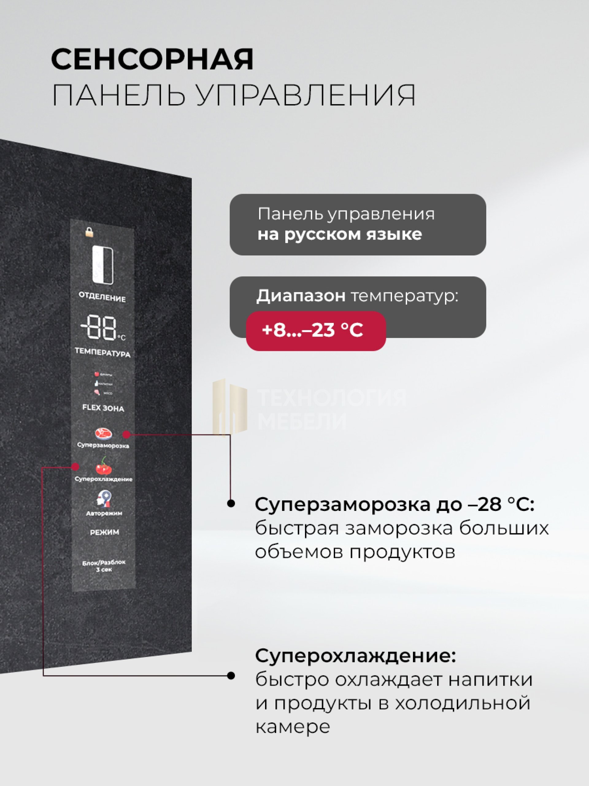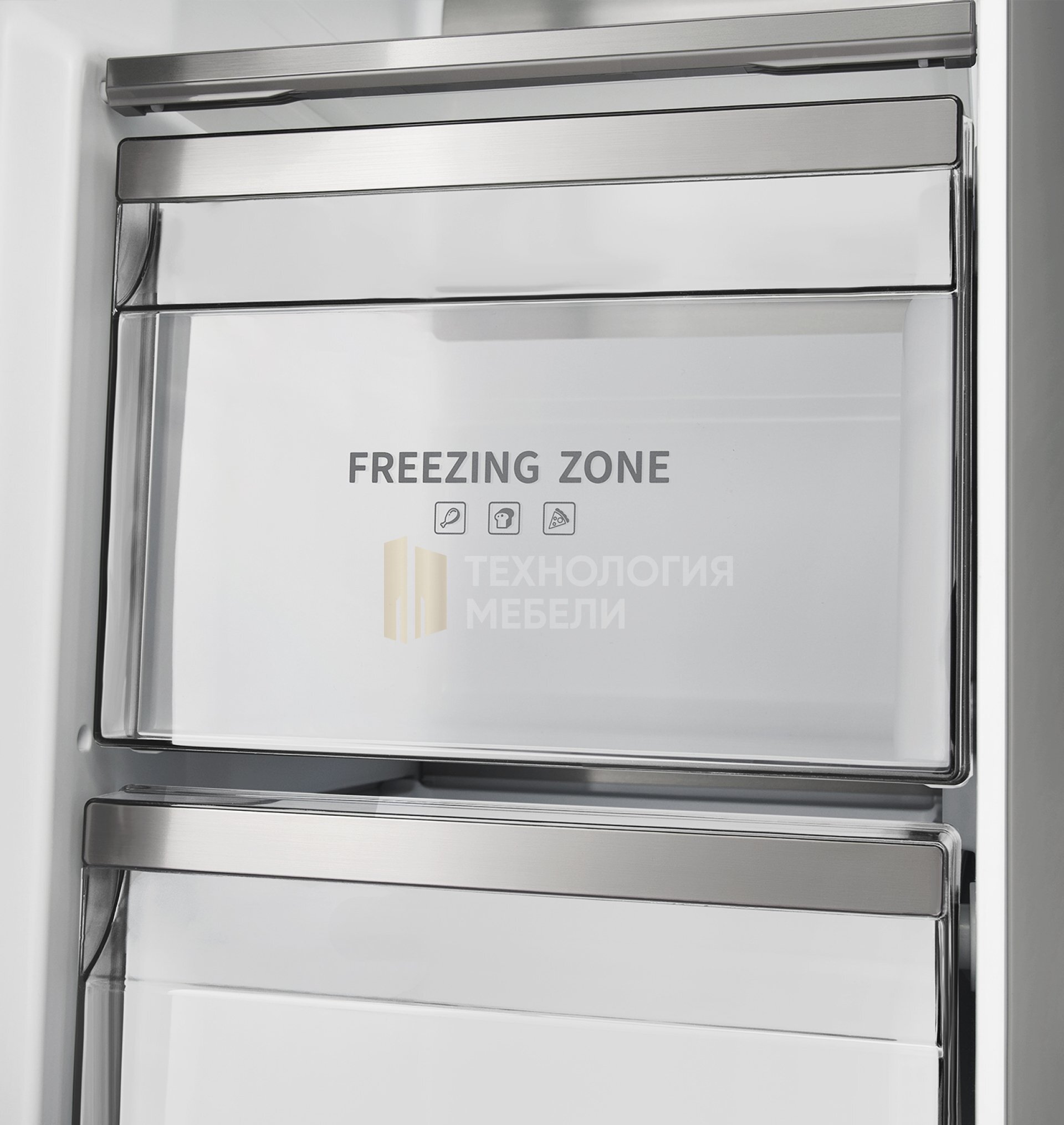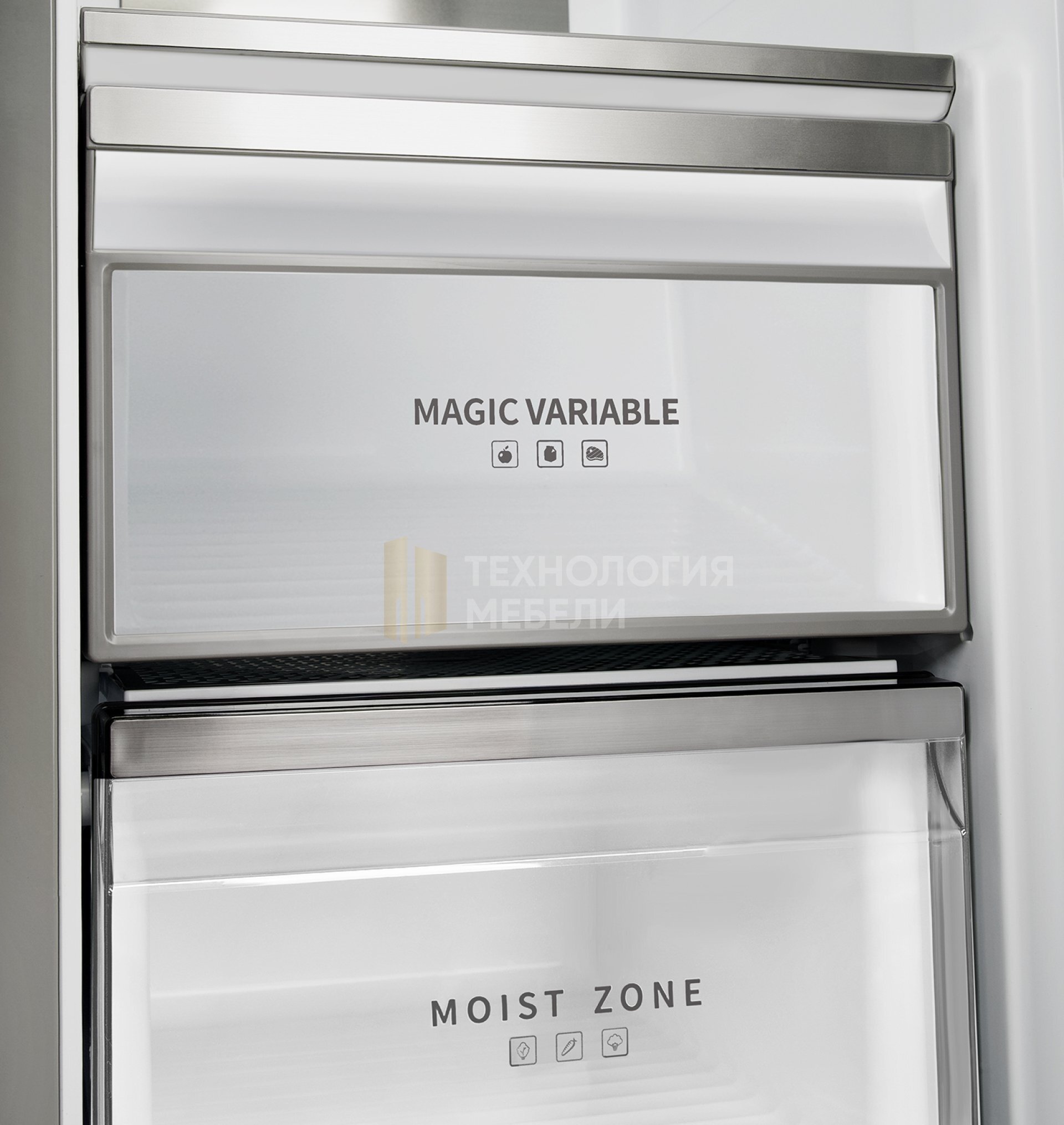 LED-лампы обеспечивают яркий свет, помогая вам быстро найти все, что нужно. Электронная панель управления с цветным дисплеем делает настройку параметров интуитивно понятной. А зоны с отдельной регулировкой влажности и температуры позволяют подобрать условия хранения под конкретный продукт.
