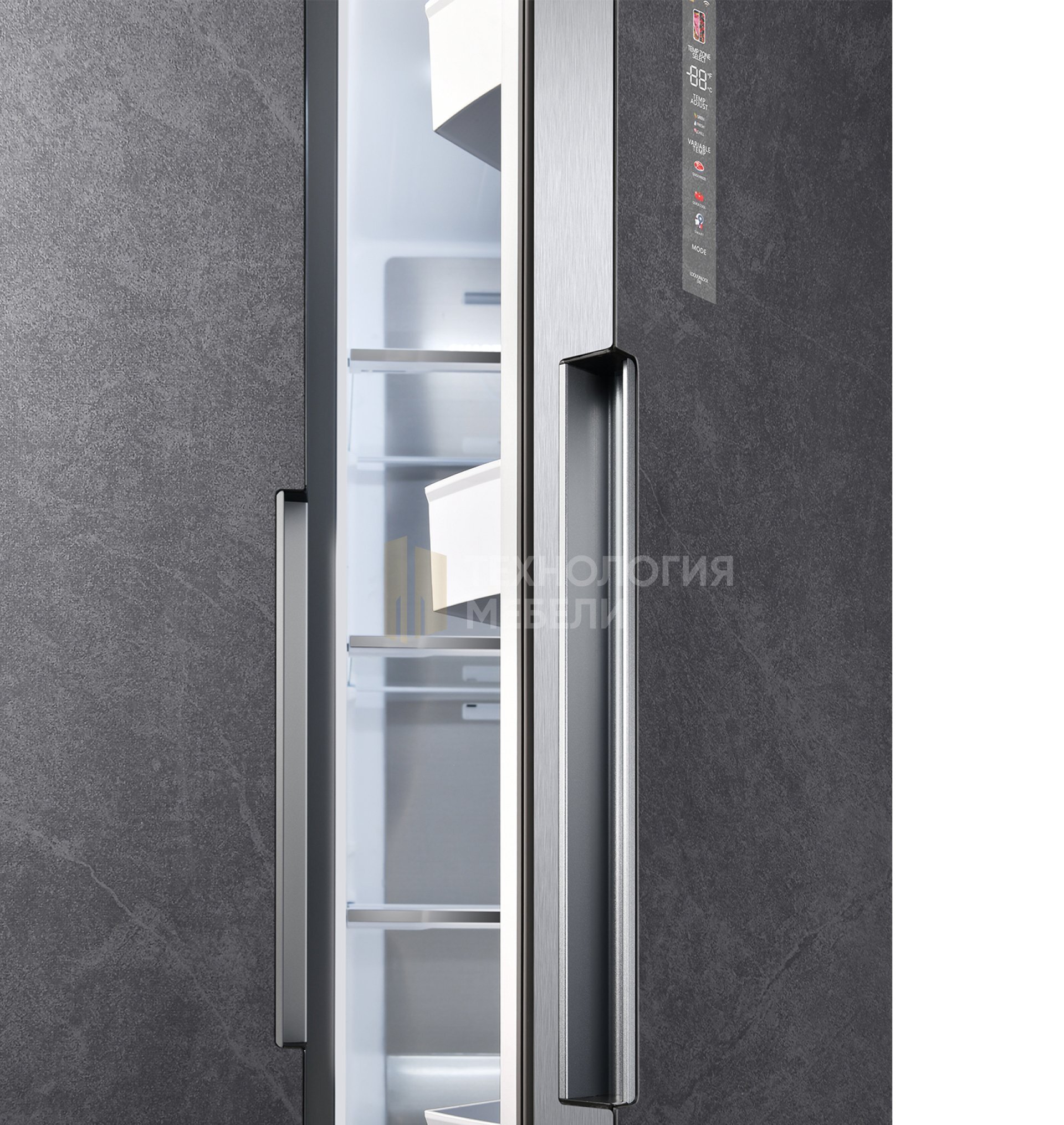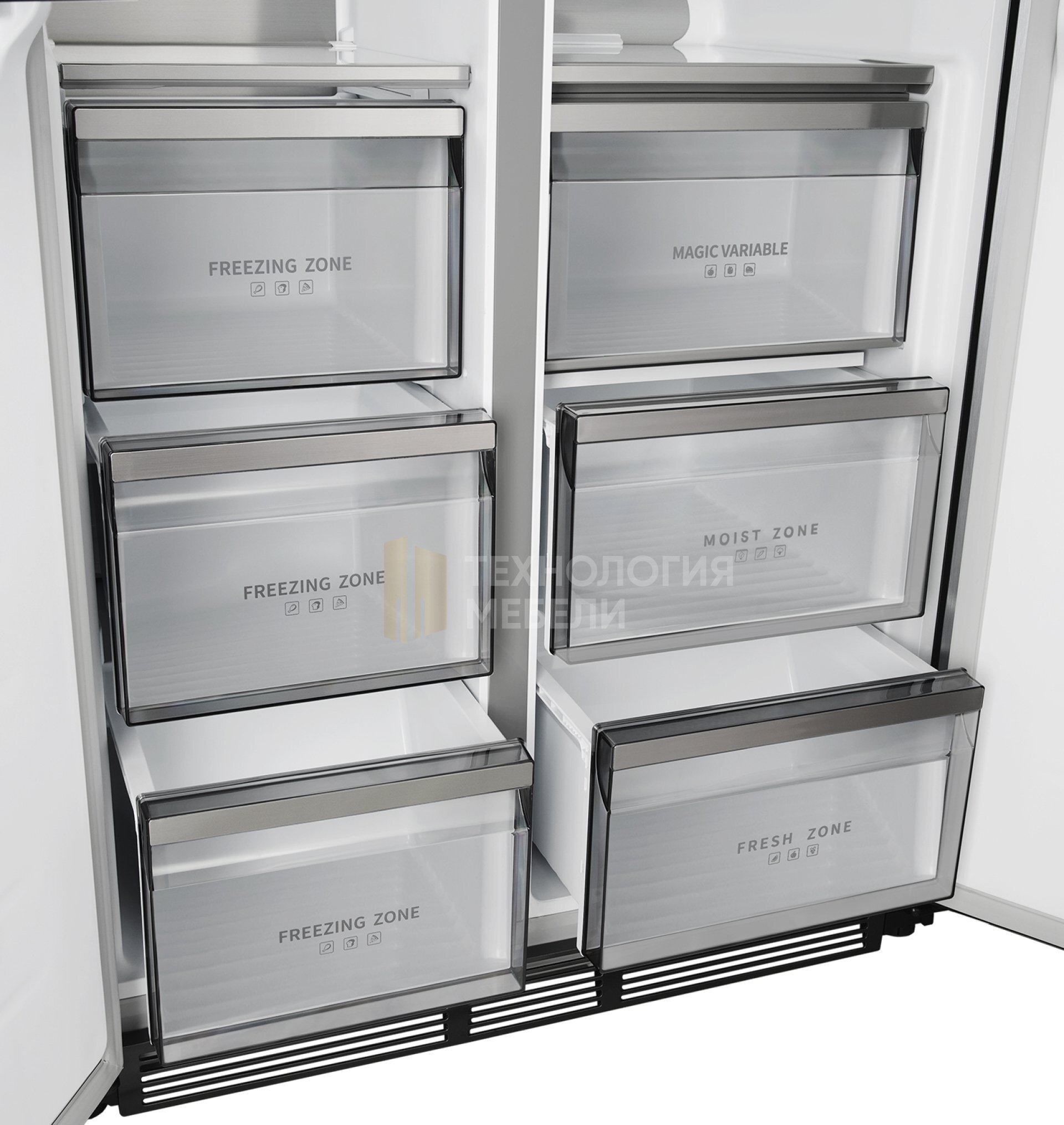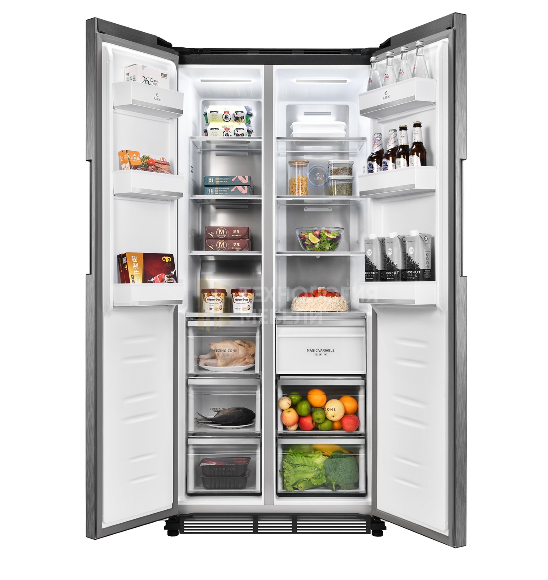 Два отделения общим объемом 436 литров и конструкция Side by Side дают возможность хранить все блюда и напитки на удобном уровне. Внутреннее пространство холодильника организовано максимально эффективно благодаря регулируемым полкам и ящикам в обеих камерах.