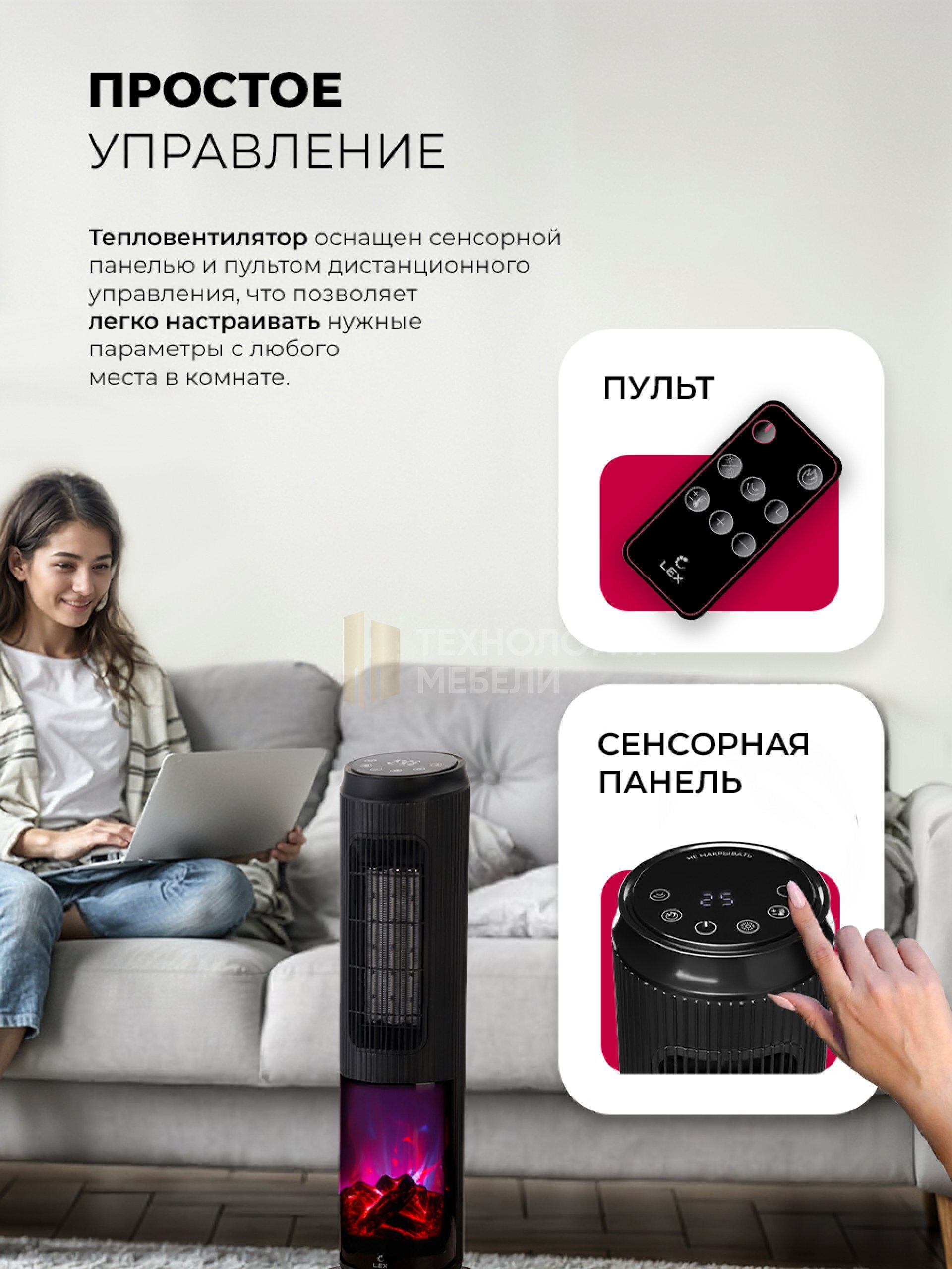 Компактные размеры (640 х 200 х 200 мм) и встроенная ручка облегчают перемещение. Поворотный механизм на 70° обеспечивает равномерный обогрев помещения. LED-дисплей отображает текущие настройки работы, делая управление устройством максимально удобным. Прибор оснащен сенсорной панелью и пультом дистанционного управления.