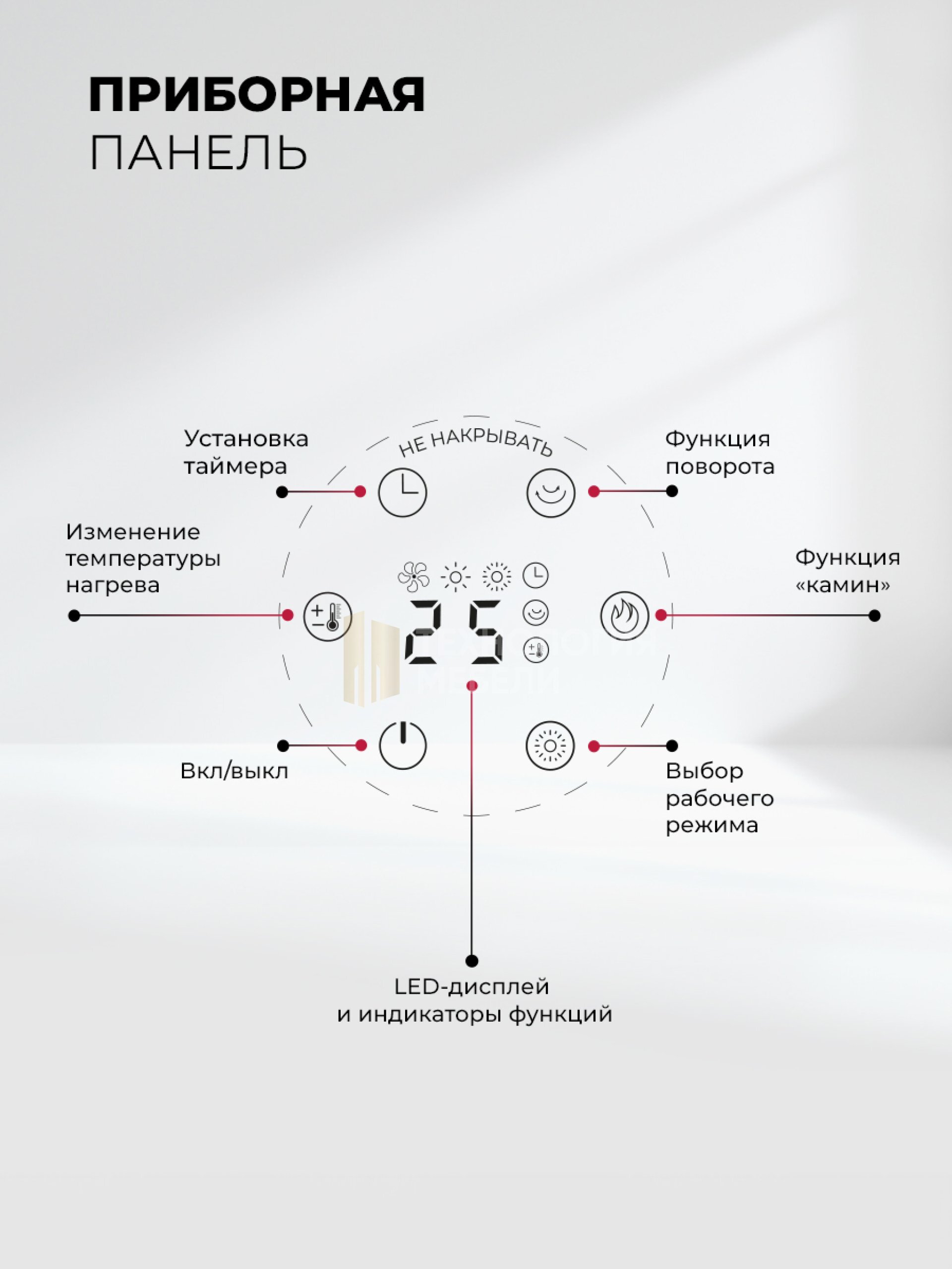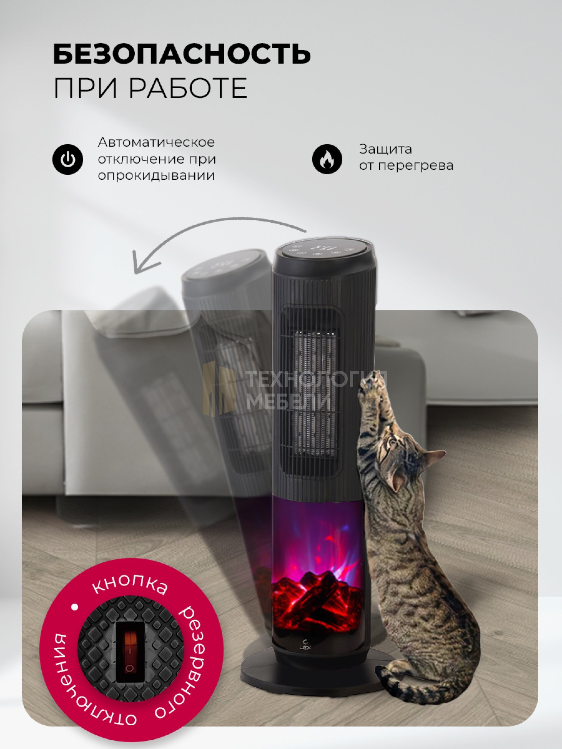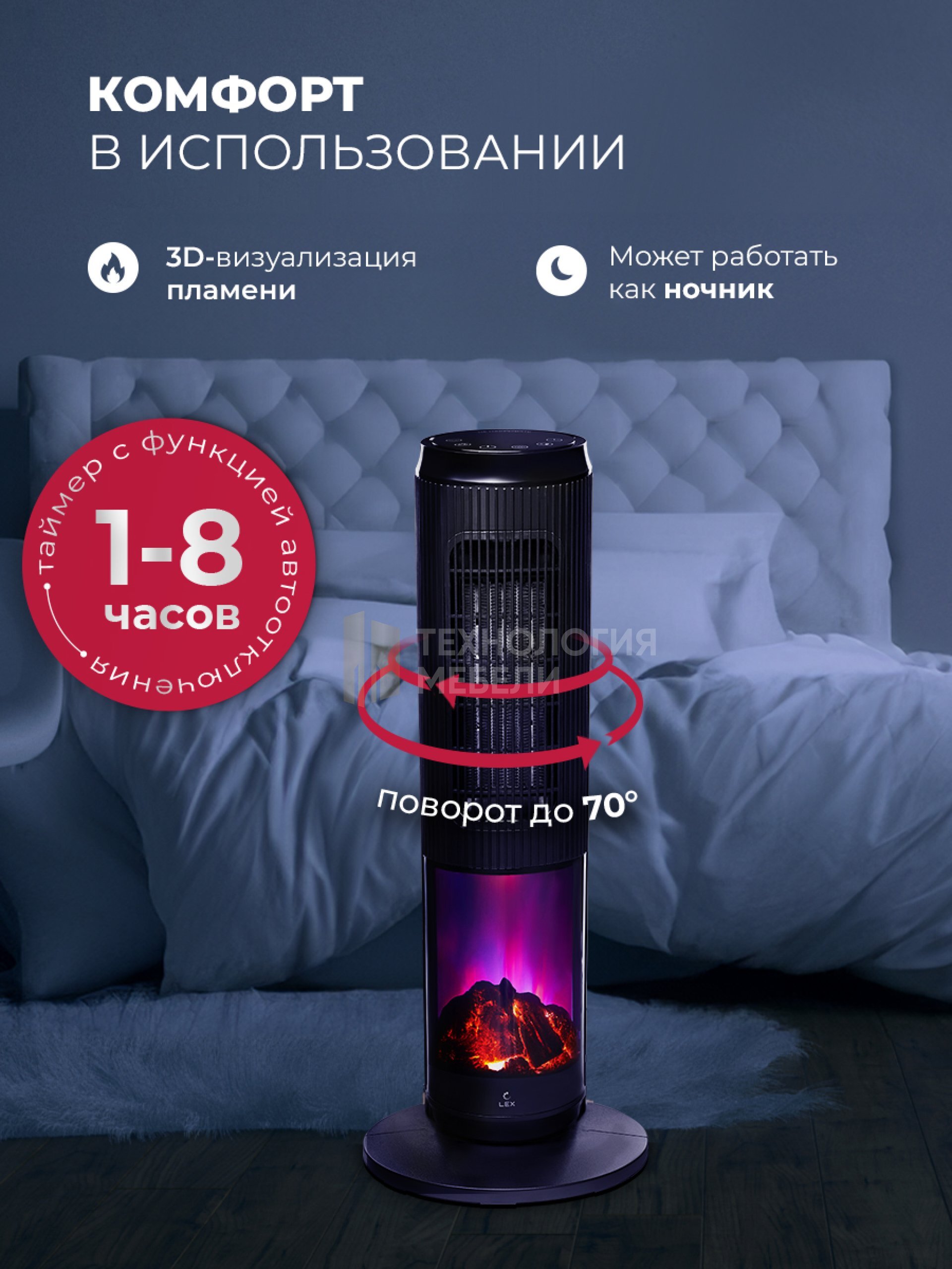 Встроенный термостат автоматически поддерживает стабильную температуру. Таймер позволяет настроить работу устройства от 1 до 8 часов. Устройство оснащено защитой от перегрева и автоматическим отключением при опрокидывании, м поэтому он безопасен для использования, особенно в помещениях с детьми или домашними животными.
